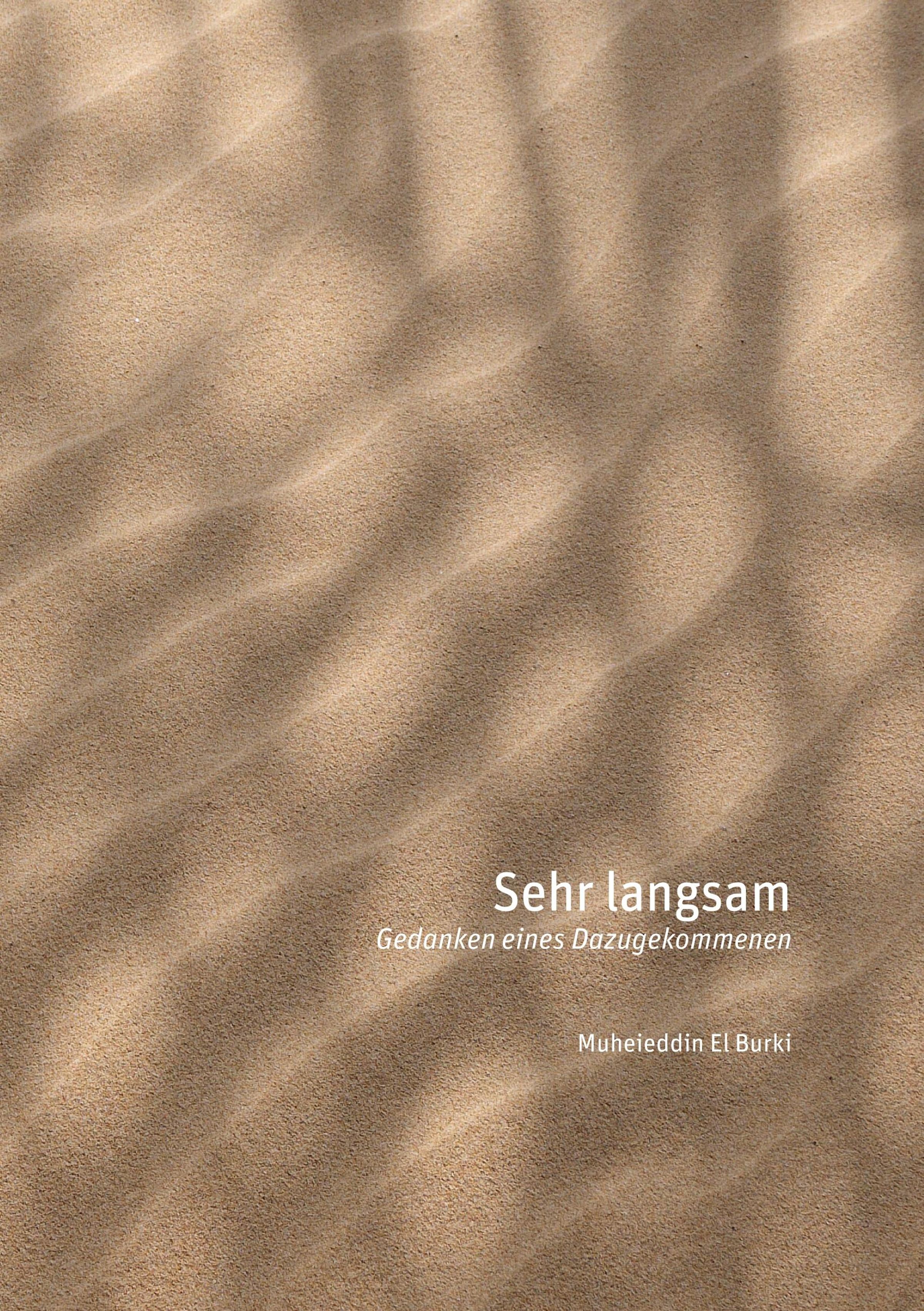 "Sehr langsam. Gedanken eines Dazugekommenen. Muheieddin El Burki." Sandoberfläche mit welligen Mustern., Buch