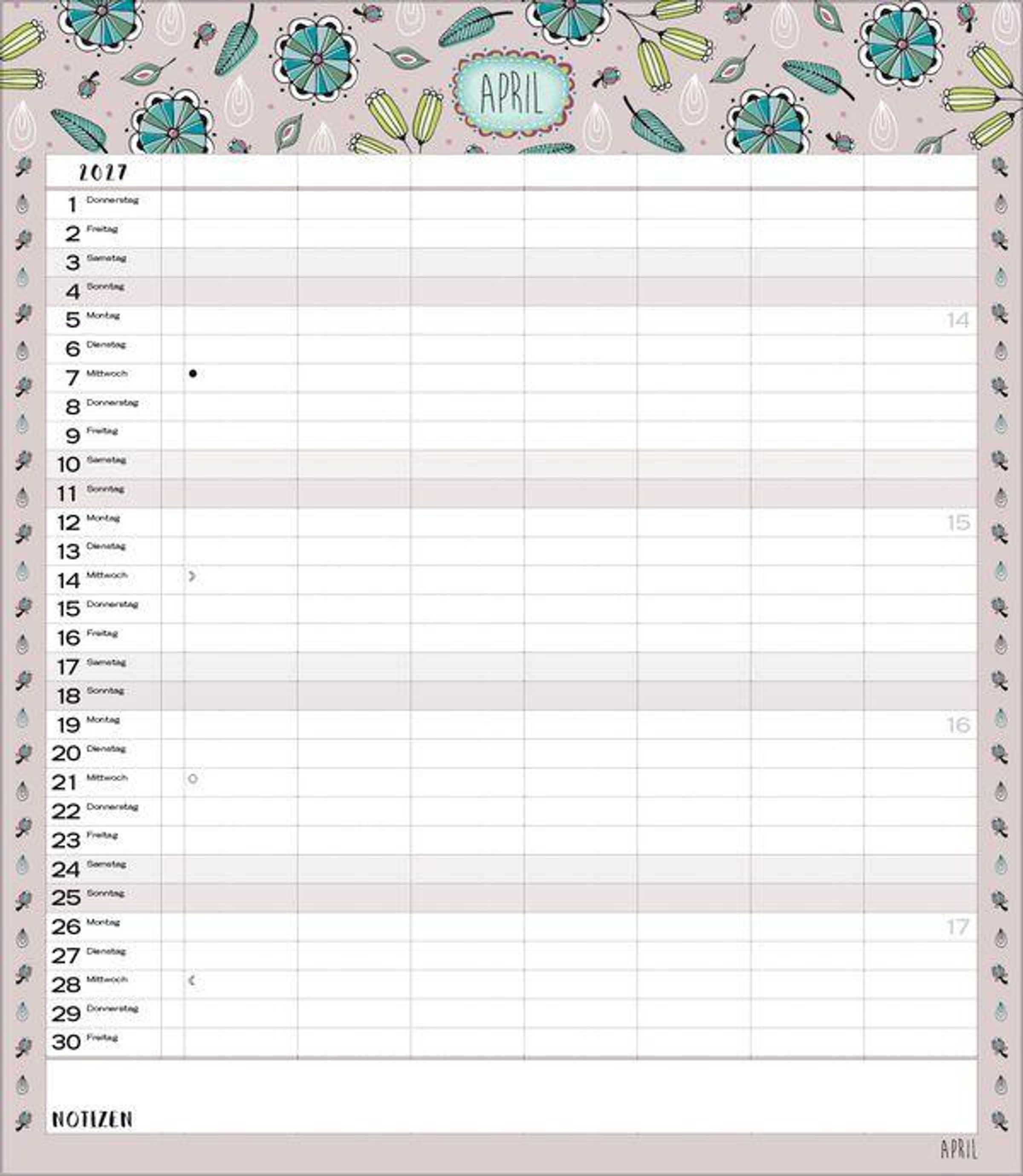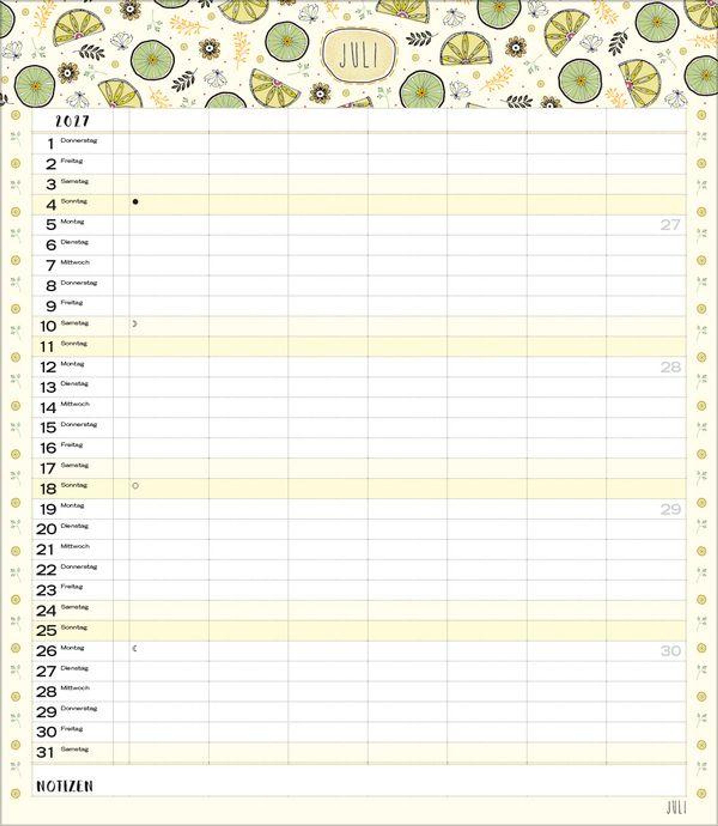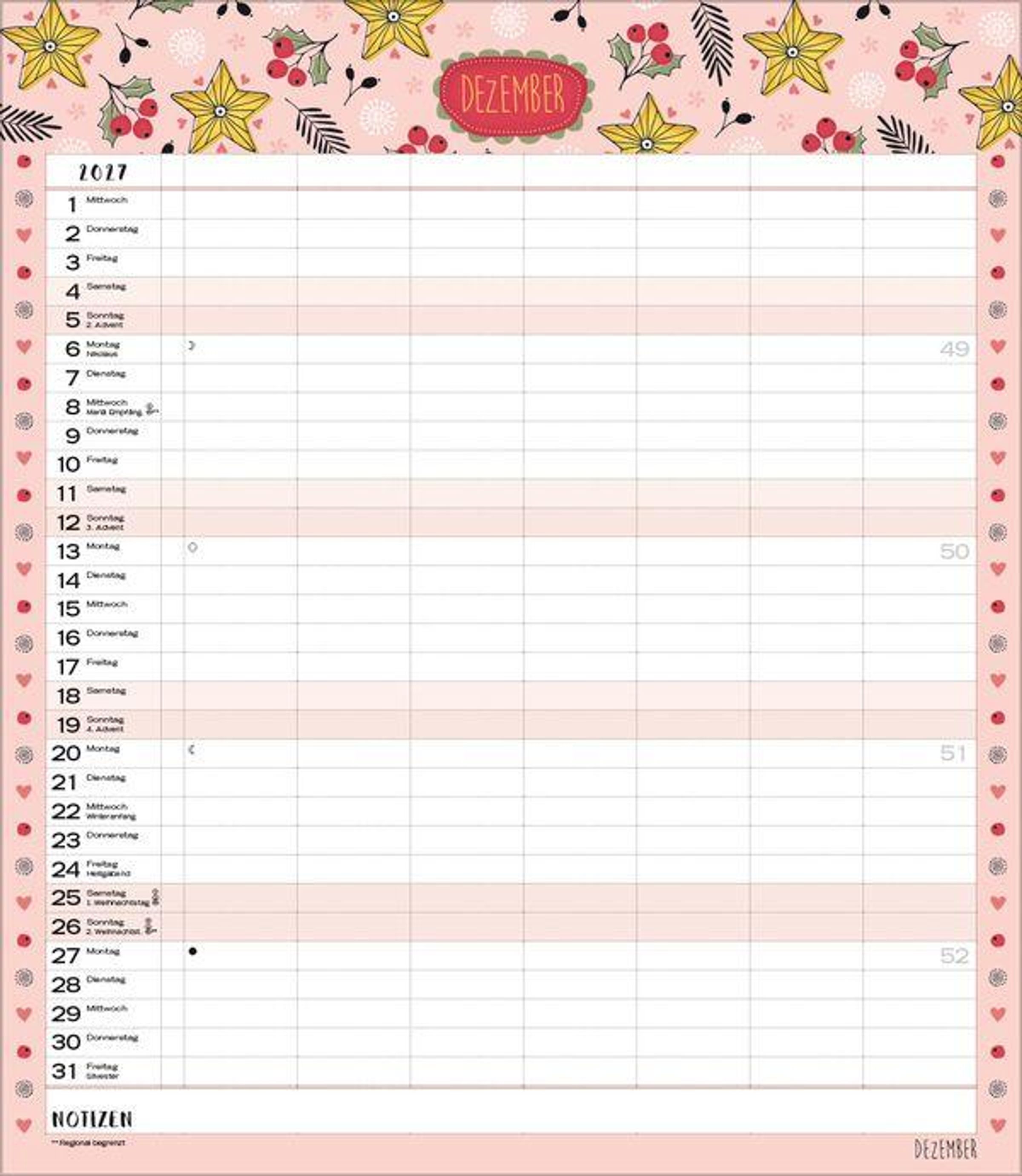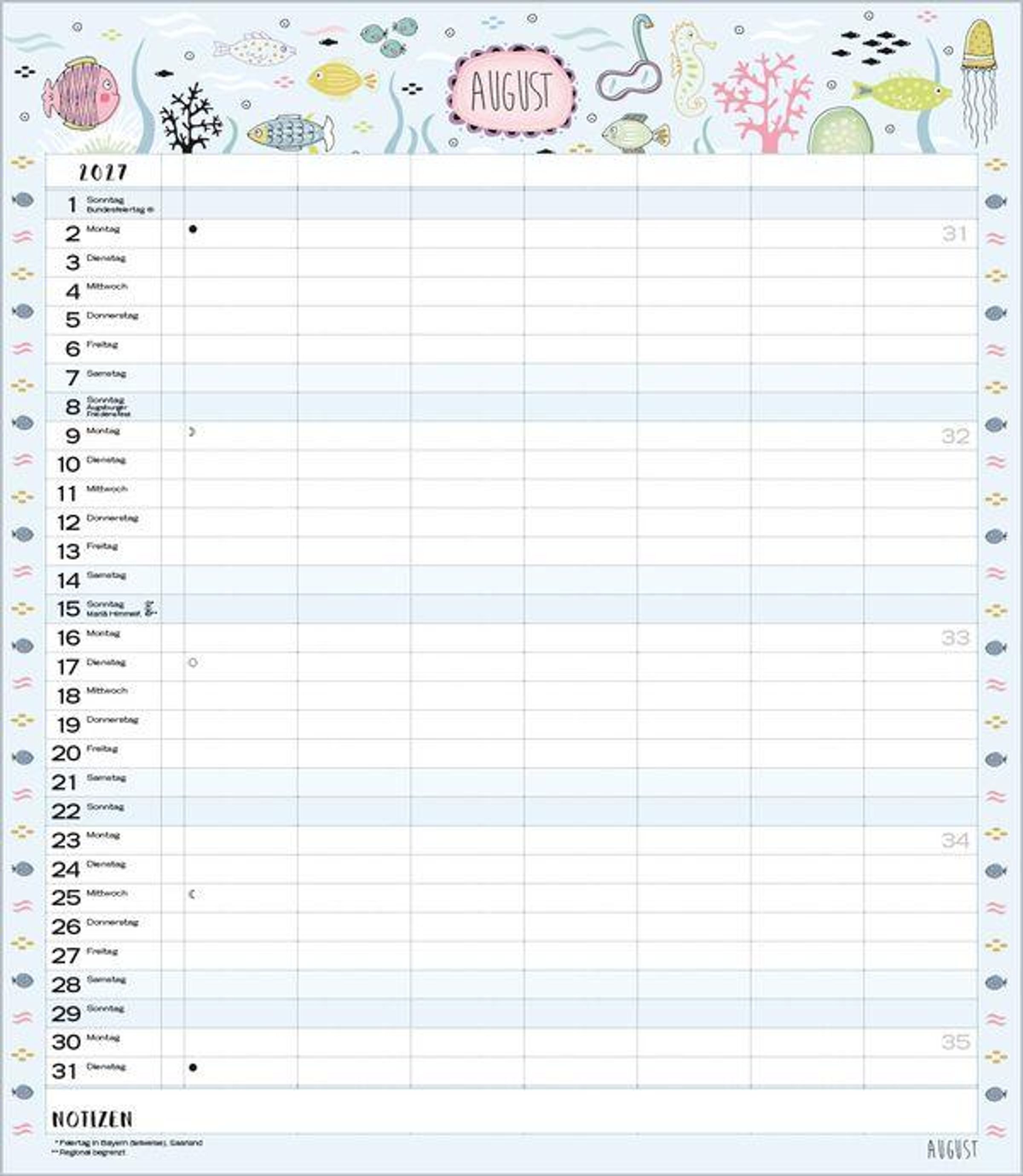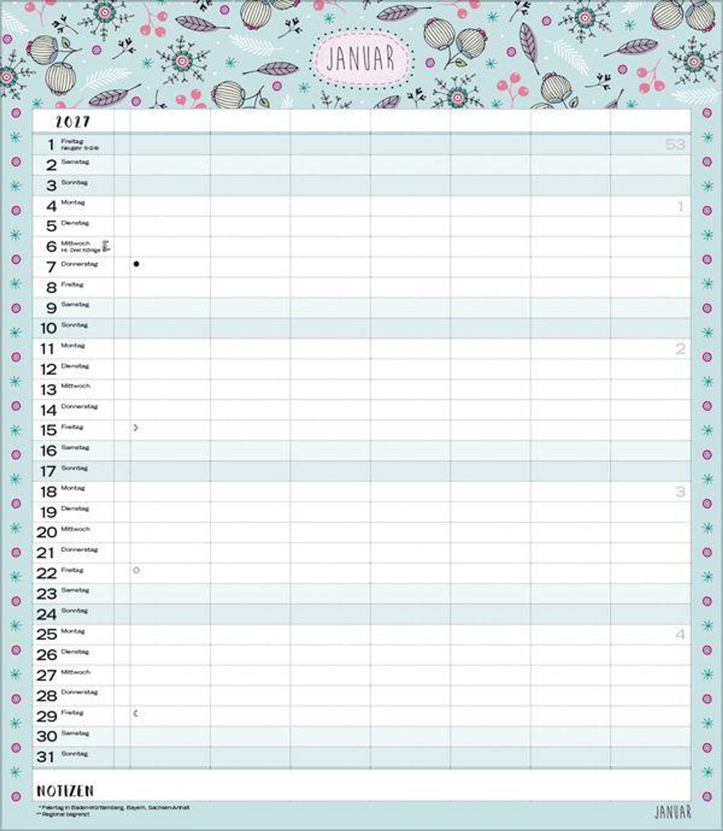 - Familienplaner, 7 breite Spalten. Großer Familienkalender mit Ferienterminen, extra Spalte, Vorschau bis März 2027 und Datumsschieber. Format: 40x46 cm