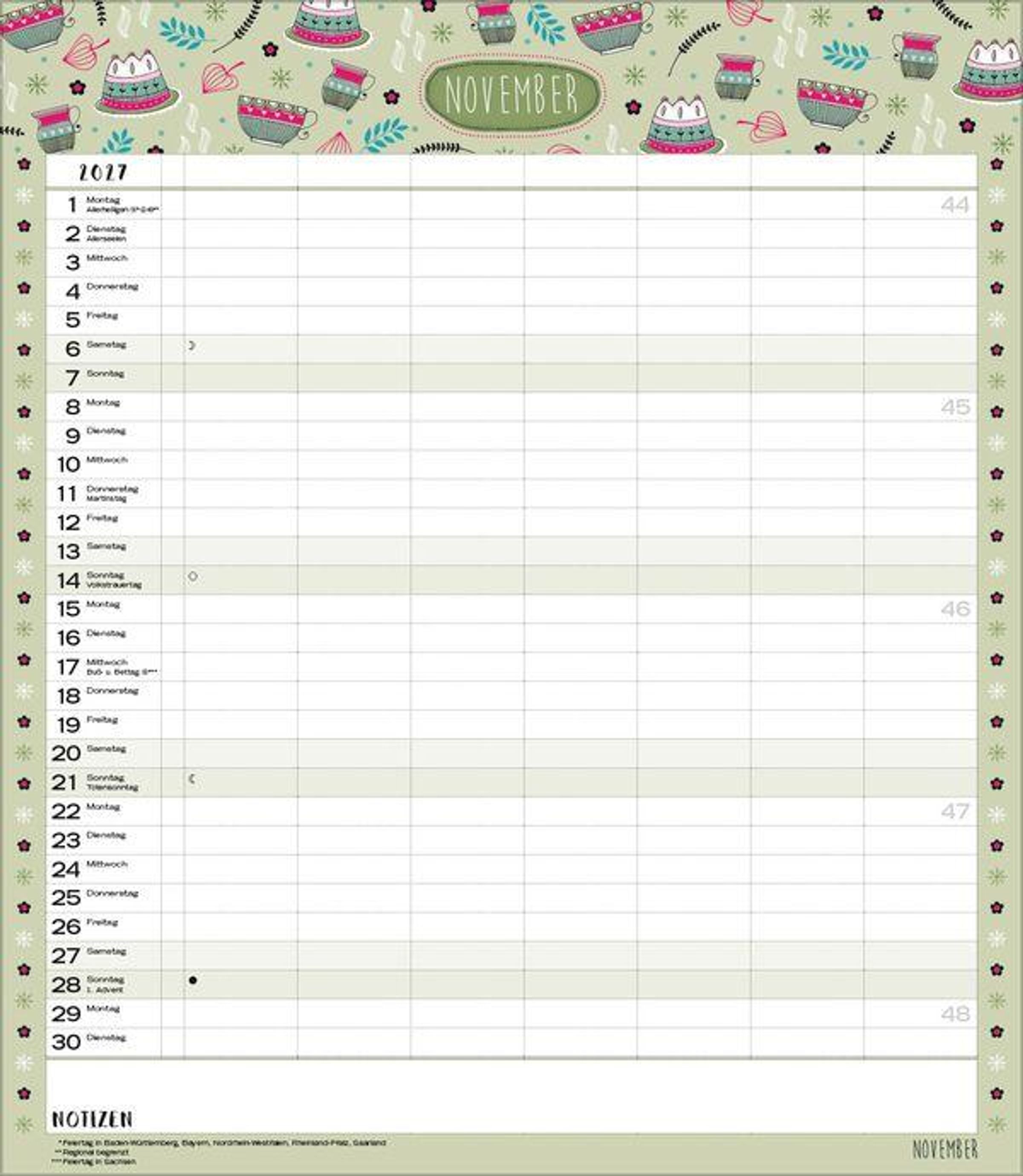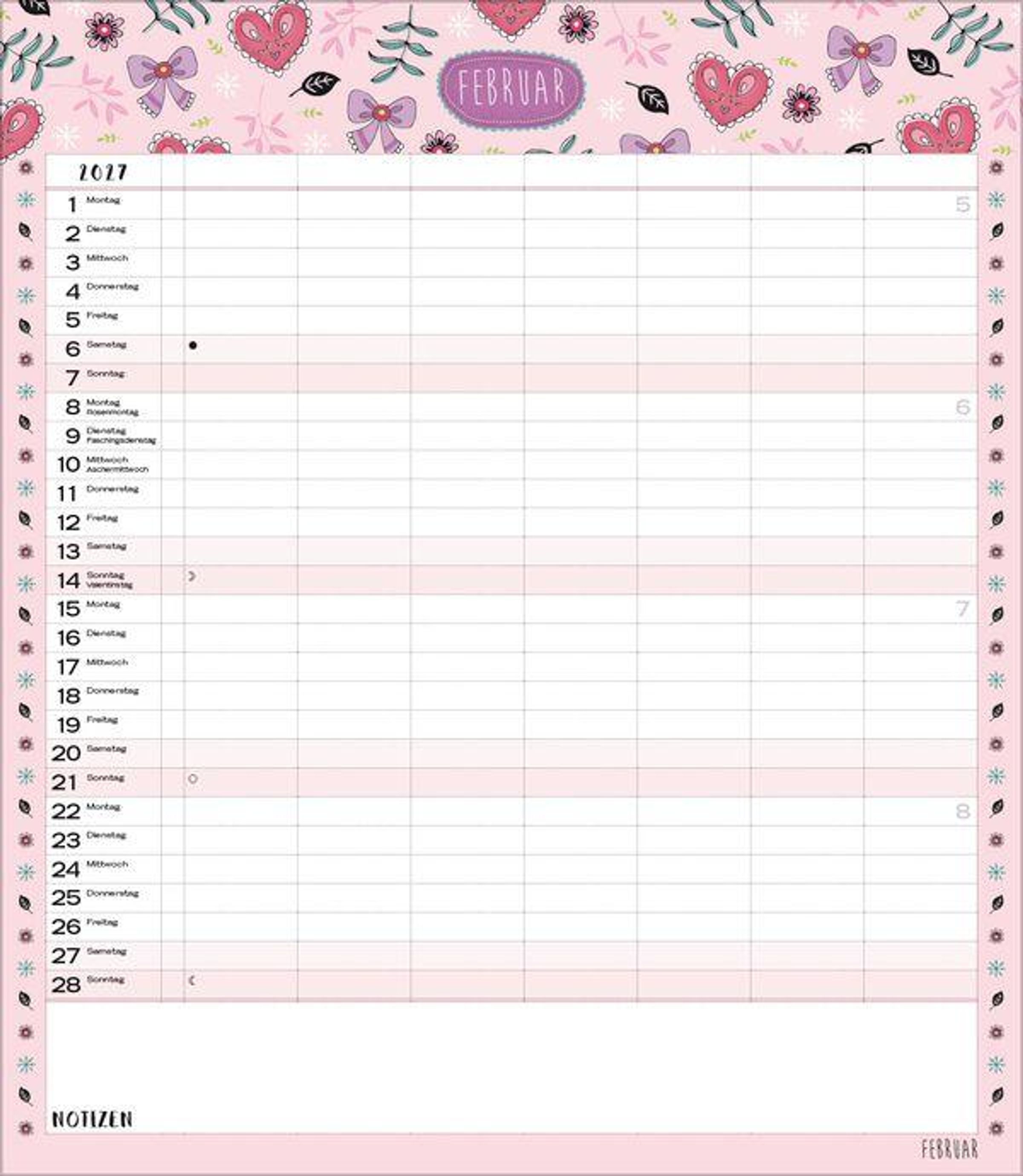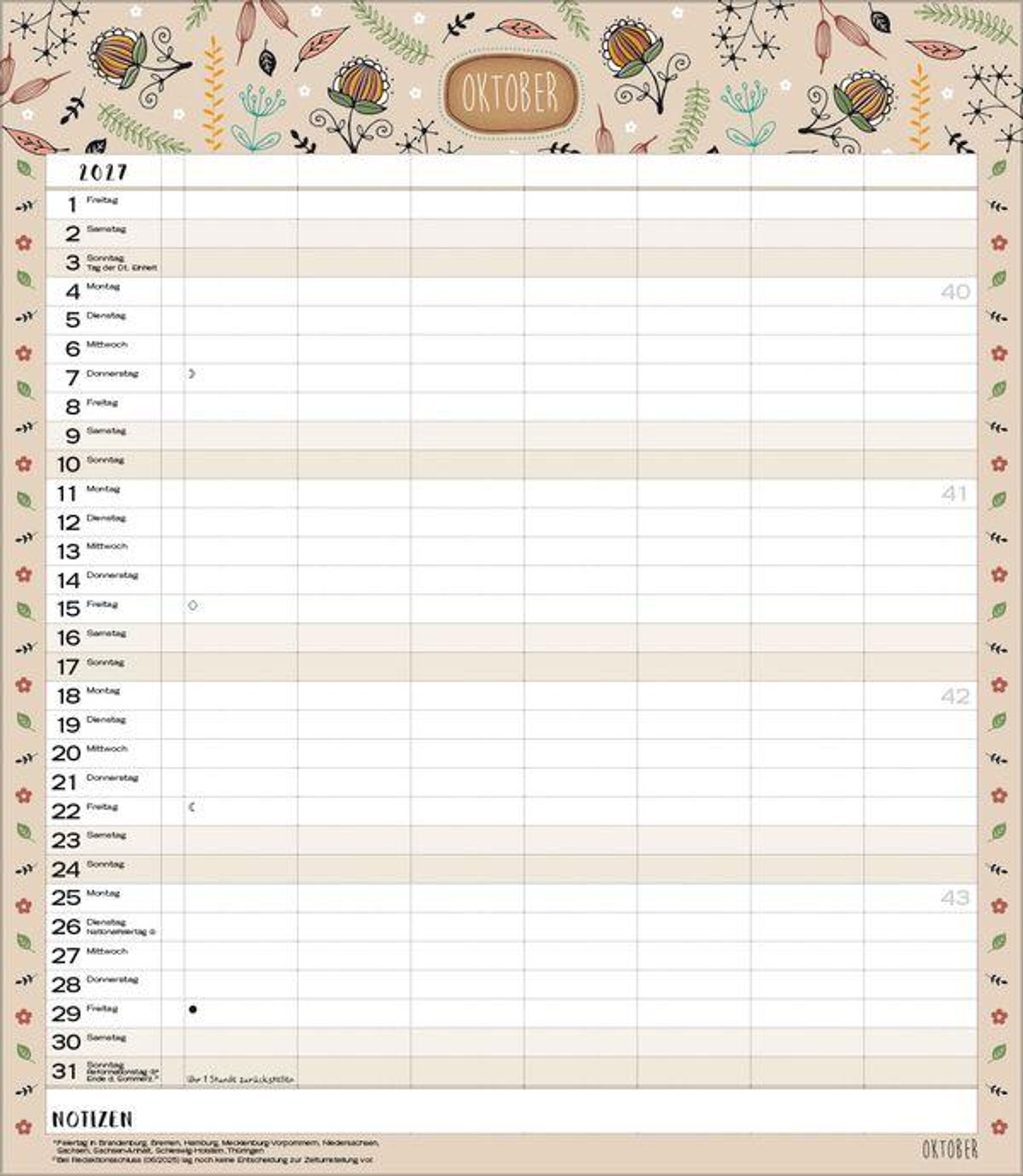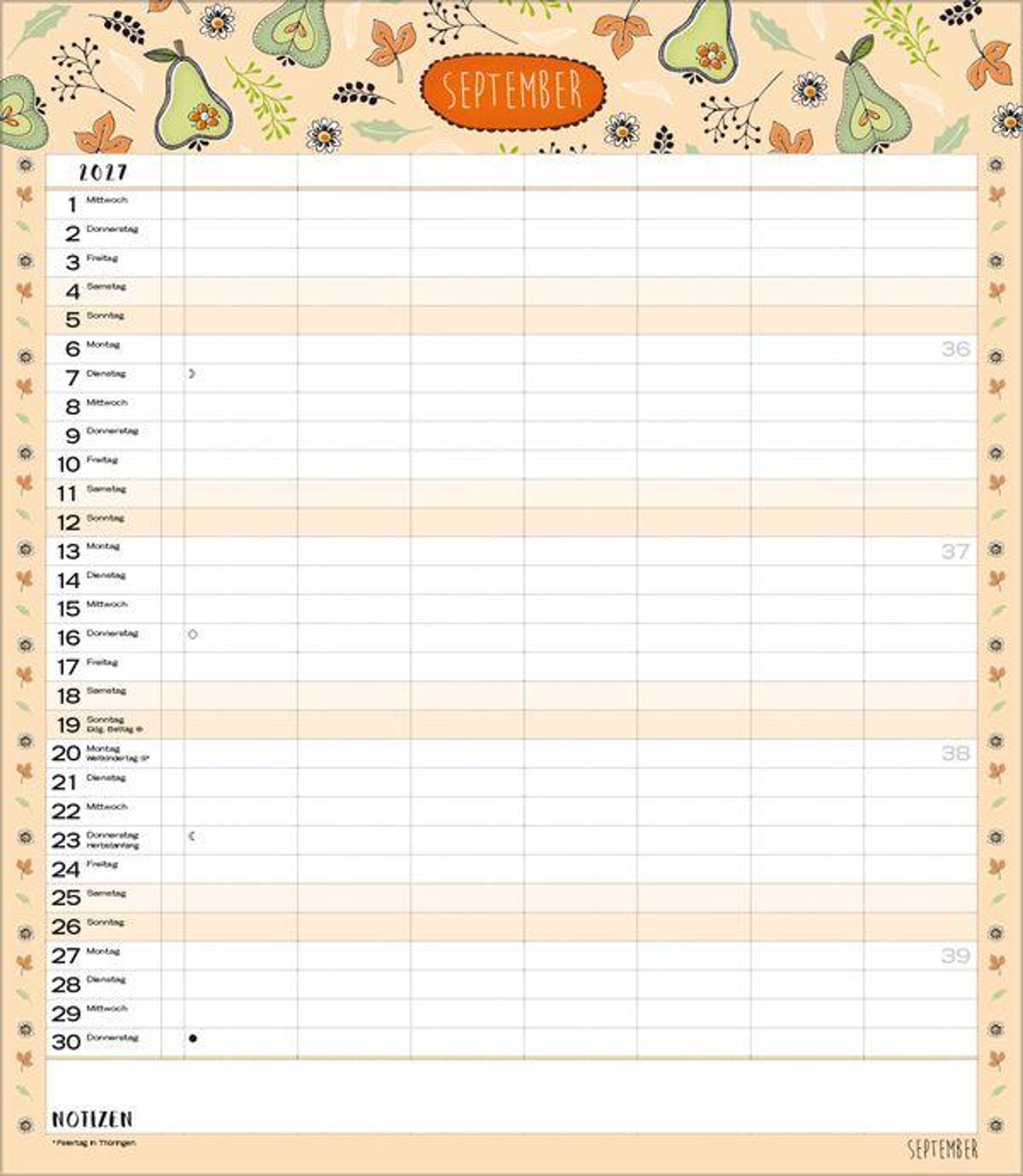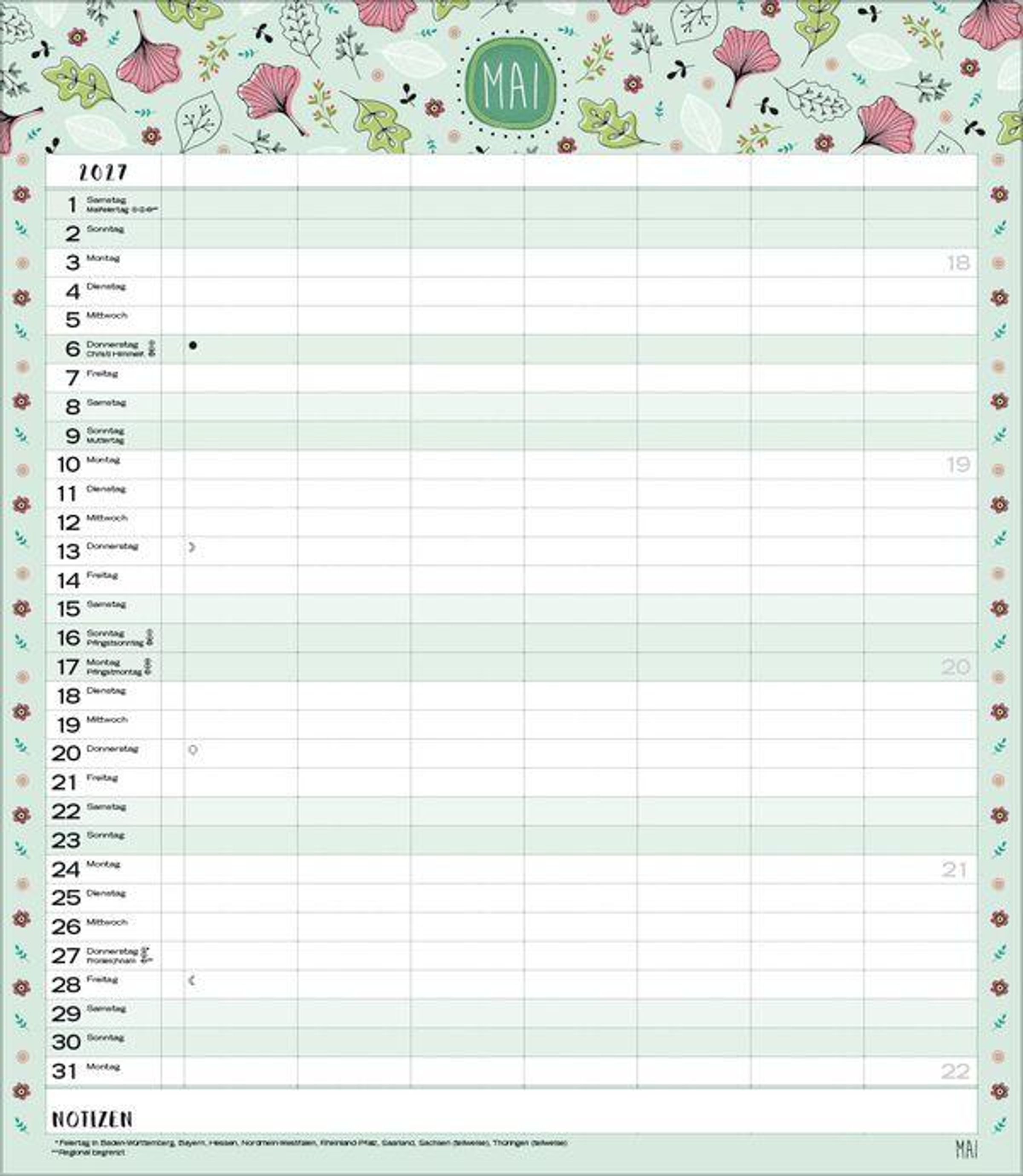 - Familienplaner, 7 breite Spalten. Großer Familienkalender mit Ferienterminen, extra Spalte, Vorschau bis März 2027 und Datumsschieber. Format: 40x46 cm