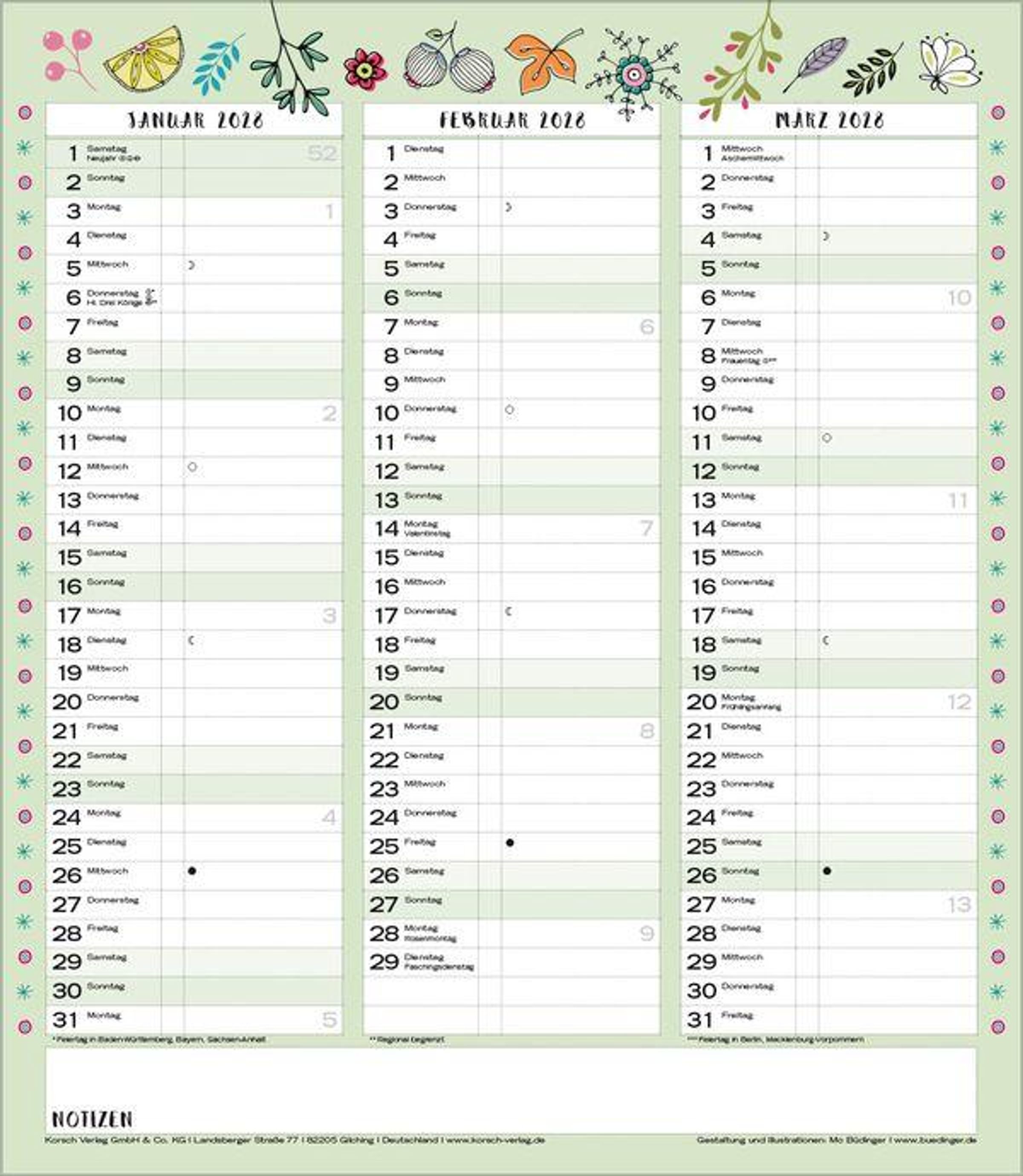 Weitere Informationen wie Mondphasen , Ferientermine und Feiertage (auch regionale) sowie deutlich lesbare Kalenderwochen runden den Kalender ab und sorgen für einen vollständigen Überblick Ihres Jahres.