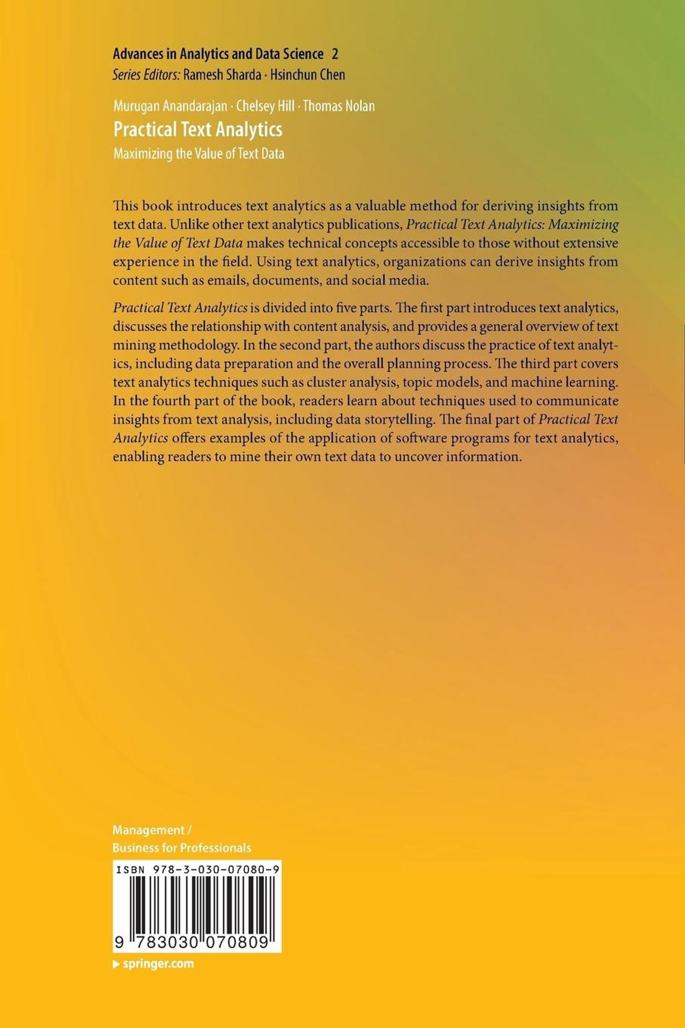 Offers an easy-to-follow introduction to text analytics in business and management Helps business practitioners increase their accessibility of information available in unstructured text data without requiring extensive coding experience or knowledge in the area Includes real-world examples, in multiple programming languages including SAS, R, Statistica, Python and QDA Miner