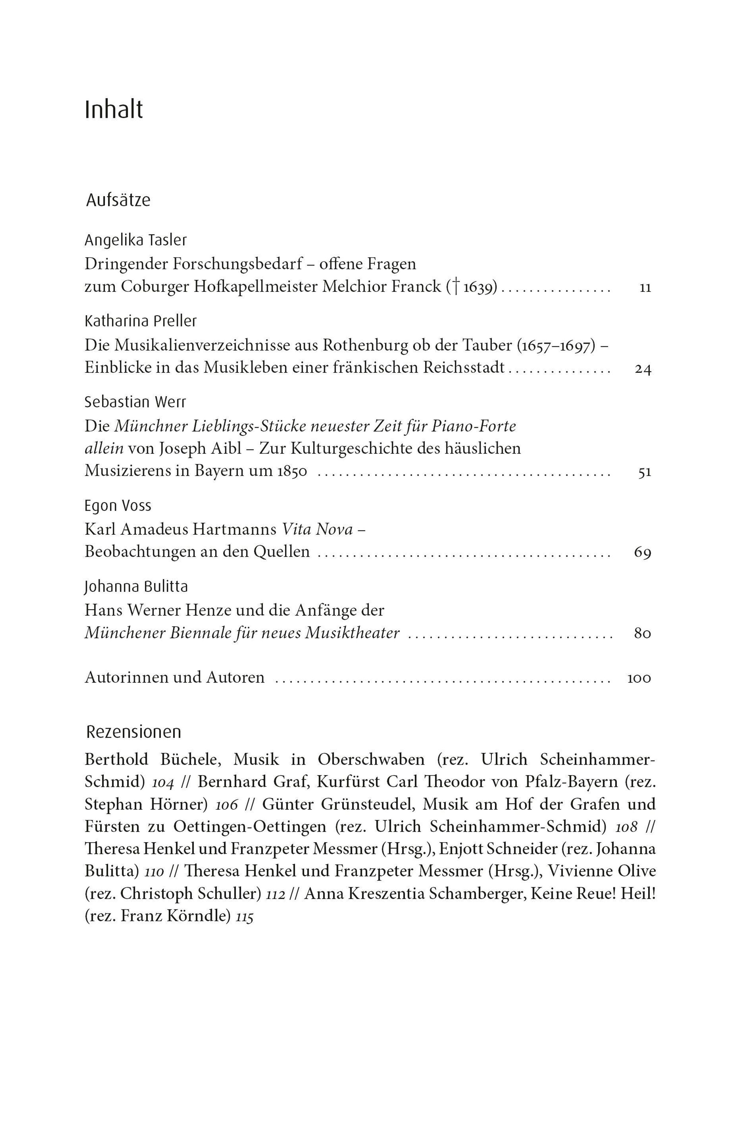Aus dem Inhalt: Angelika Tasler Dringender Forschungsbedarf - offene Fragen zum Coburger Hofkapellmeister Melchior Franck (¿ 1639) Katharina Preller Die Musikalienverzeichnisse aus Rothenburg ob der Tauber (1657-1697) - Einblicke in das Musikleben einer fränkischen Reichsstadt¿ Sebastian Werr Die Münchner Lieblings-Stücke neuester Zeit für Piano-Forte allein von Joseph Aibl - Zur Kulturgeschichte des häuslichen Musizierens in Bayern um 1850¿ Egon Voss Karl Amadeus Hartmanns Vita Nova - Beobachtungen an den Quellen¿ Johanna Bulitta Hans Werner Henze und die Anfänge der Münchener Biennale für neues Musiktheater