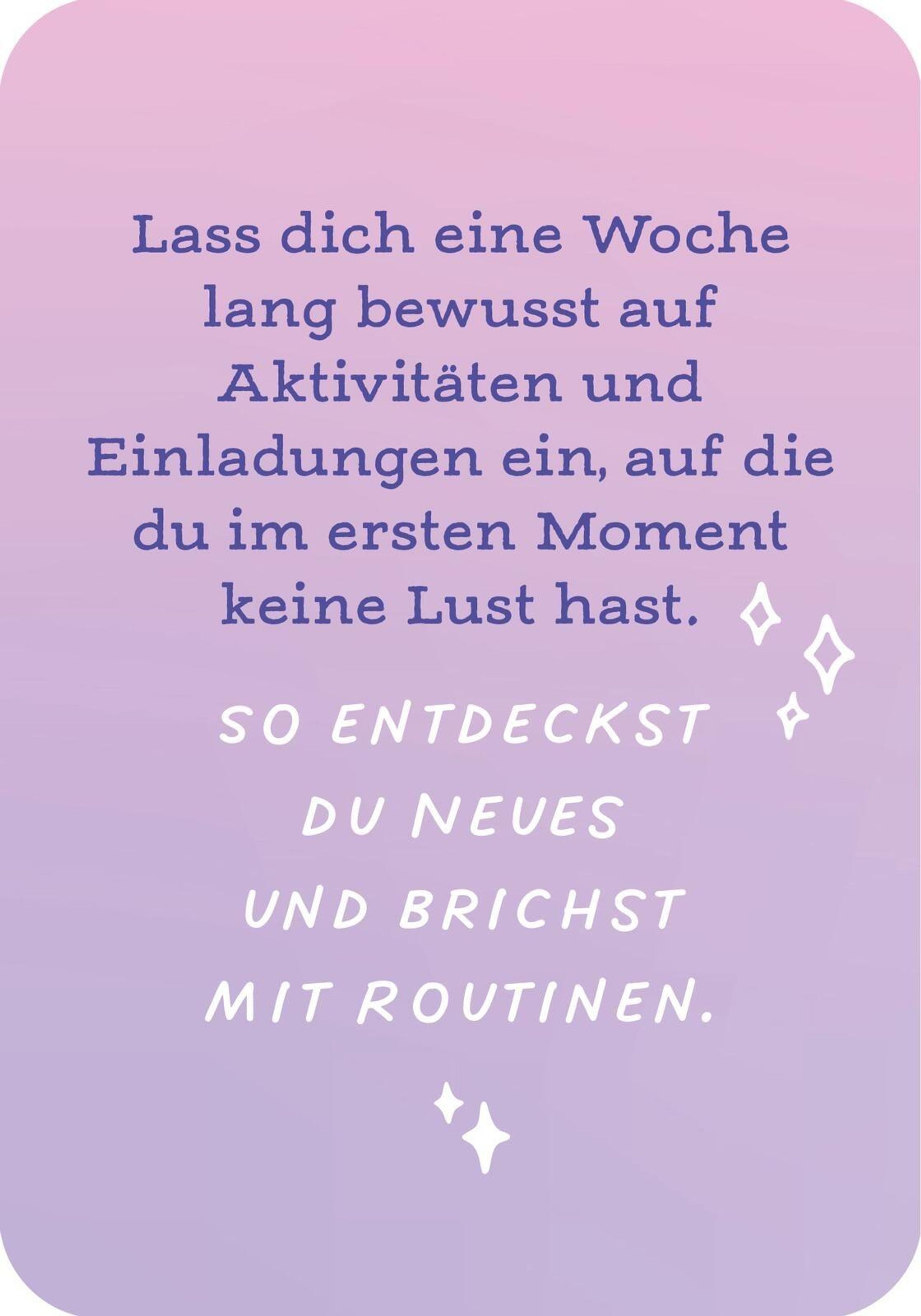 Mit dieser Kartenbox wird Mut zu deinem täglichen Begleiter. Entdecke, wie viel Kraft in dir steckt, und lass dich dazu inspirieren, deine Komfortzone zu verlassen - Tag für Tag ein bisschen mehr!