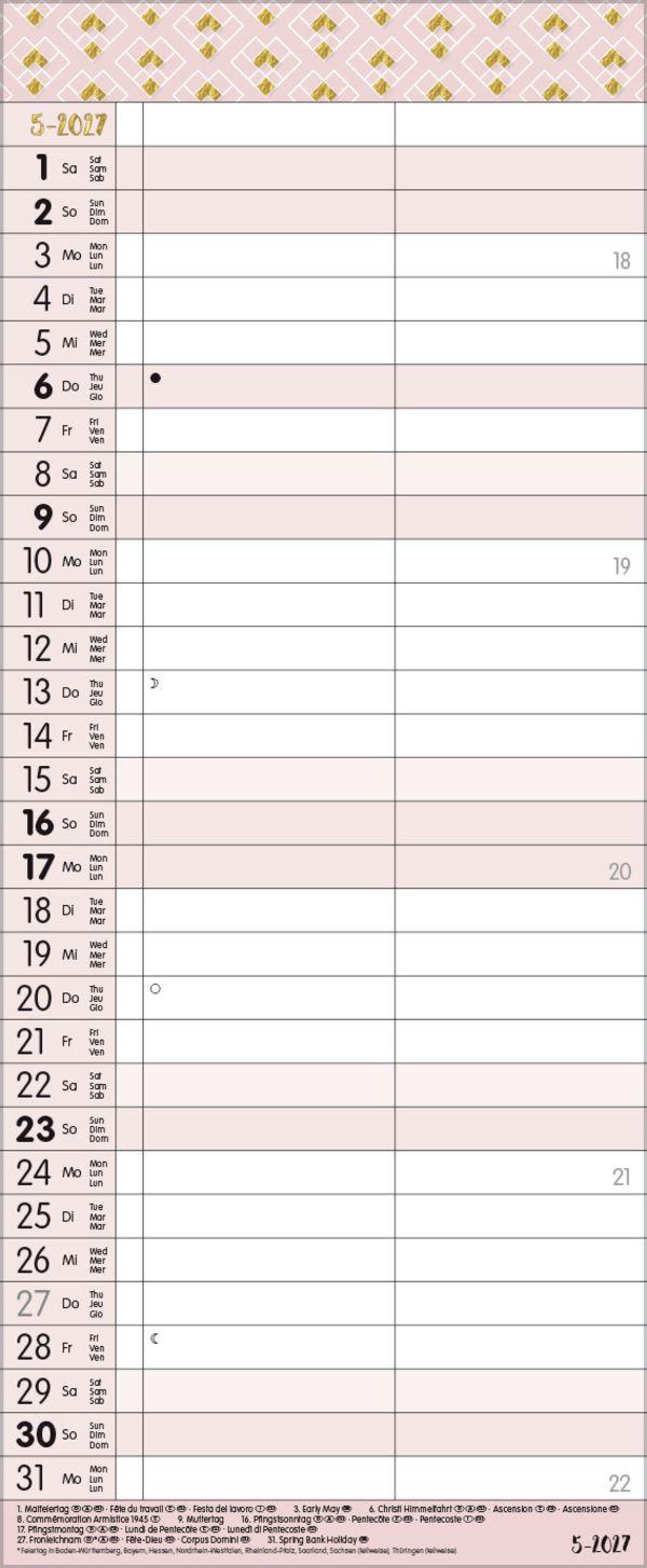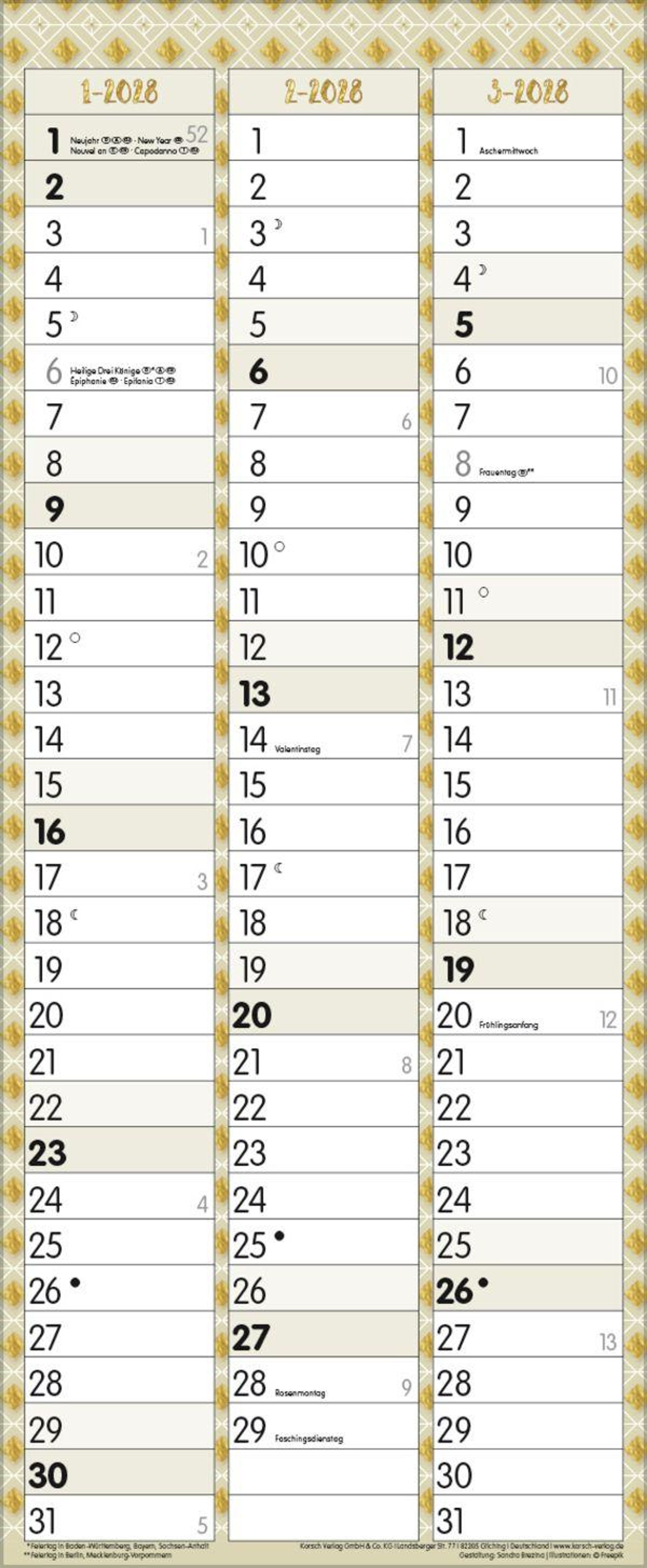 Korsch Familienkalender - Produktmerkmale Übersichtlicher Familienplaner für bis zu 2 Personen; sehr stabile Rückwand; 19 x 46 cm Terminkalender mit viel Platz für Eintragungen, ohne störende Bilder in den Spalten leichte Beschreibbarkeit, auch mit Bunt- und Bleistiften Mehrsprachiges Kalendarium (d, e,f, i) mit regionalen Feiertagen für Deutschland, Österreich und Schweiz Farblich hervorgehobene Sonn- und Feiertage, sowie Anzeige der Zeitumstellung Gedruckt auf dickem und umweltfreundlichem FSC Papier Korsch Familien - Jahreskalender Bringen Sie etwas Glamour in Ihren Alltag! Zarte Pastelltöne und edles Schwarz treffen auf geometrische Trendmuster, Typoart und Grafiken im Goldglitter-Look. Setzen Sie Ihre Termine glamourös in Szene und profitieren Sie zugleich von der hohen Funktionalität eines modernen Terminplaners. Dieser Wandkalender hilft Ihnen dabei alle wichtigen Termine stets im Blick zu haben. Mit zwei Spalten zum Eintragen von Geburtstagen, Terminen und Erinnerungen bietet dieser Jahreskalender viel Platz für Notizen. Dadurch ist es auch möglich mehrere Termine in einen Tag zu schreiben. Er eignet sich perfekt für die Organisation des Single- oder Ehelebens. Neben dem gesamten Kalenderjahr enthält der Wandplaner auch eine Vorschau bis März des Folgejahres. Weitere Informationen wie Mondphasen, Ferientermine und Feiertage (auch regionale) sowie deutlich lesbare Kalenderwochen runden den Kalender ab und sorgen für einen vollständigen Überblick Ihres Jahres.