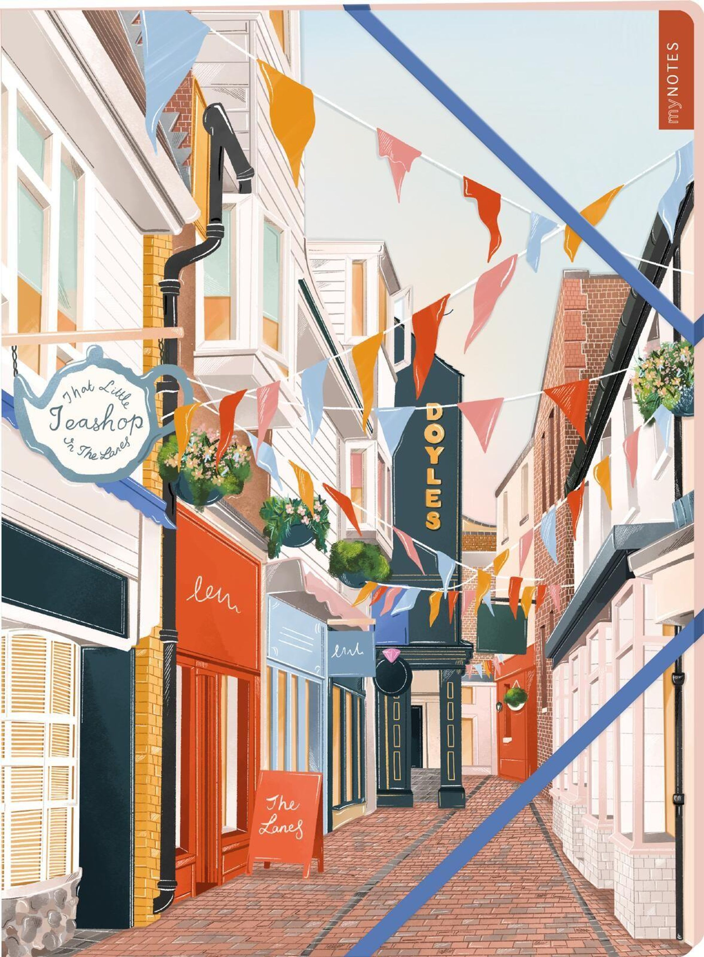 - **Zauberhaft gestaltet von Simply, Katy:**Die Illustration der angesagten britischen Künstlerin fängt die bunte, lebendige Atmosphäre des historischen Viertels "The Lanes" in Brighton ein und bringt englisches Lebensgefühl auf deinen Schreibtisch