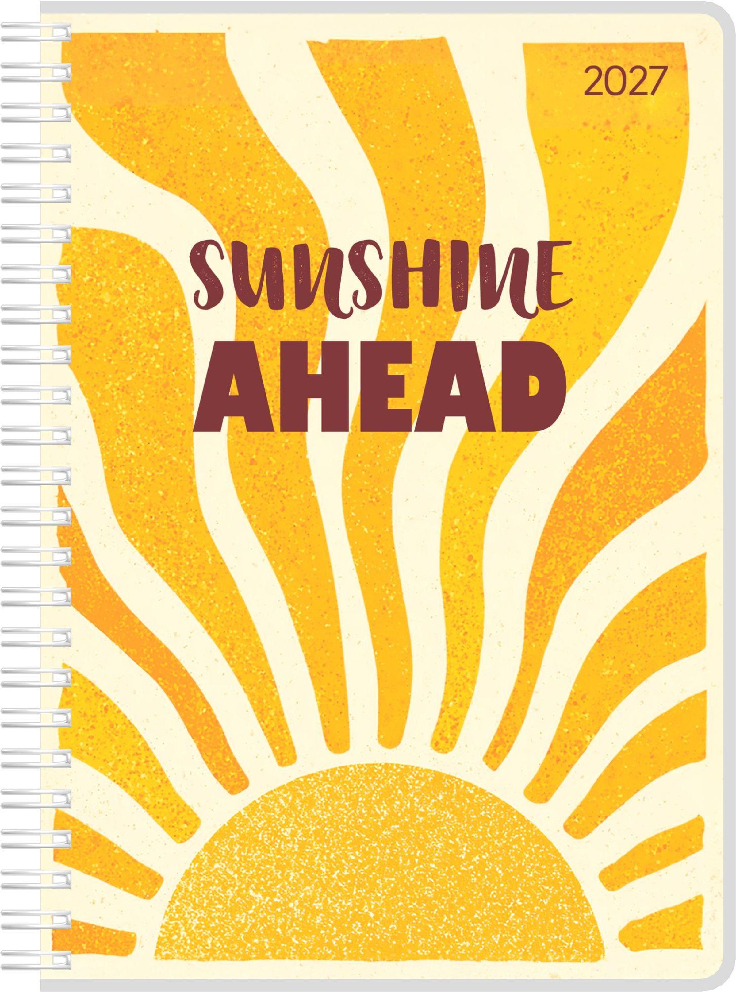 "Sunshine Ahead" in großen Buchstaben, daneben "2027". Illustration einer strahlenden Sonne mit gelben Strahlen., Kalender