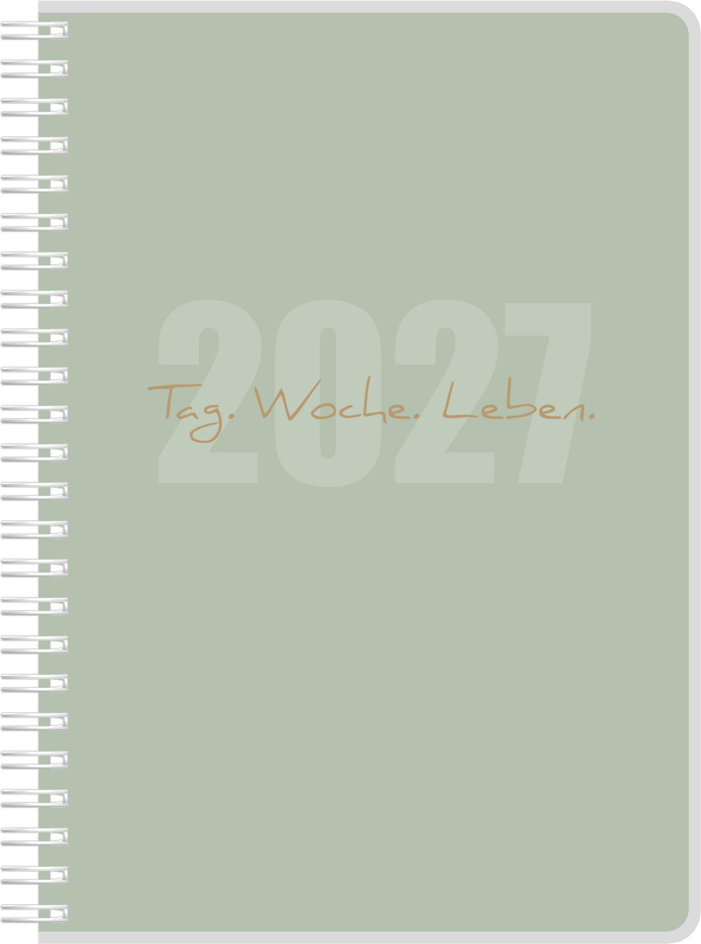 2027, Tag. Woche. Leben. in goldener Schrift vor grünem Hintergrund, Spiralbindung links., Kalender