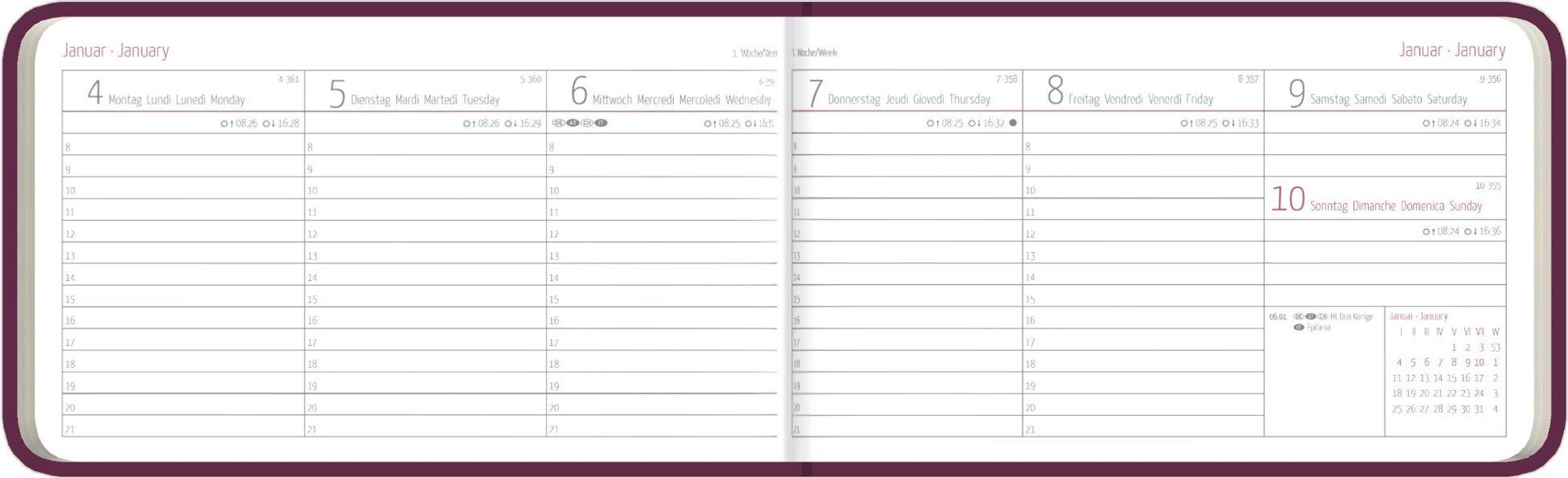 - Übersichtliche Wochenplanung: 1 Woche pro Doppelseite mit Zeiteinteilung (werktags 08: 00-21: 00 Uhr)