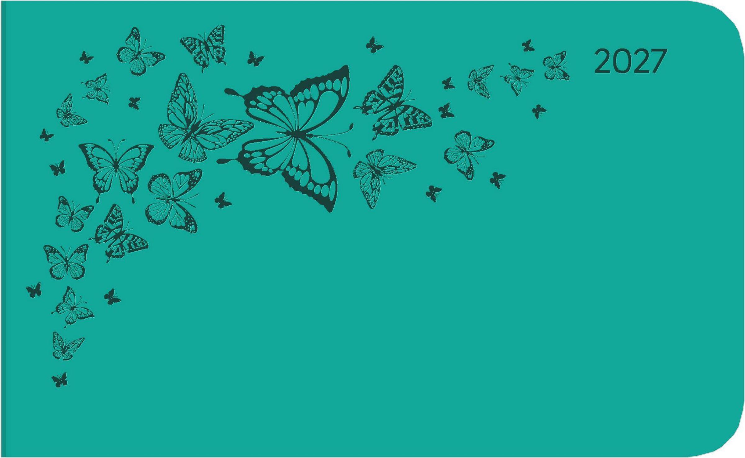 Text "2027" oben rechts. Illustration von Schmetterlingen auf türkisfarbenem Hintergrund, die nach rechts fliegen., Kalender
