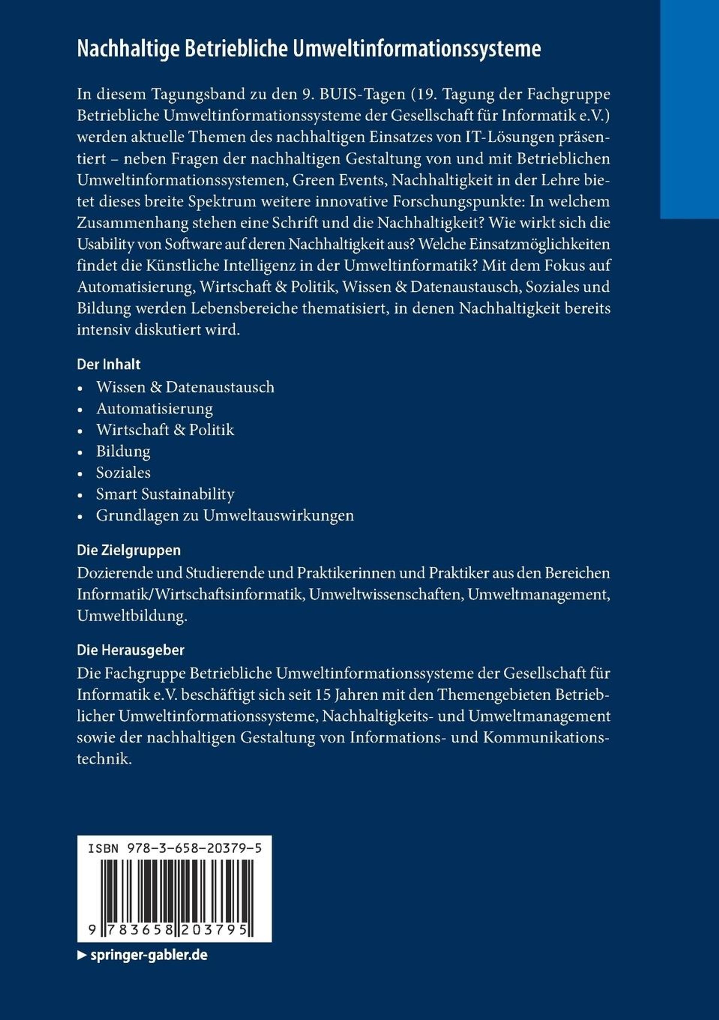 In diesem Tagungsband zu den 9. BUIS-Tagen (19. Tagung der Fachgruppe Betriebliche Umweltinformationssysteme der Gesellschaft für Informatik e. V.) werden aktuelle Themen des nachhaltigen Einsatzes von IT-Lösungen präsentiert neben Fragen der nachhaltigen Gestaltung von und mit Betrieblichen Umweltinformationssystemen, Green Events, Nachhaltigkeit in der Lehre bietet dieses breite Spektrum weitere innovative Forschungspunkte: In welchem Zusammenhang stehen eine Schrift und die Nachhaltigkeit? Wie wirkt sich die Usability von Software auf deren Nachhaltigkeit aus? Welche Einsatzmöglichkeiten findet die Künstliche Intelligenz in der Umweltinformatik? Mit dem Fokus auf Automatisierung, Wirtschaft & Politik, Wissen & Datenaustausch, Soziales und Bildung werden Lebensbereiche thematisiert, in denen Nachhaltigkeit bereits intensiv diskutiert wird.