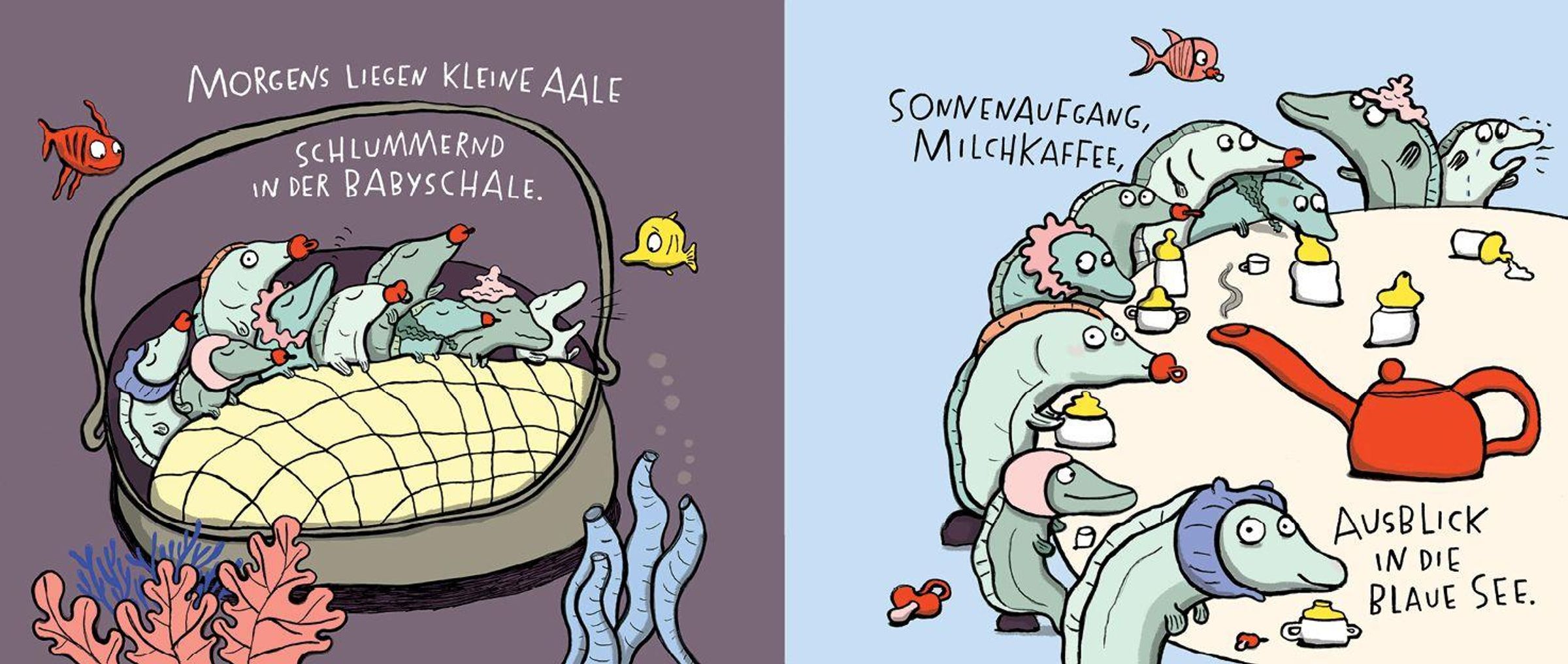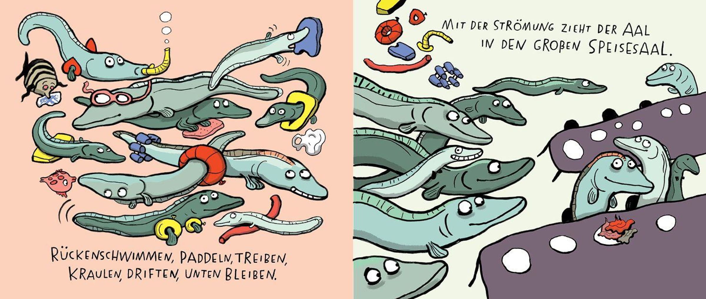 Text: "ALLE AALE", "NADIA BUDDE", "PETER HAMMER VERLAG". Eine bunte Illustration von Aalen und Korallen auf gelbem Hintergrund., Buch