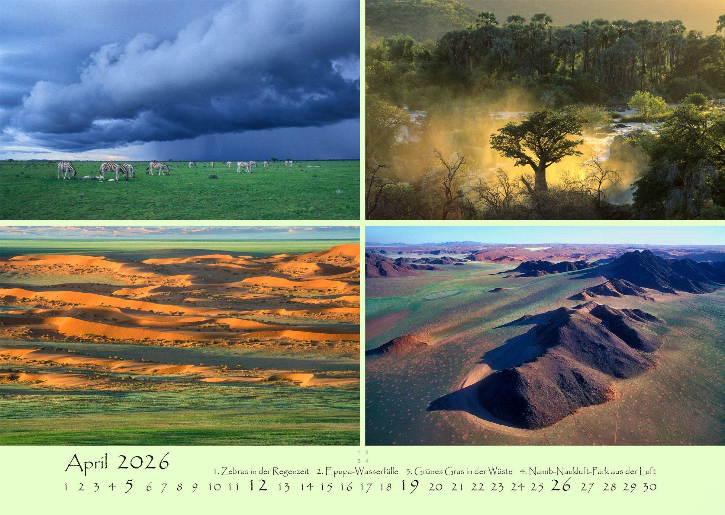- ¿ FARBWELTEN NAMIBIAS: Jeder Monat mit vier farblich abgestimmten Fotografien - Wüstensand, Regenzeitgrün, Sonnenuntergänge & mehr.