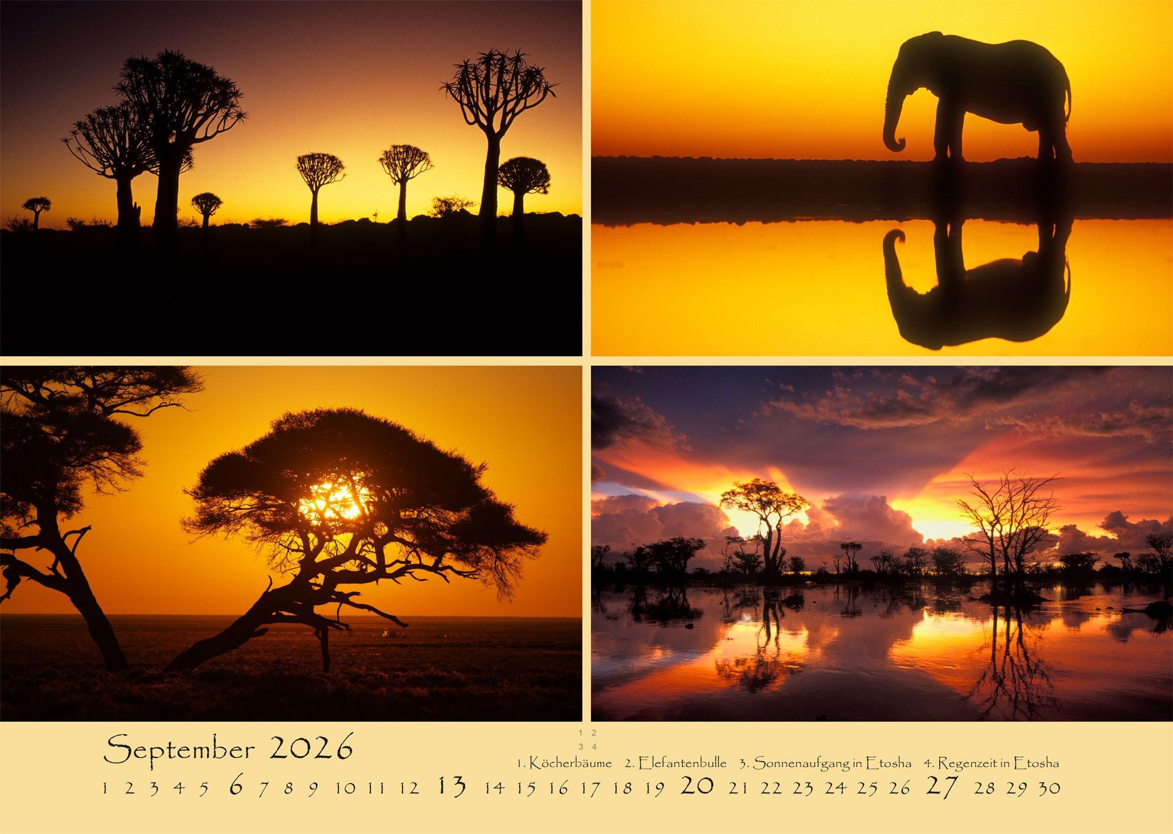 Holen Sie sich mit dem Kalender NAMIBIA - MAGIE DES LICHTS 2026 die wunderbare Wildnis in ihr Zuhause und verschenken Sie die stimmungsvollen Farbwelten Afrikas an Freunde, Kollegen oder Verwandte ¿