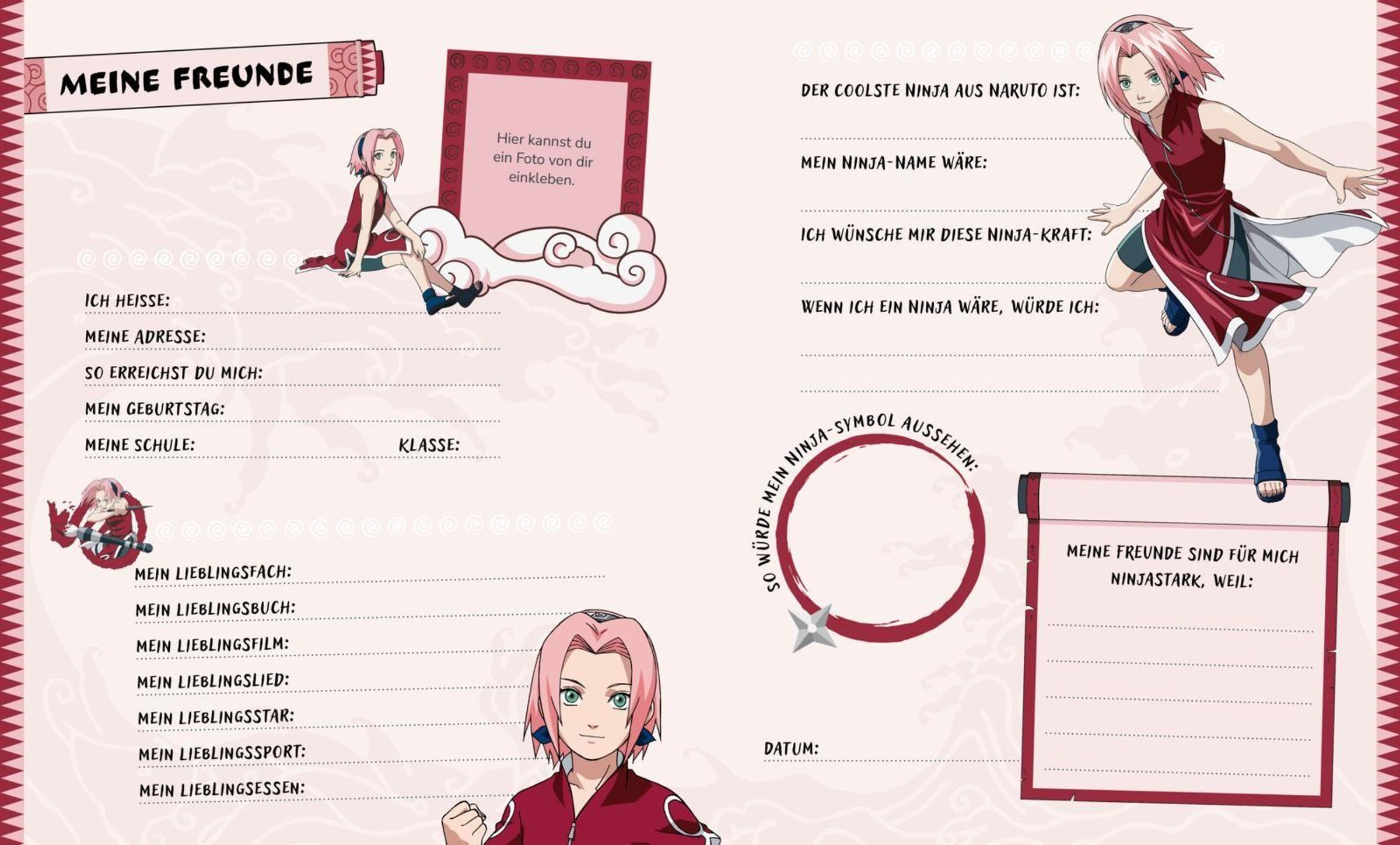 Naruto ist eine der erfolgreichsten Manga-Serien weltweit und endlich gibt es hierzu auch ein Freundebuch für Schüler*innen! Jede Doppelseite bietet neben Fragen zu den eigenen Vorlieben, Hobbys etc. auch ninjaspezifische Inhalte zum Ausfüllen.