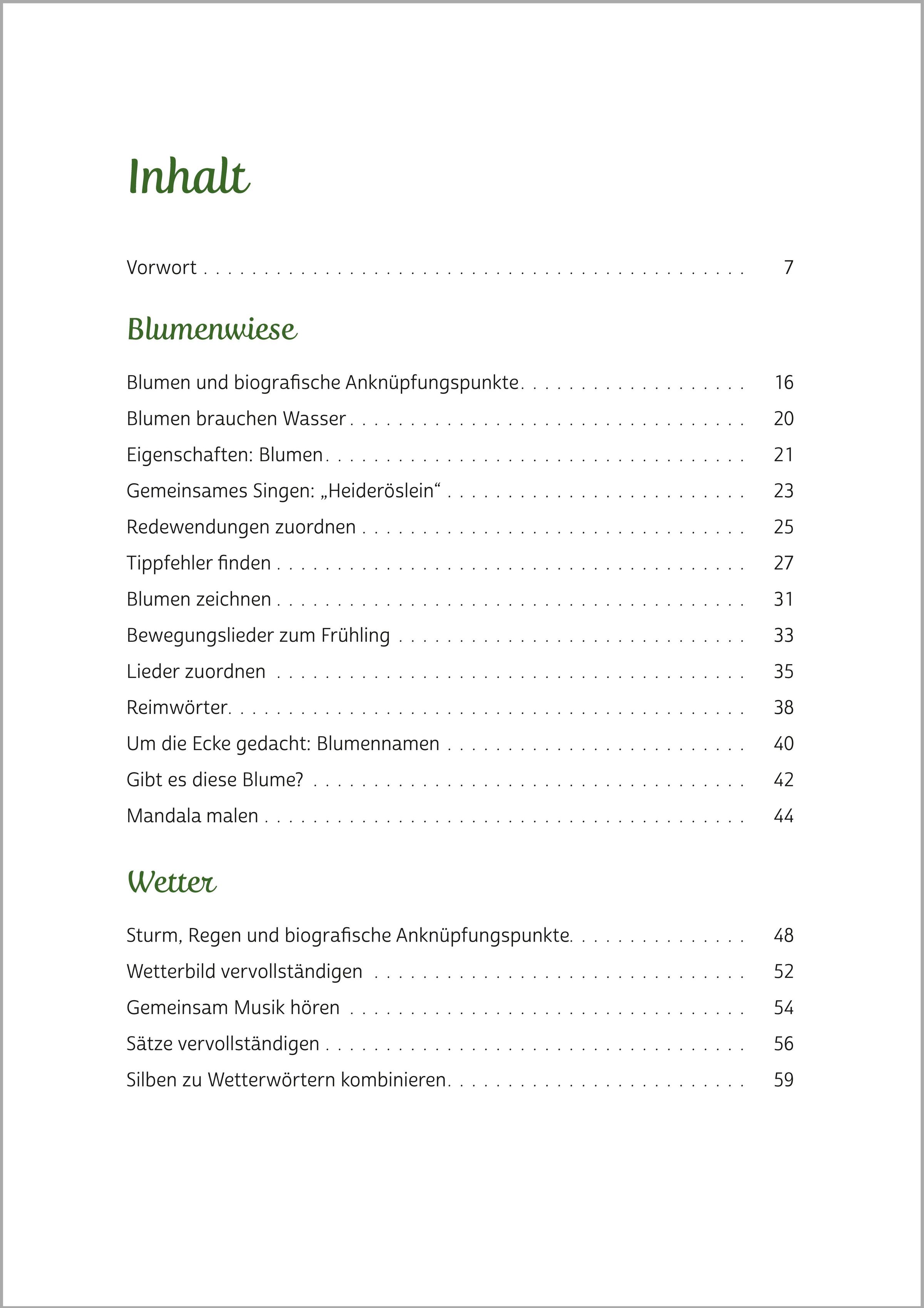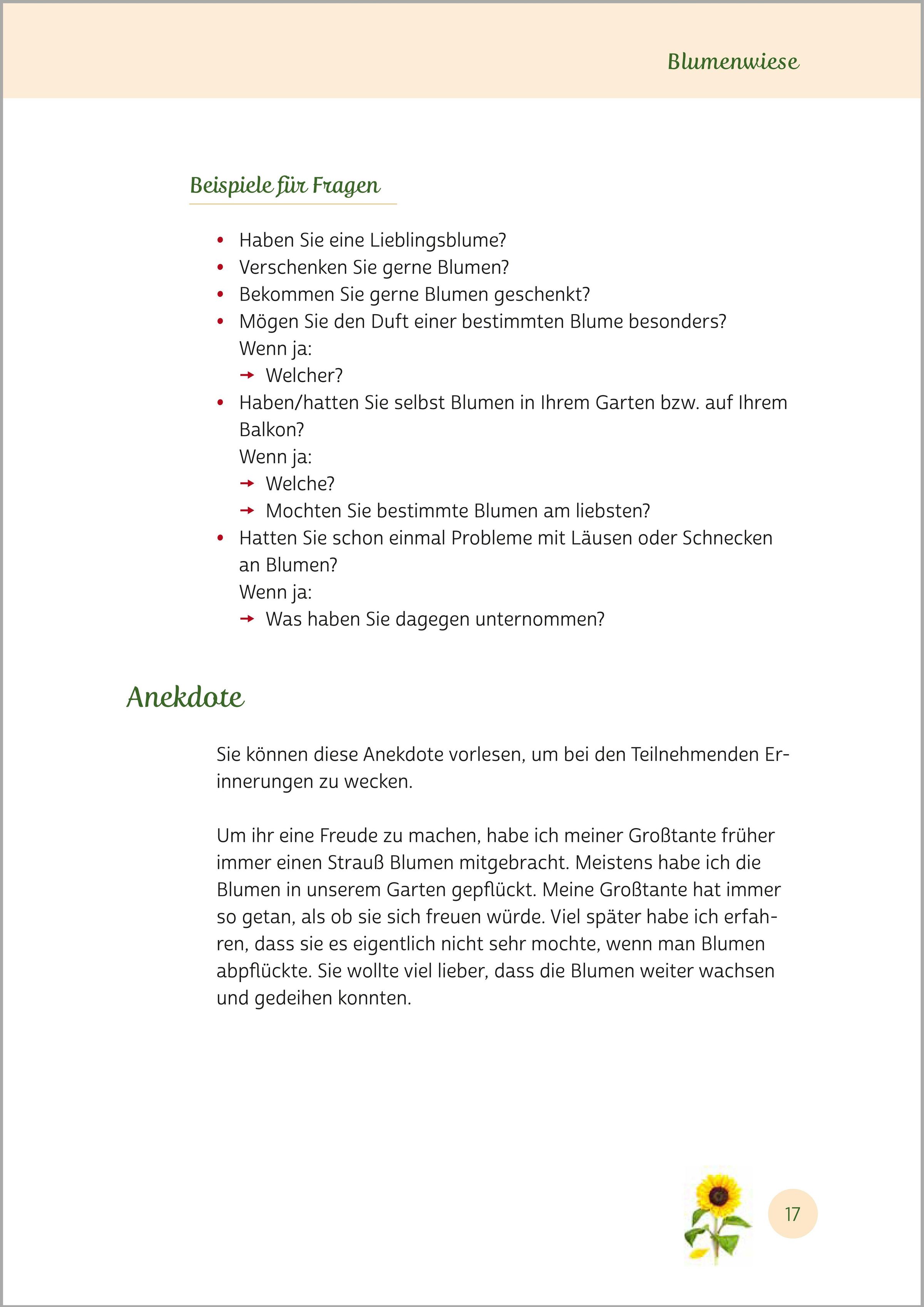 Ob Gesprächsimpulse, Rätsel oder Sinnesanregungen - alles ist alltagsnah gestaltet und bietet zahlreiche Anknüpfungspunkte für persönliche Erlebnisse und Erinnerungen.