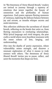 In "The Sweetness of Every Shared Breath," readers are invited to journey through a tapestry of emotions that weave together the beauty of connection and the profundity of human experience. Each poem captures fleeting moments of intimacy, exploring the delicate balance between joy and sorrow, as mouths whisper secrets and souls intertwine. This collection celebrates the sacredness of shared breath, reflecting on the bonds that unite us, from fleeting encounters to everlasting relationships. With lyrical language and vivid imagery, the poet crafts a world where every heartbeat resonates with the sweet echoes of love, longing, and understanding. Dive into the depths of poetic expression, where vulnerability meets strength, and discover a resonant exploration of what it means to truly connect with others. "The Sweetness of Every Shared Breath" invites you to pause, reflect, and savor the moments that shape our lives.