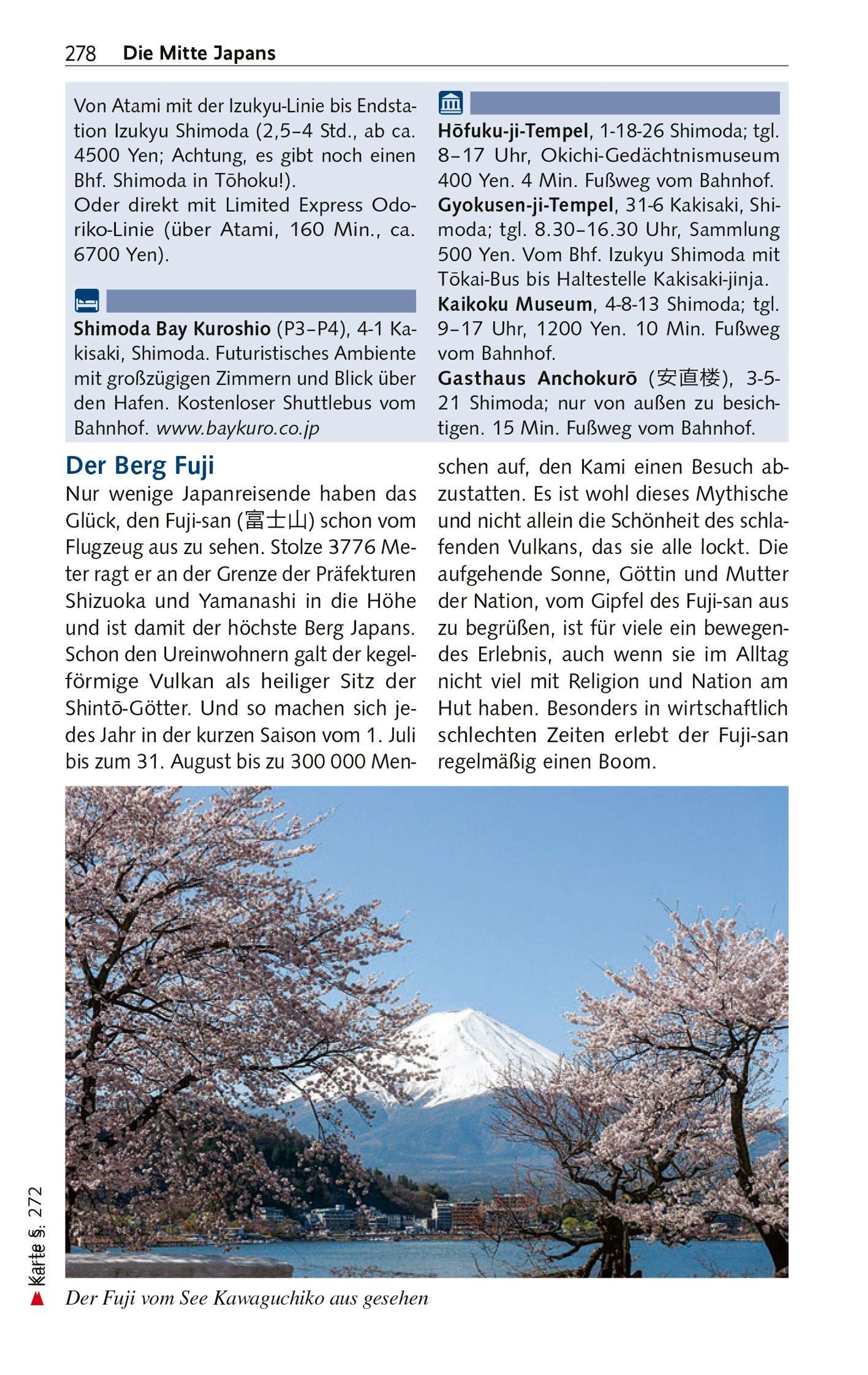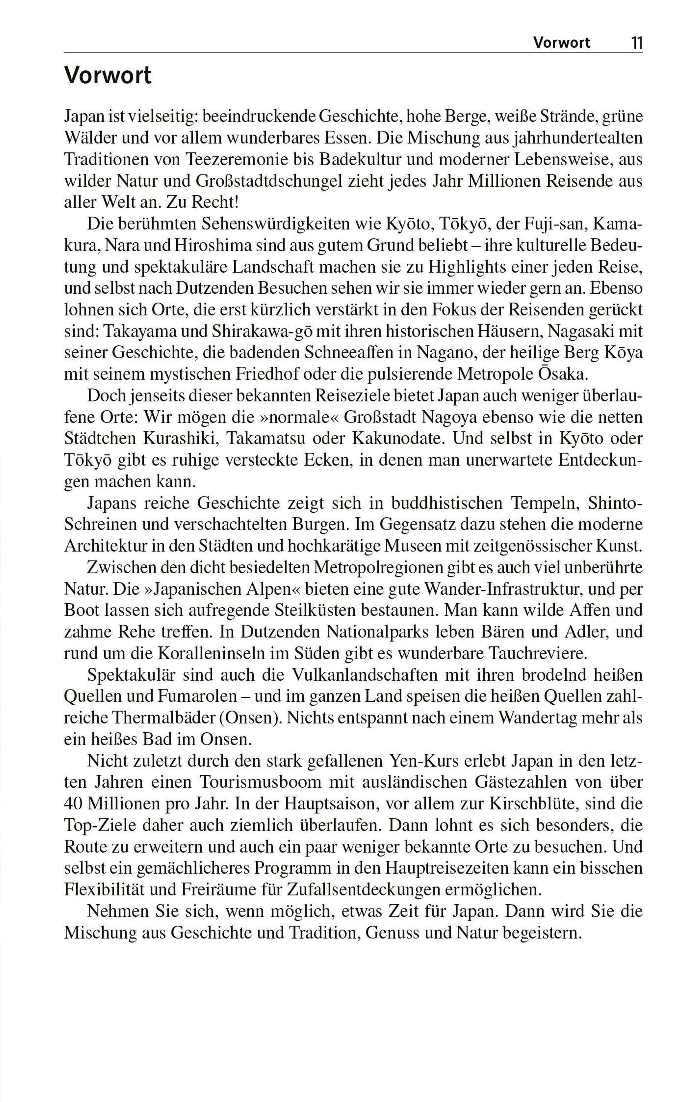 Ein Aufstieg zum schneebedeckten Fuji-san in fast 3800 Meter Höhe Wahrzeichen Japans zählt ebenso zu den touristischen Höhepunkten wie die Kirschblüte, der heilige Berg Koya und die Buddhastatuen in Kamakura und Nara. Die imposante Burg Himeji und die Krähenburg Matsumoto gehören zu den bedeutenden historischen Festungen. Im Dorf Shirakawa-go mit historischen Häusern scheint die Zeit stehengeblieben zu sein. Die Japanischen Alpen bieten herrliche Wandermöglichkeiten und die Koralleninseln im Süden fantastische Tauchreviere. Im gesamten Land speisen heiße Quellen die Onsen, und nichts entspannt angenehmer, als in diese Thermalbäder einzutauchen.