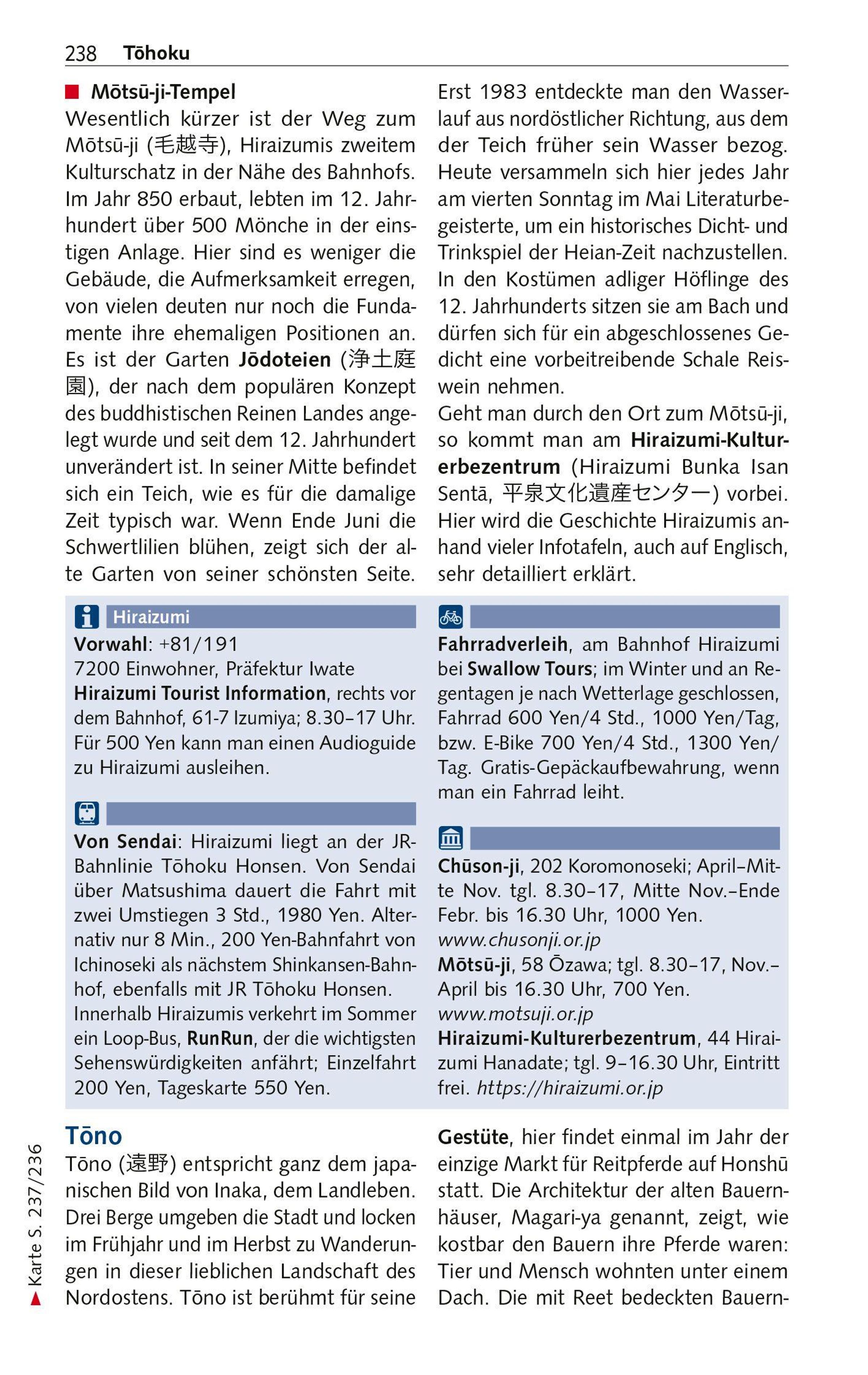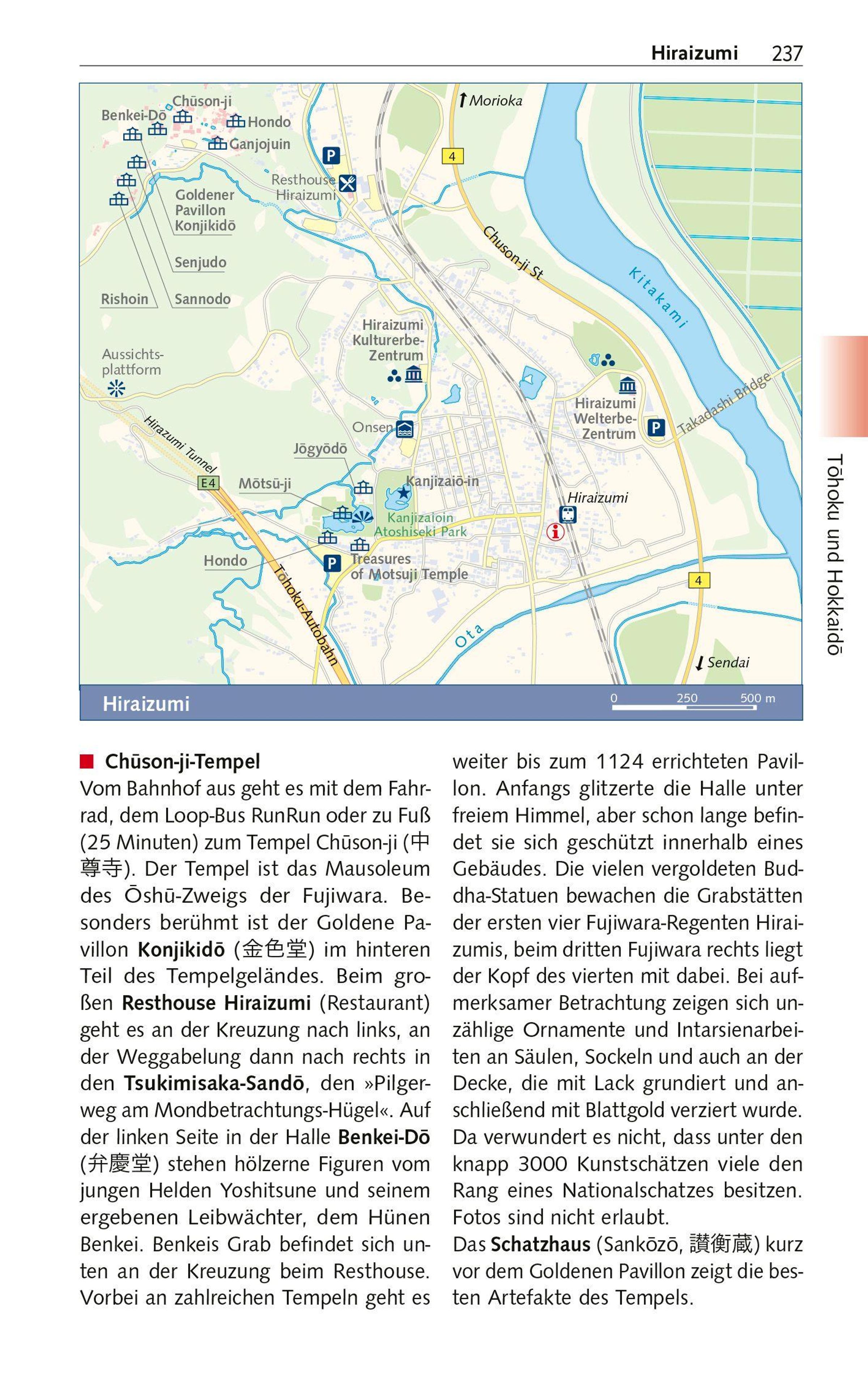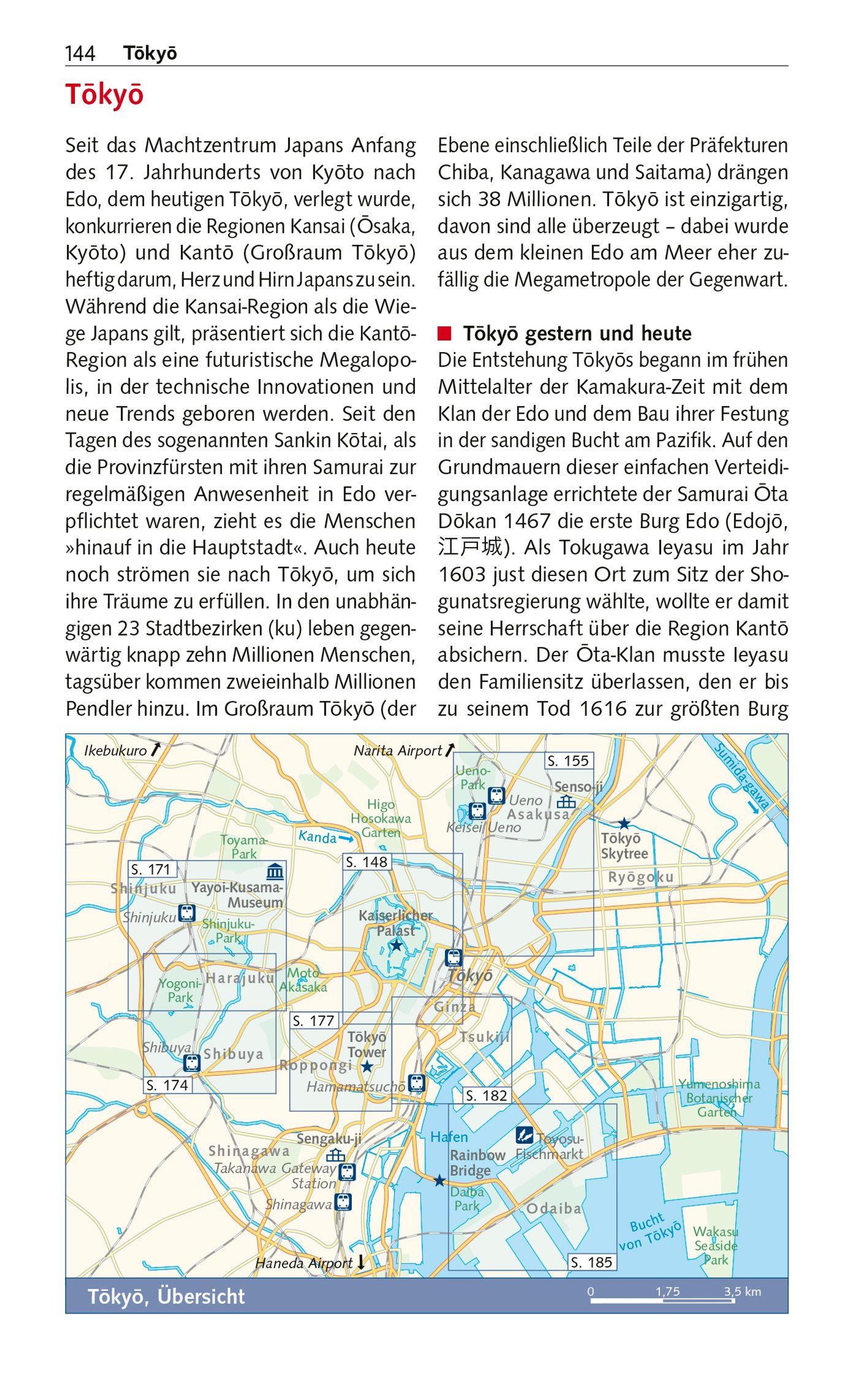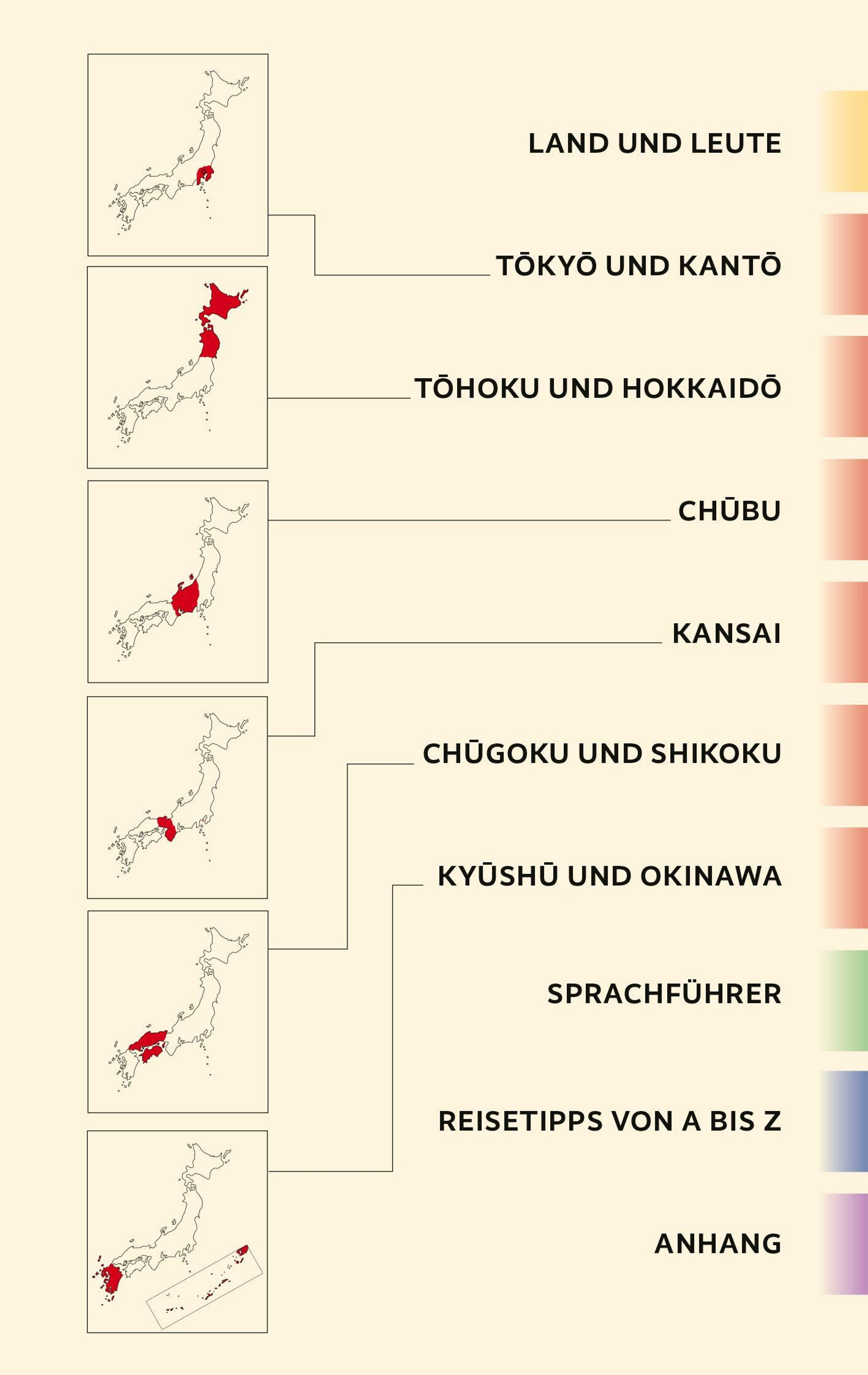 Über 3000 Kilometer zieht sich der Bogen des Archipels mit seinen vier Hauptinseln und Tausenden Eilanden von Hokkaido im Norden bis Kyushu im Süden, vom nördlichen Treibeis bis zu subtropischen Badestränden. Futuristische Wolkenkratzer stehen neben altehrwürdigen Tempeln, Manga und Anime kontrastieren mit Geisha und Teezeremonie. In Tokyo auf der Hauptinsel Honshu überragen himmelstrebende Megabauten den Kaiserpalast. Osaka ist für Shopping und seine Vergnügungsviertel bekannt. Hiroshima und Nagasaki erinnern an die furchtbaren Folgen des Atombombenabwurfs, während die 1200-jährige Kaiserstadt Kyoto Hunderte prachtvoller Schreine und Tempel zieren. Allein 17 davon wurden zum Welterbe erklärt.