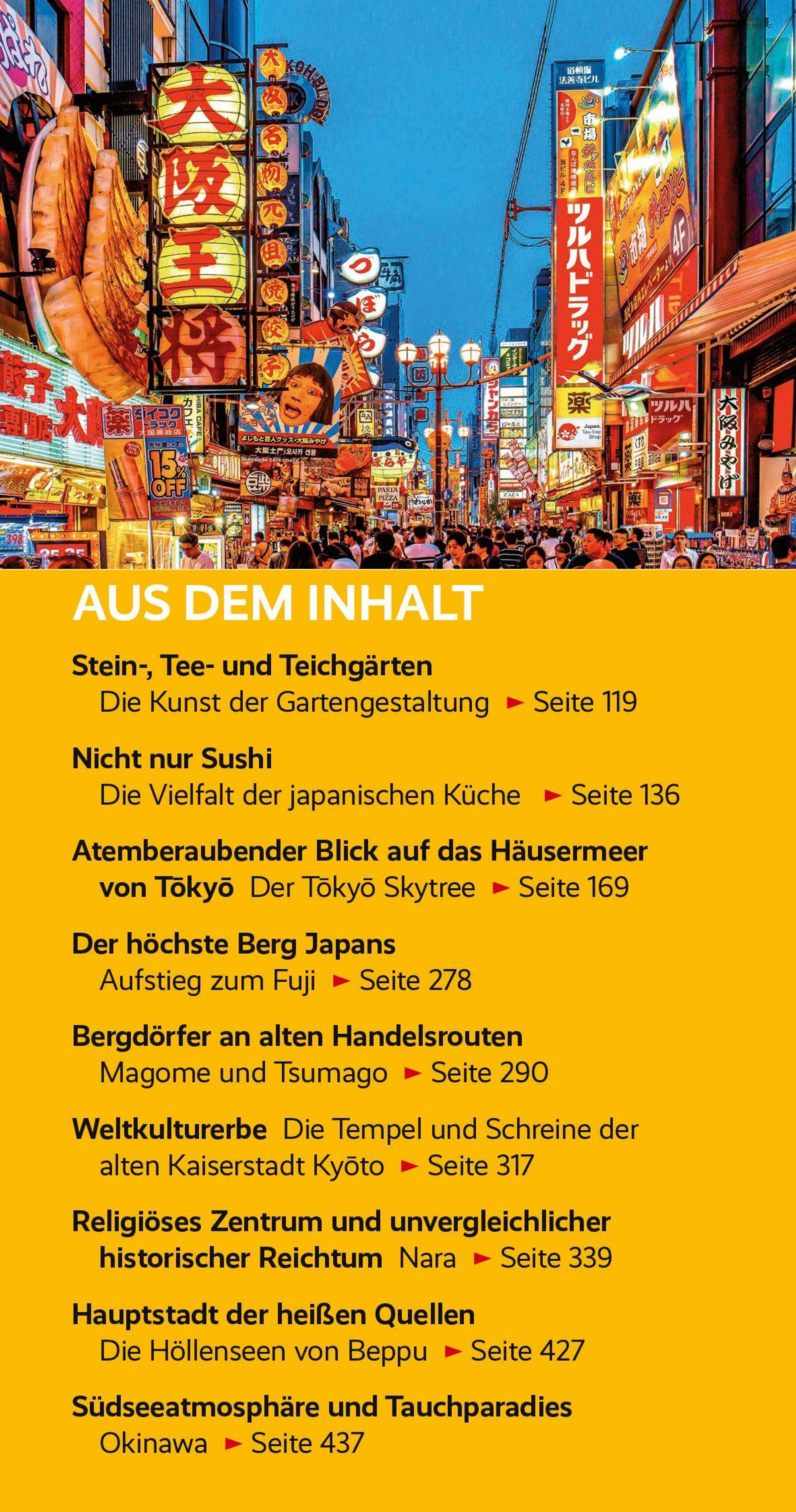 Ein Aufstieg zum schneebedeckten Fuji-san in fast 3800 Meter Höhe ¿ Wahrzeichen Japans ¿ zählt ebenso zu den touristischen Höhepunkten wie die Kirschblüte, der heilige Berg Koya und die Buddhastatuen in Kamakura und Nara. Die imposante Burg Himeji und die Krähenburg Matsumoto gehören zu den bedeutenden historischen Festungen. Im Dorf Shirakawa-go mit historischen Häusern scheint die Zeit stehengeblieben zu sein. Die Japanischen Alpen bieten herrliche Wandermöglichkeiten und die Koralleninseln im Süden fantastische Tauchreviere. Im gesamten Land speisen heiße Quellen die Onsen, und nichts entspannt angenehmer, als in diese Thermalbäder einzutauchen.