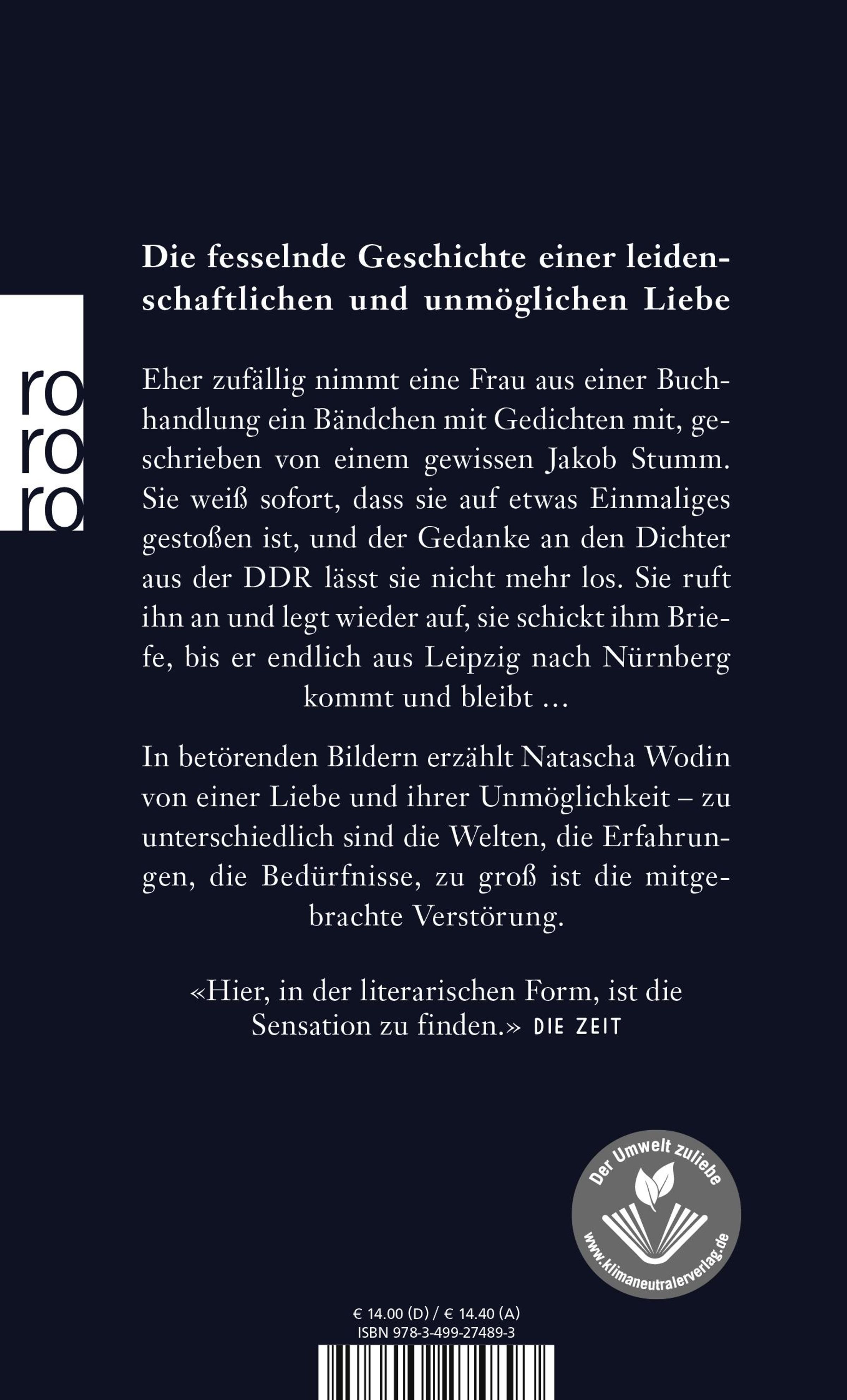 Eher zufällig nimmt eine Frau aus einer Buchhandlung ein Bändchen mit Gedichten mit, geschrieben von einem gewissen Jakob Stumm. Sie weiß sofort, dass sie auf etwas Einmaliges gestoßen ist, und der Gedanke an den Dichter aus der DDR lässt sie nicht mehr los. Sie ruft ihn an und legt wieder auf, sie schickt ihm Briefe, bis er endlich aus Leipzig nach Nürnberg kommt und bleibt ... In betörenden Bildern erzählt Natascha Wodin von einer Liebe und ihrer Unmöglichkeit - zu unterschiedlich sind die Welten, die Erfahrungen, die Bedürfnisse, zu groß ist die mitgebrachte Verstörung.