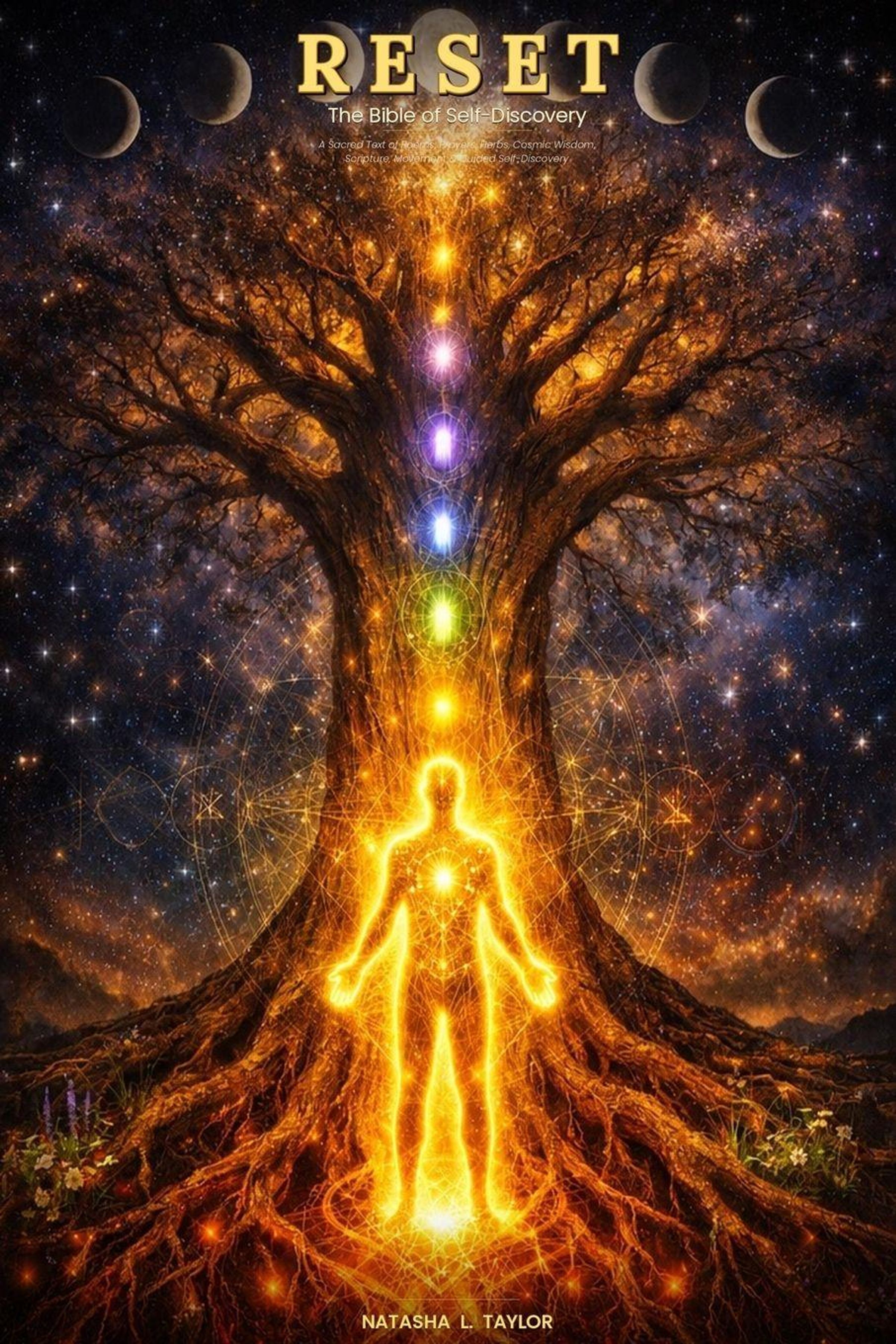 "RESET: The Bible of Self-Discovery" und "NATASHA L. TAYLOR". Leuchtende Figur vor kosmischen Baum, Chakren dargestellt., Buch