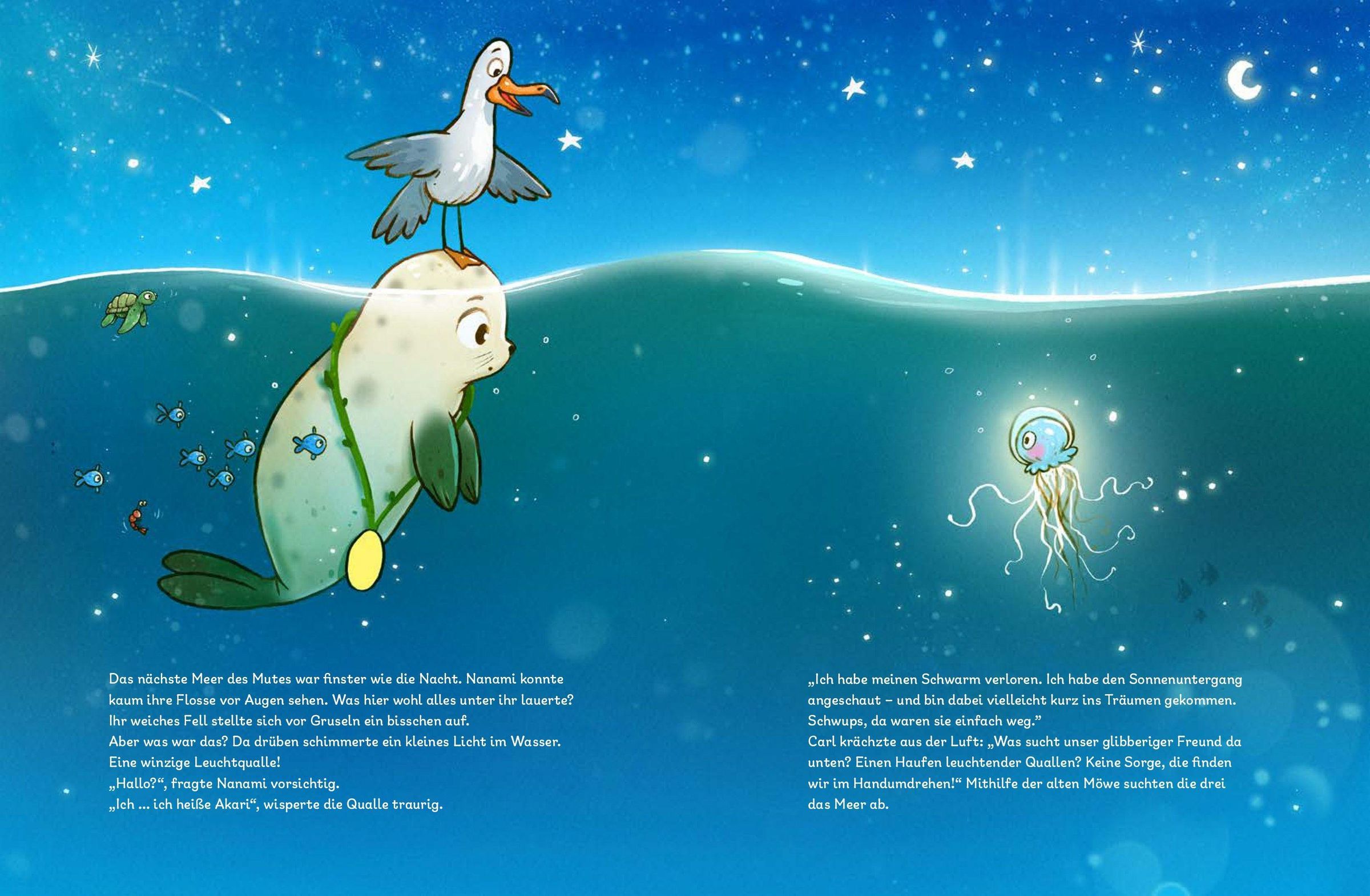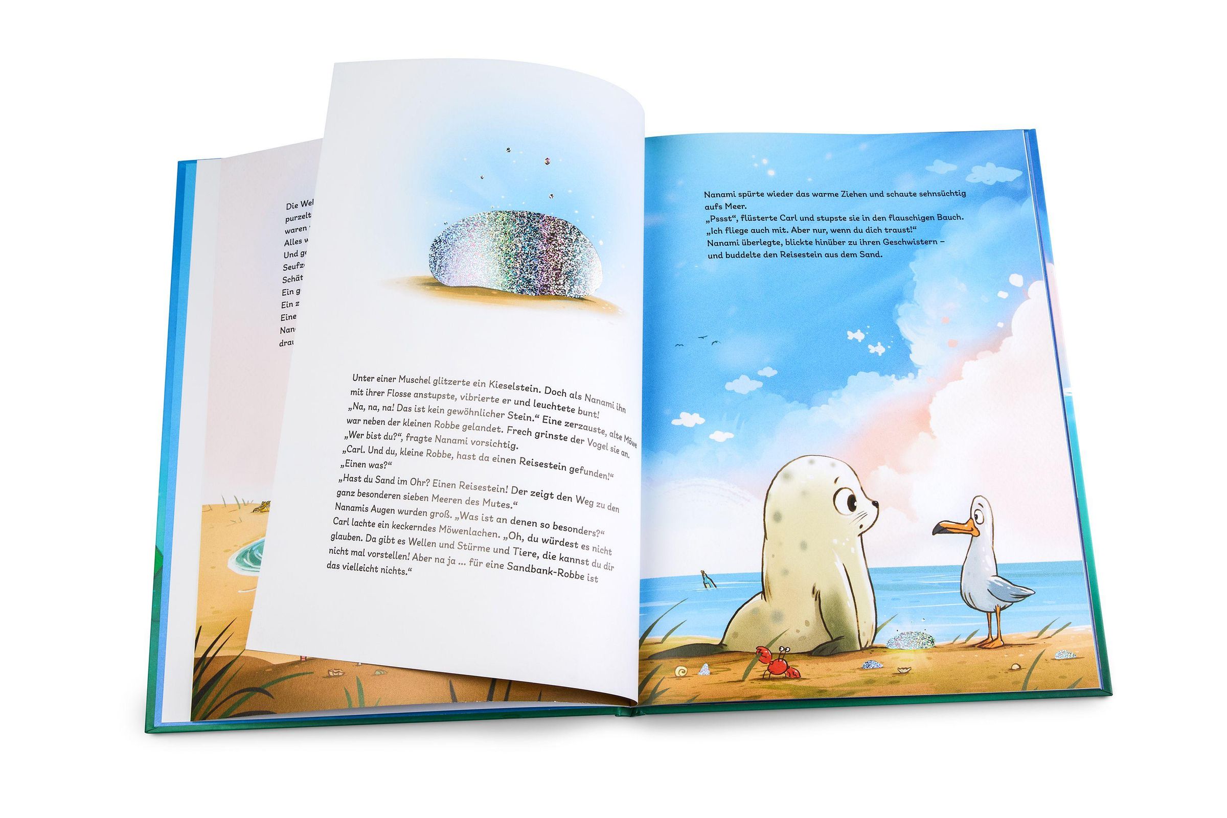 Die kleine Robbe Nanami lebt mit ihrer Familie auf einer Sandbank. Doch Nanami wird die Sandbank zu klein - sie möchte gerne mehr sehen, mehr erleben und die Welt entdecken . Eines Morgens spült das Meer einen sonderbaren Stein an. Was der wohl kann? Die freche Möwe Carl löst das Rätsel: Es ist ein Reisestein ! Er zeigt sich nur den Mutigsten und weist den Weg durch die sieben Weltmeere. Nanamis Neugier ist geweckt und gemeinsam mit Carl macht sich die mutige kleine Robbe auf den Weg, umneue Abenteuer zu erleben ...