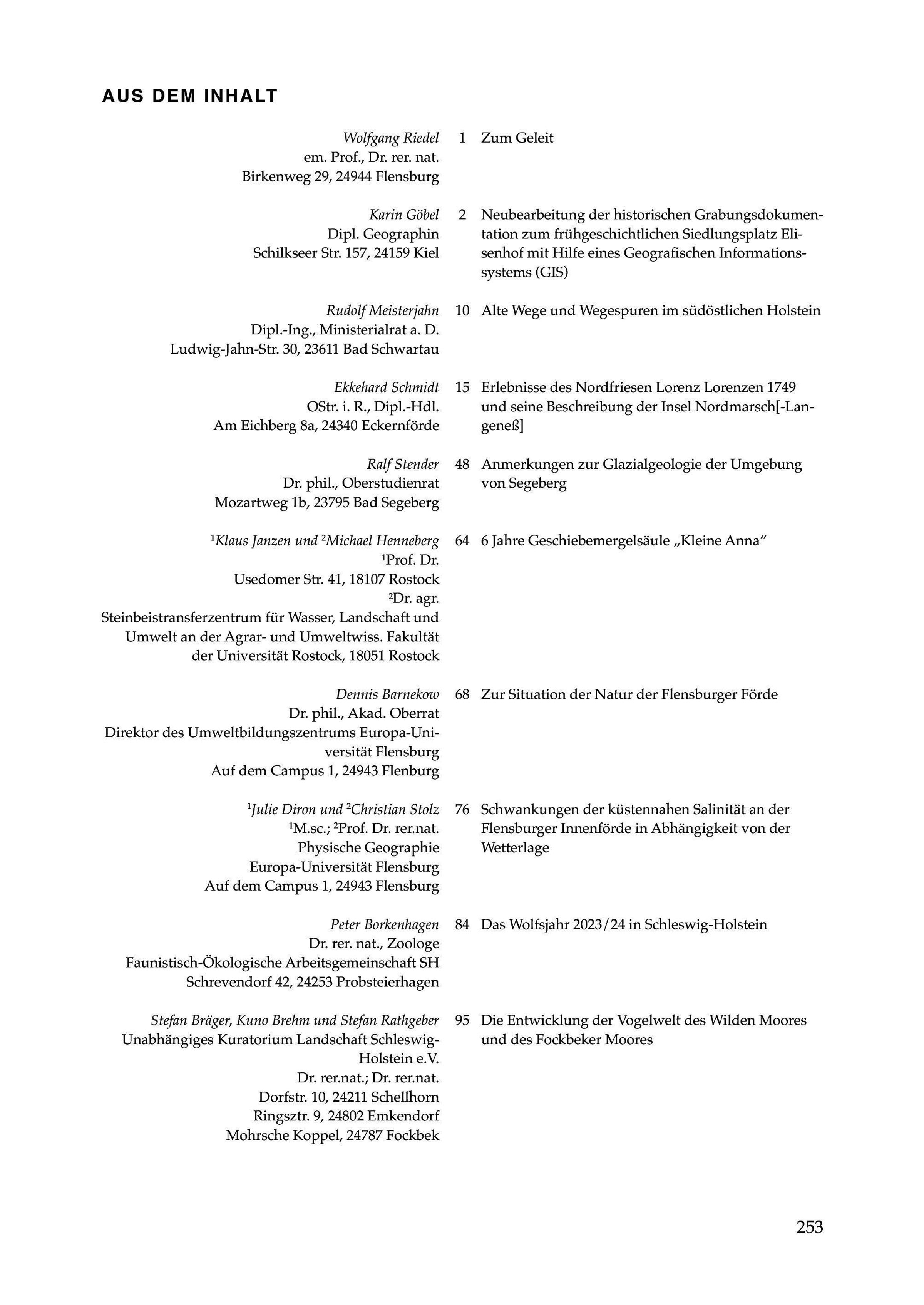 Das neue Natur- und landeskundliche Jahrbuch bietet vielfältige Beiträge zu Archäologie, mittelalterlicher Landesgeschichte und Zeitgeschichte, von der Rodungsphase bis zu Geheimdiensten im Zweiten Weltkrieg. Es beleuchtet unter anderem Friedrich Wilhelm Lübke als Seefahrer und Ministerpräsident, Naturkunde-Themen wie Erdgeschichte und Ornithologie, die Wolfsrückkehr und Gewässerqualität der Flensburger Förde. Das Landesarchiv wird als Hüter geistiger Schätze vorgestellt und ein planerischer Ausblick thematisiert die regionale Krisenfestigkeit.