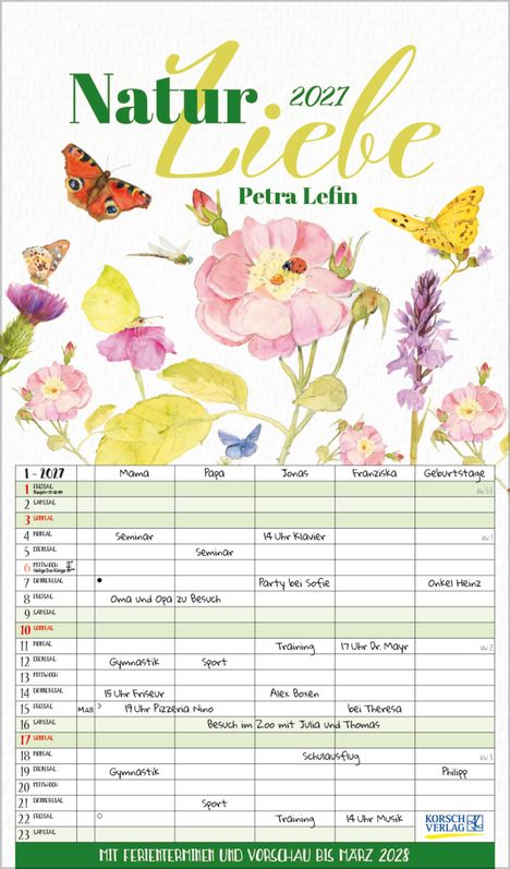 - Familienplaner mit 5 breiten Spalten. Hochwertiger Familienkalender mit Ferienterminen, extra Spalte, Vorschau bis März 2027 und nützlichen Zusatzinformationen.