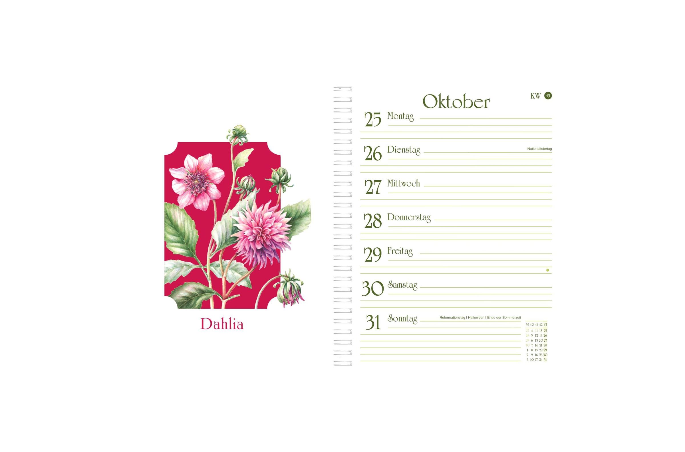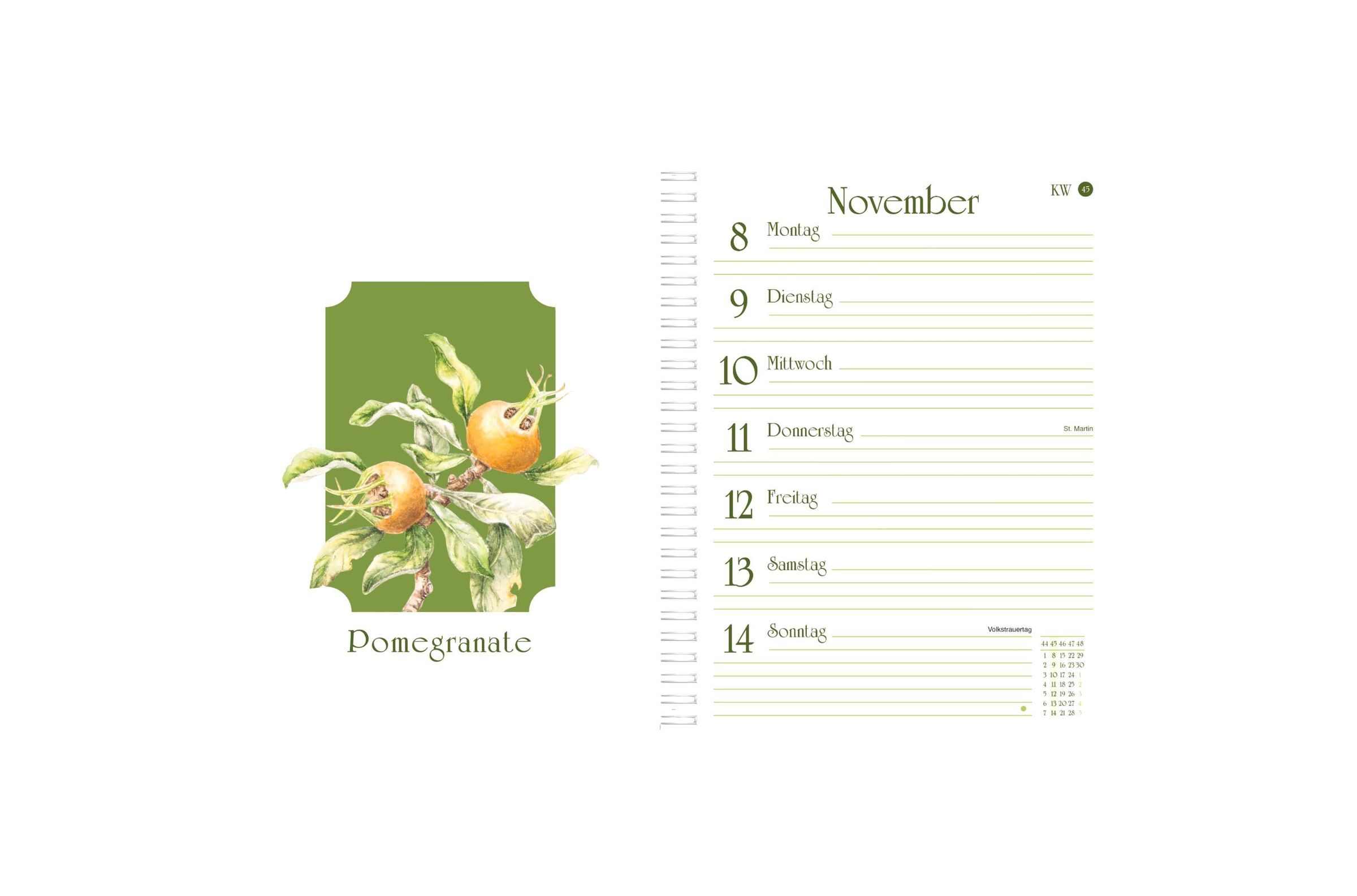 „2027 NATURZAUBER Timer Janneke Brinkman“; Illustration von Pflanzen, Vogel, Schmetterling, Granatapfel und Blättern., Kalender
