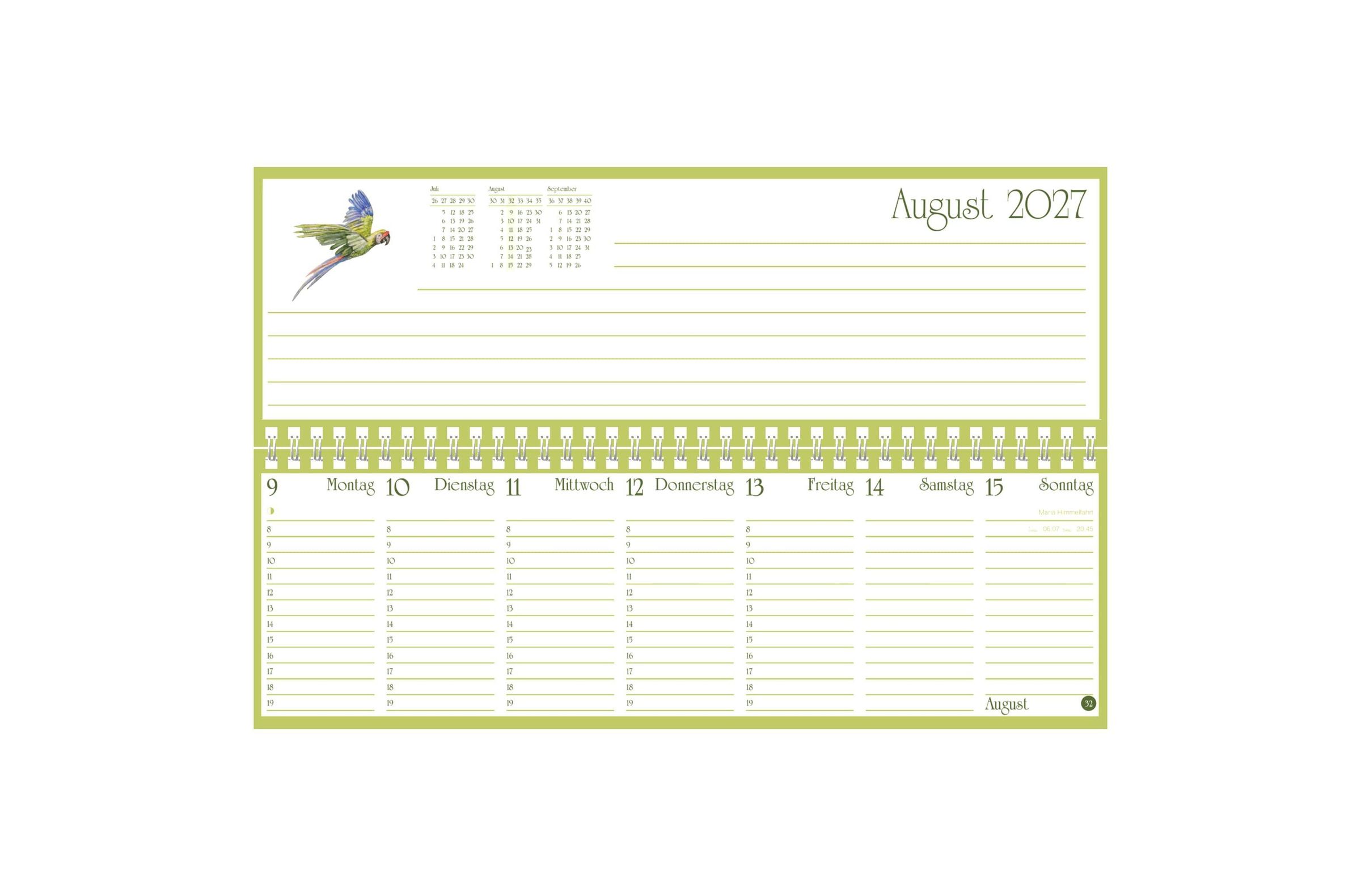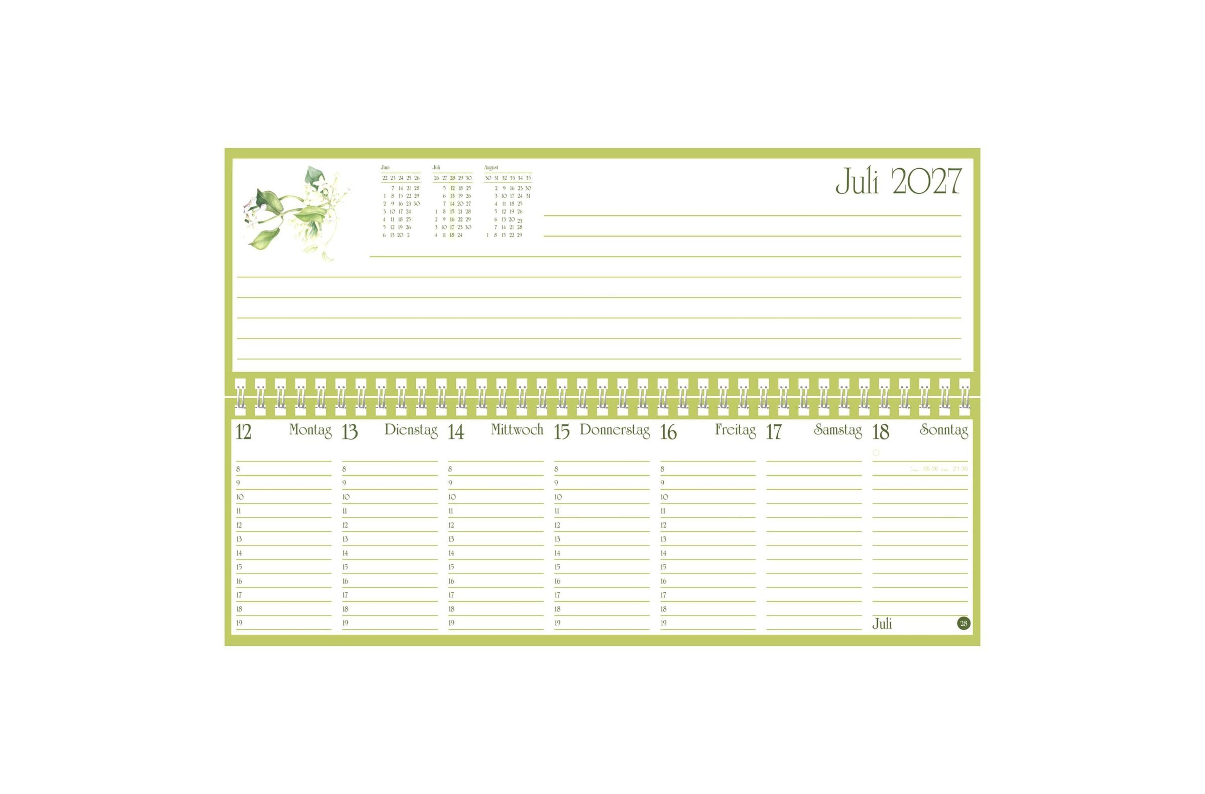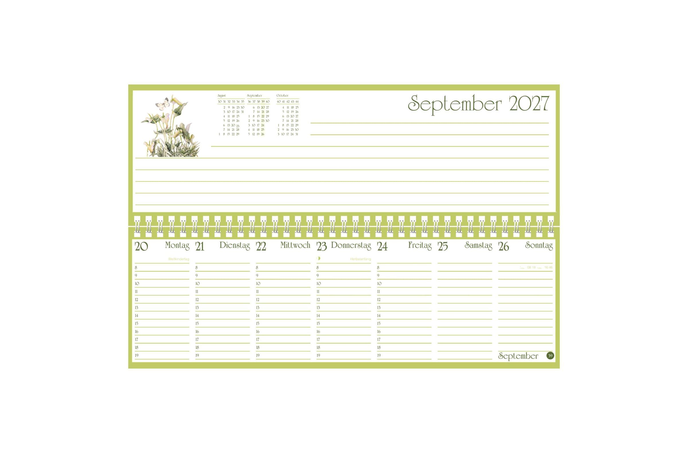Der Naturzauber Tischquerkalender 2027 verbindet Wochenplanung, viel Notizraum und florales Design -- als übersichtlicher Tischkalender für Alltag, Büro und Homeoffice. Entdecke auch die anderen Formate der Reihe!