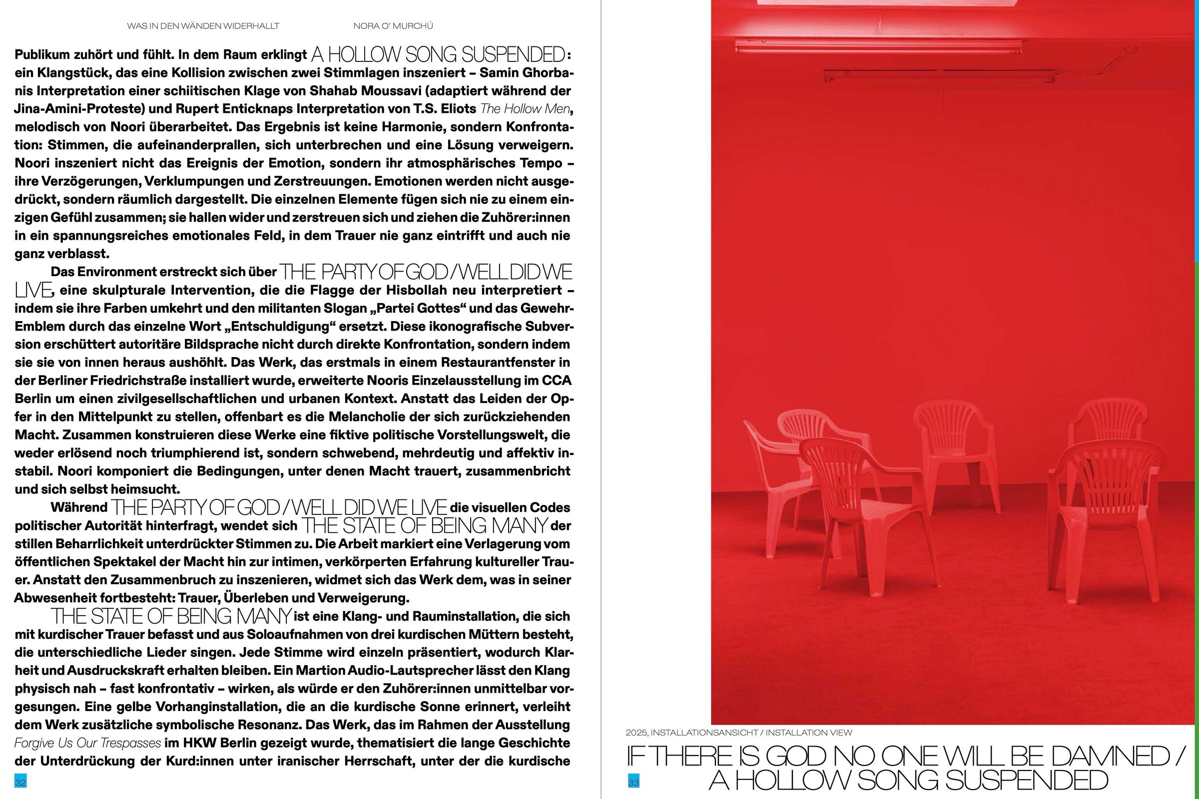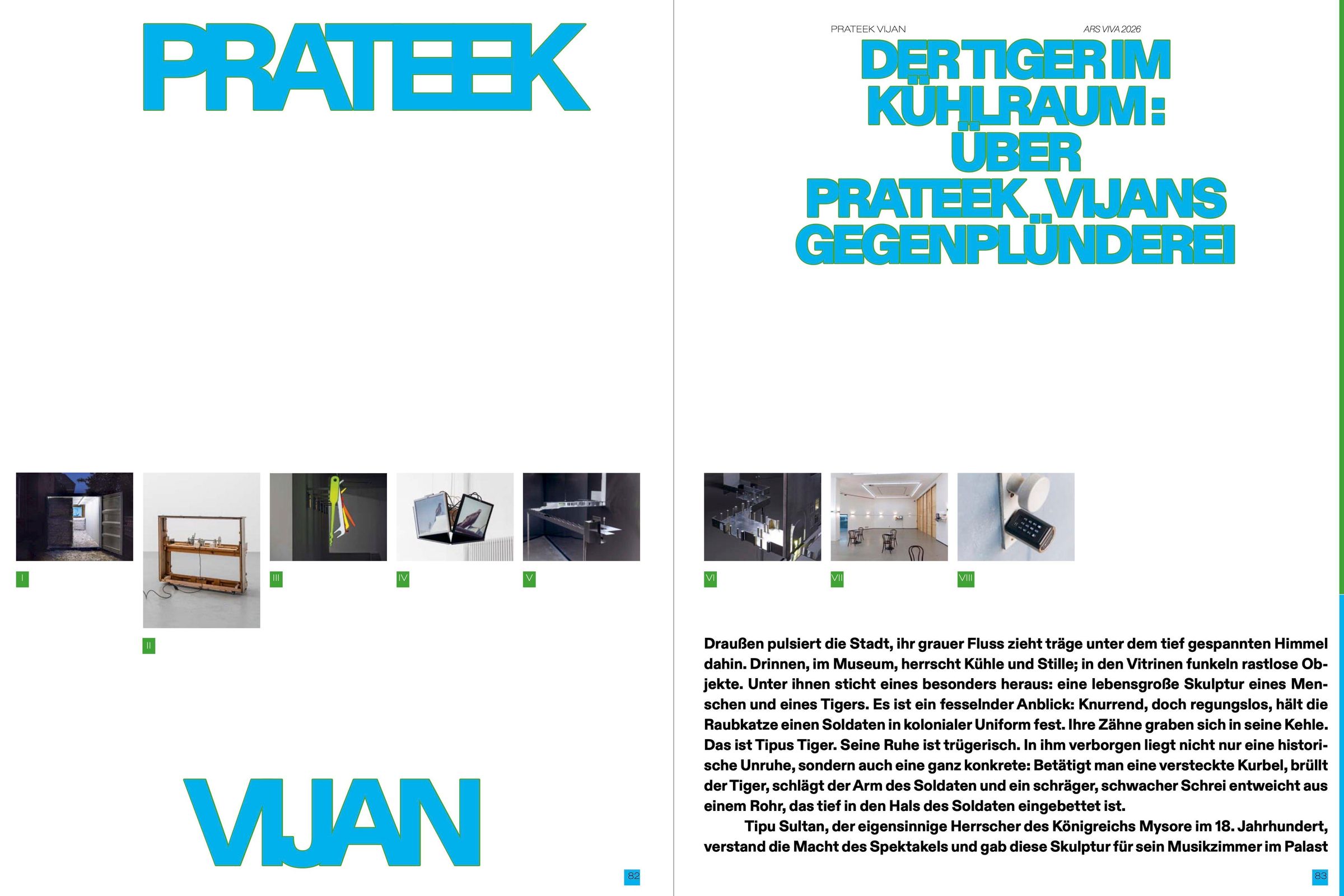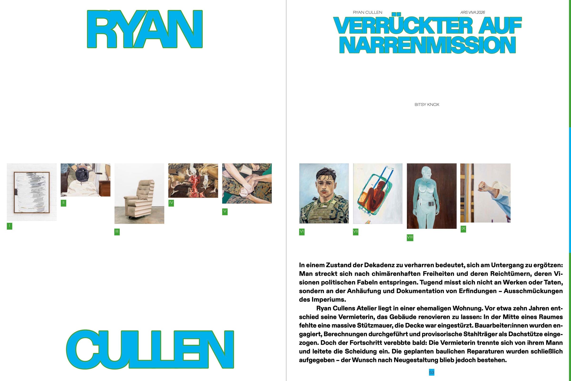 The winners of the 2026 ars viva prize are Nazanin Noori (b. 1991), Ryan Cullen (b. 1992), and Prateek Vijan (b. 1991). Nazanin Noori is an interdisciplinary artist whose oeuvre spans sound and installation art, stage and audio play directing, and writing. In a process in which painting and sculpture intersect, Ryan Cullen creates images that reflect Western society's penchant for self-destruction. Prateek Vijan's sculptures, installations, and films revolve around the indiscriminate claims to owner- ship lodged by colonial powers and their entrenchment in society.