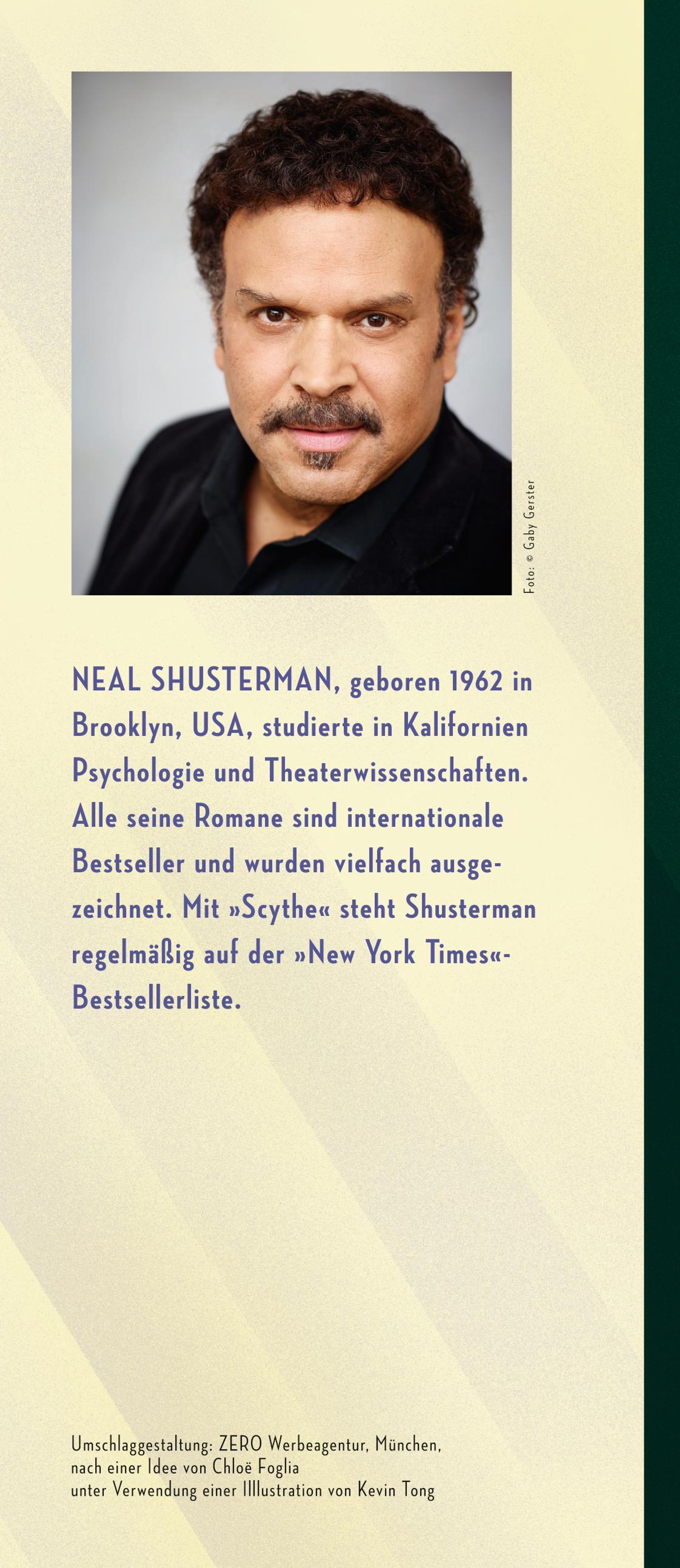 Endlich: das spektakuläre Finale der großen »Scythe«-Trilogie Drei Jahre sind vergangen, seit mit Scythe Goddard ein Scythe der neuen Ordnung die Macht ergriffen hat, und seit der Thunderhead verstummt ist - für alle Menschen, bis auf Grayson Tolliver. Gibt es Hoffnung auf ein Wiedersehen mit Citra und Rowan und auf ein wirkliches Happy End in der scheinbar perfekten Welt? Stell dir eine Welt vor, in der Armut, Krankheit und Tod besiegt sind. Aber auch in dieser perfekten Welt müssen Menschen sterben. Die Entscheidung über Leben und Tod treffen die Scythe: sie allein entscheiden, wer sterben muss. Und nicht alle Scythe halten sich an die alten Regeln...Biografie (Neal Shusterman)