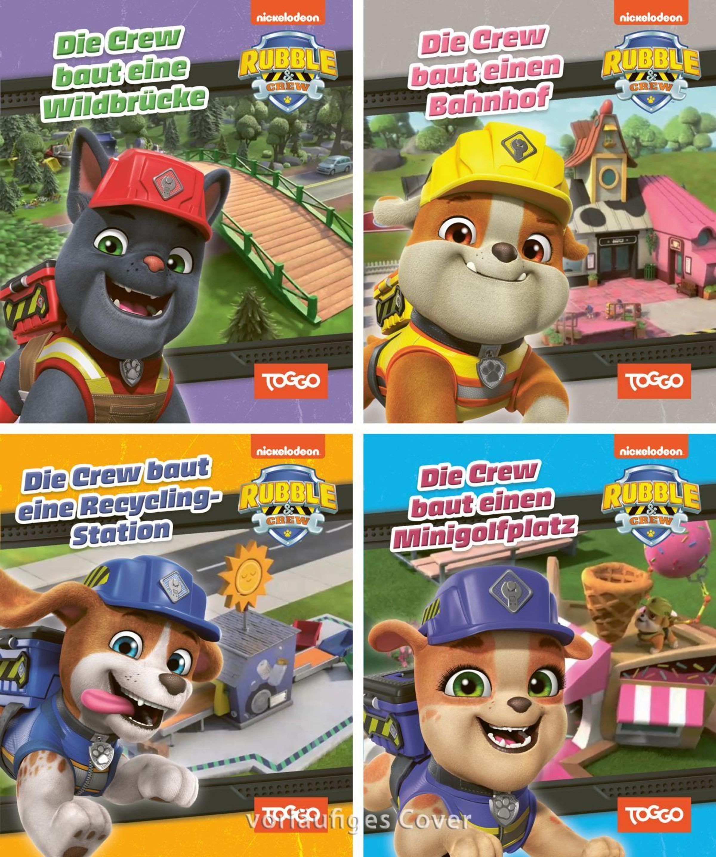 Diese Geschichten lassen kleine Baupfoten in die Welt von Rubble & Crew eintauchen: Die Crew baut einen Bahnhof, Die Crew baut einen Minigolfplatz, Die Crew baut eine Wildbrücke, Die Crew baut eine Recycling-Station