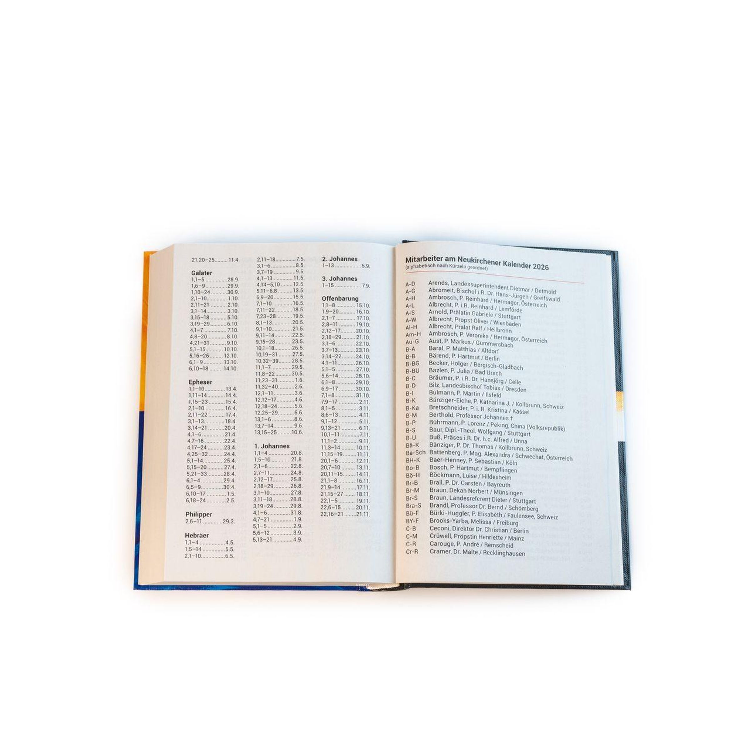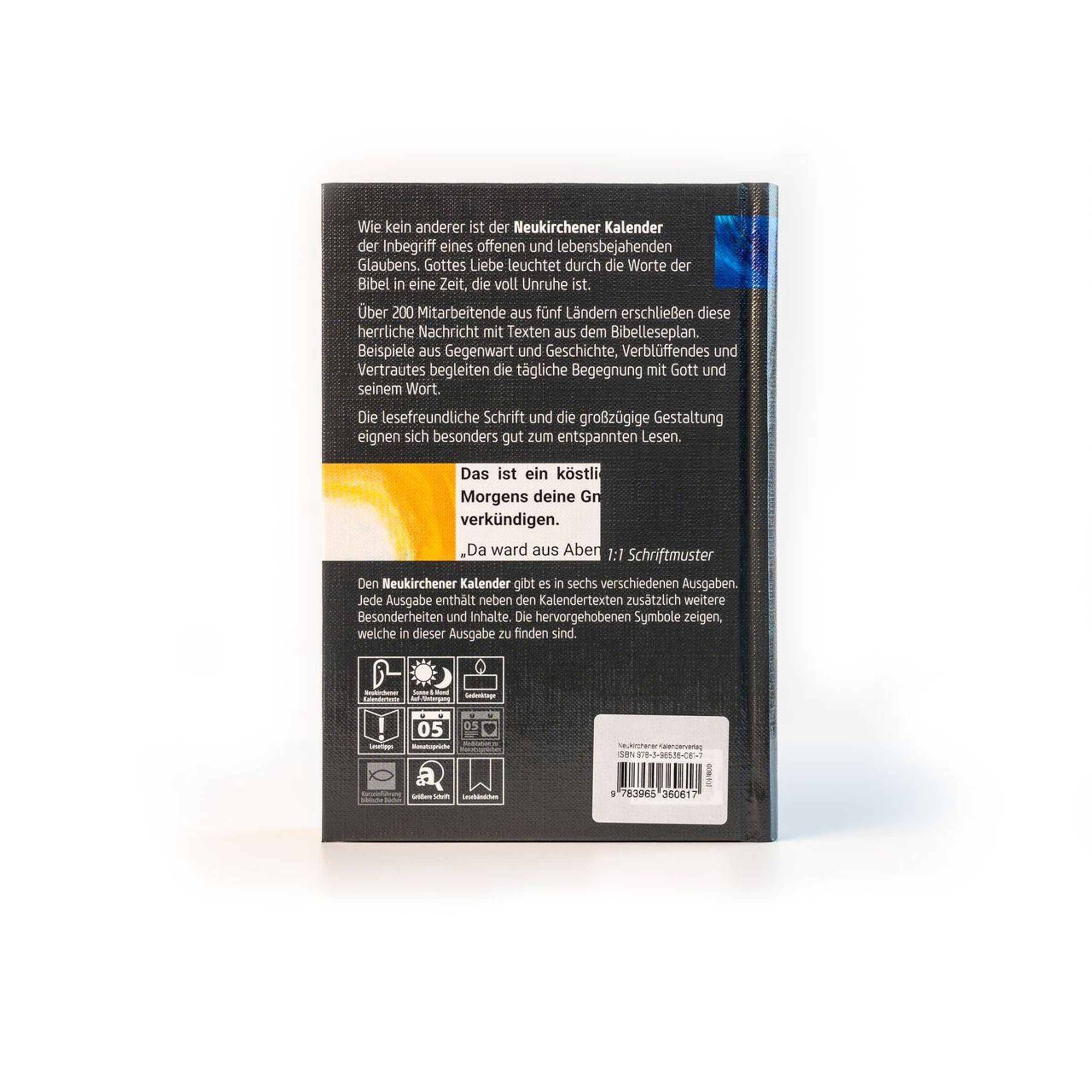 Der Neukirchener Kalender ist für viele Bibelleserinnen und -leser ein unverzichtbarer Impuls für den Tag! Über 200 Mitarbeitende aus fünf Ländern und verschiedenen christlichen Kirchen sorgen dafür, dass dieser traditionsreiche Andachts- und Bibellesekalender für einen offenen und lebensnahen Glauben steht. Besonders machen ihn seine beiden täglichen Texte: Im ersten wird der Bibeltext des Ökumenischen Bibelleseplans erschlossen und im zweiten mit einer alltagsnahen Erzählung, einem Impuls oder einem Gebet veranschaulicht. Ergänzt werden die Texte mit Liedvorschlägen, Jahrestagen besonderer Persönlichkeiten, den beliebten Buchtipps, und den Monatssprüchen.