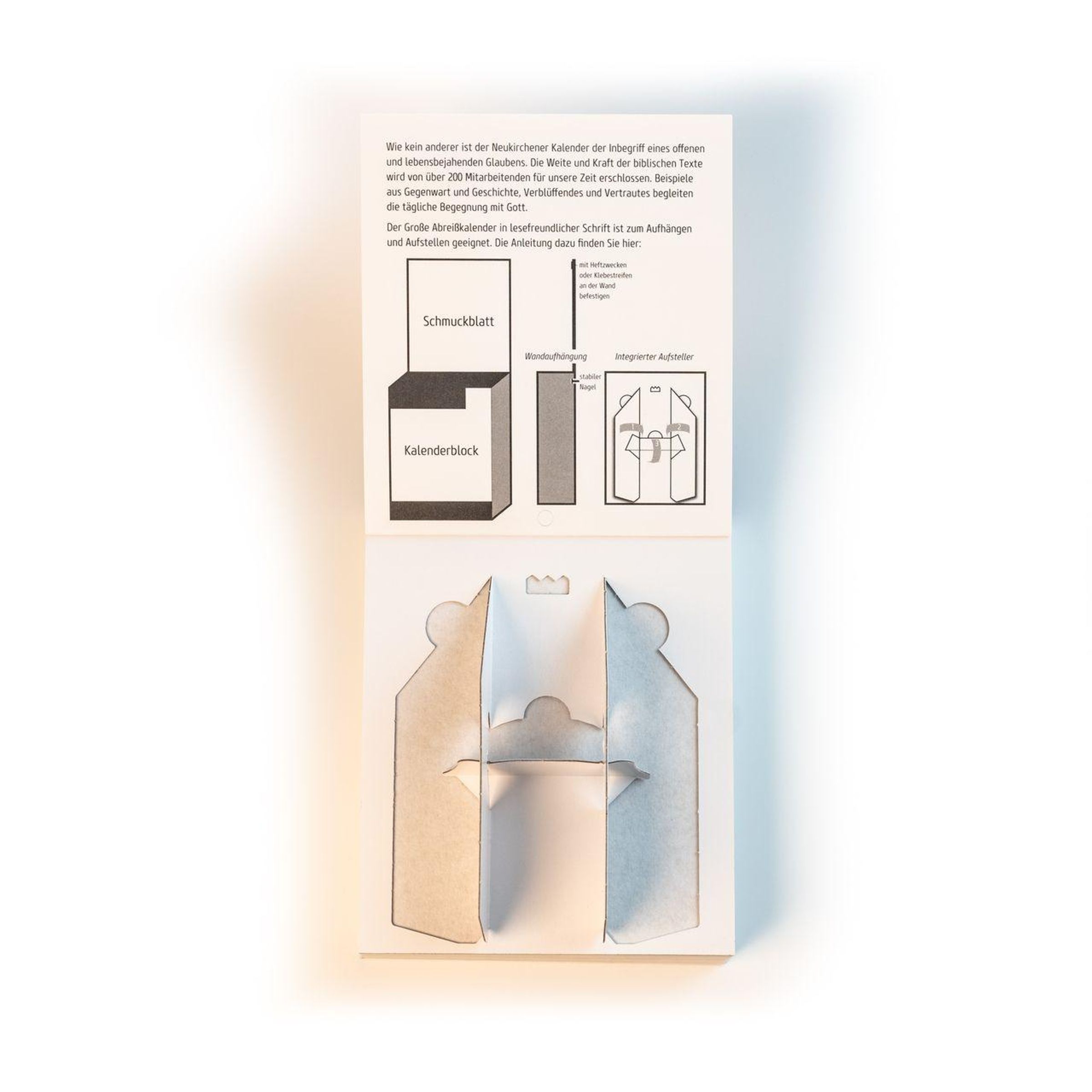 Mit integriertem Aufsteller zum Hinstellen und zusätzlichem Schmuckblatt zum Aufhängen kann der Große Abreißkalender vielfältig eingesetzt werden. Seine größere Schrift macht ihn dabei besonders gut lesbar. Der großzügige Satz und die übersichtliche Aufteilung tun Augen und Seele gut.