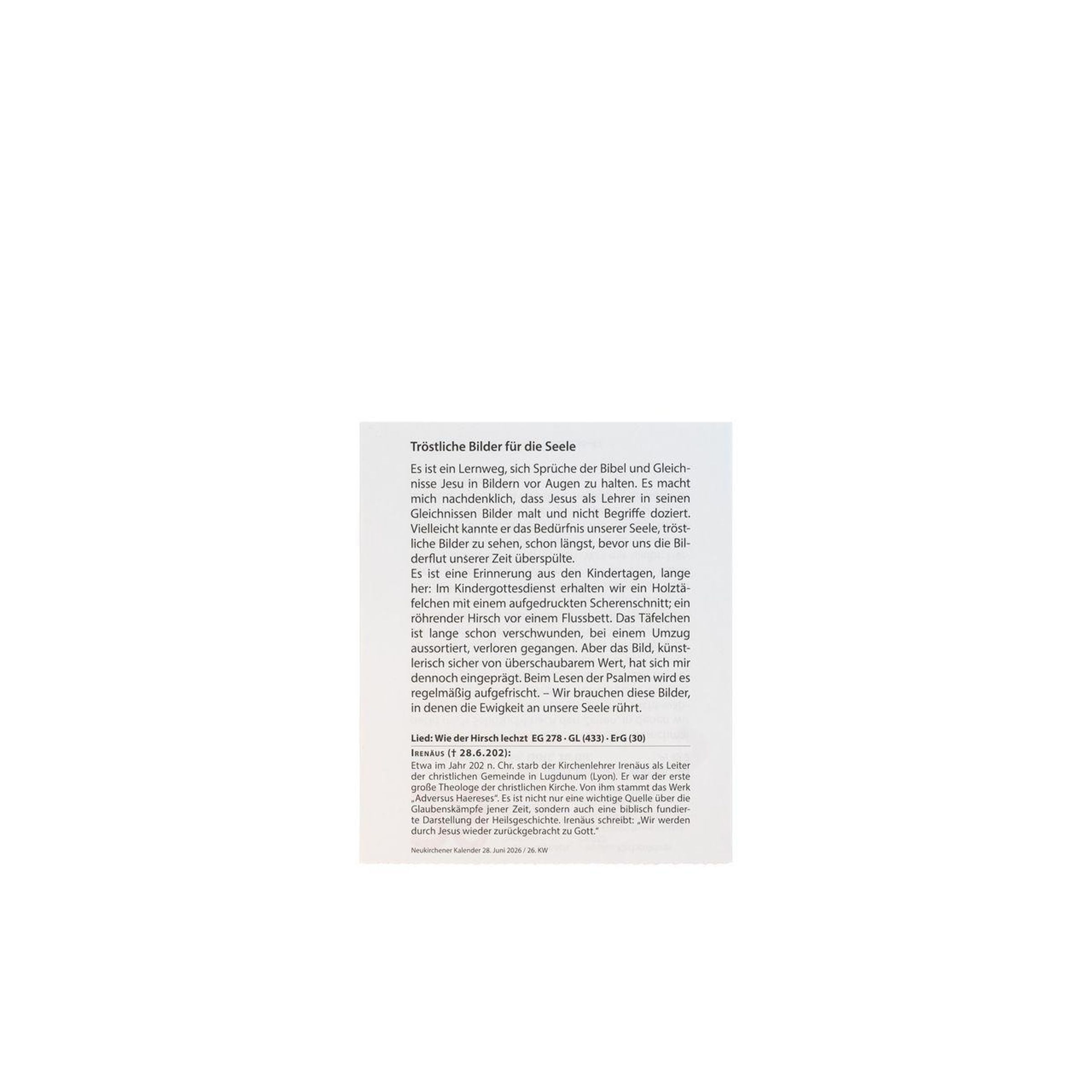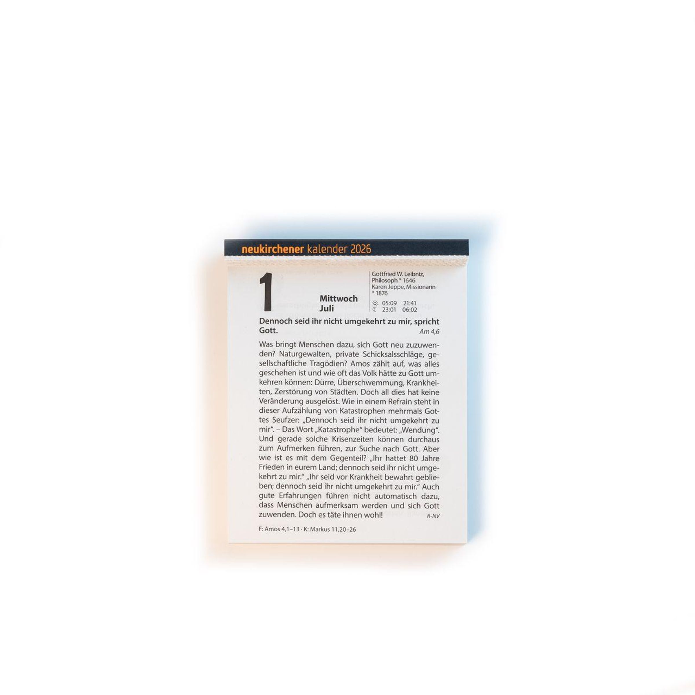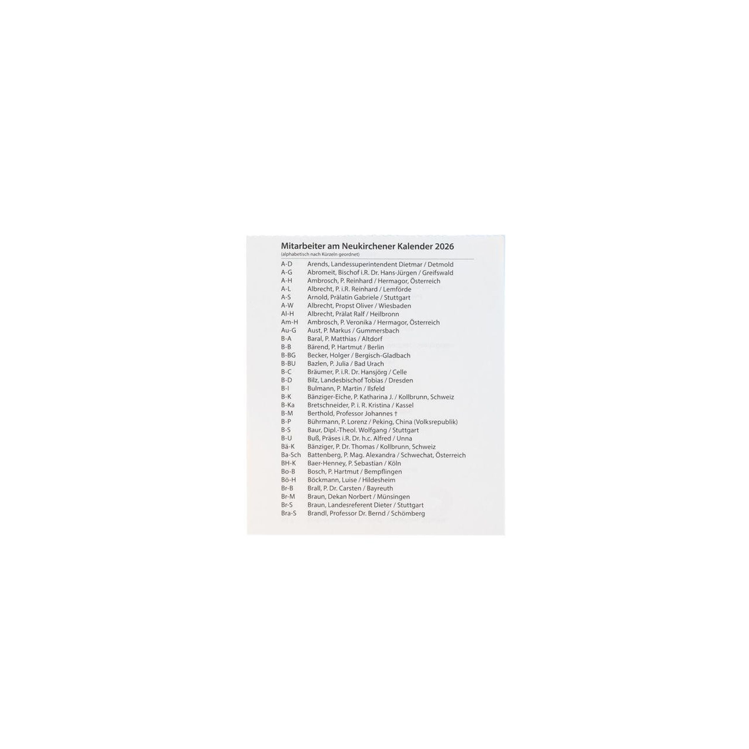 Der Neukirchener Kalender ist für viele Bibelleserinnen und -leser ein unverzichtbarer Impuls für den Tag! Über 200 Mitarbeitende aus fünf Ländern und verschiedenen christlichen Kirchen sorgen dafür, dass dieser traditionsreiche Andachts- und Bibellesekalender für einen offenen und lebensnahen Glauben steht. Besonders machen ihn seine beiden täglichen Texte: Im ersten wird der Bibeltext des Ökumenischen Bibelleseplans erschlossen und im zweiten mit einer alltagsnahen Erzählung, einem Impuls oder einem Gebet veranschaulicht. Ergänzt werden die Texte mit Liedvorschlägen, Jahrestagen besonderer Persönlichkeiten, den beliebten Buchtipps, und den Monatssprüchen.