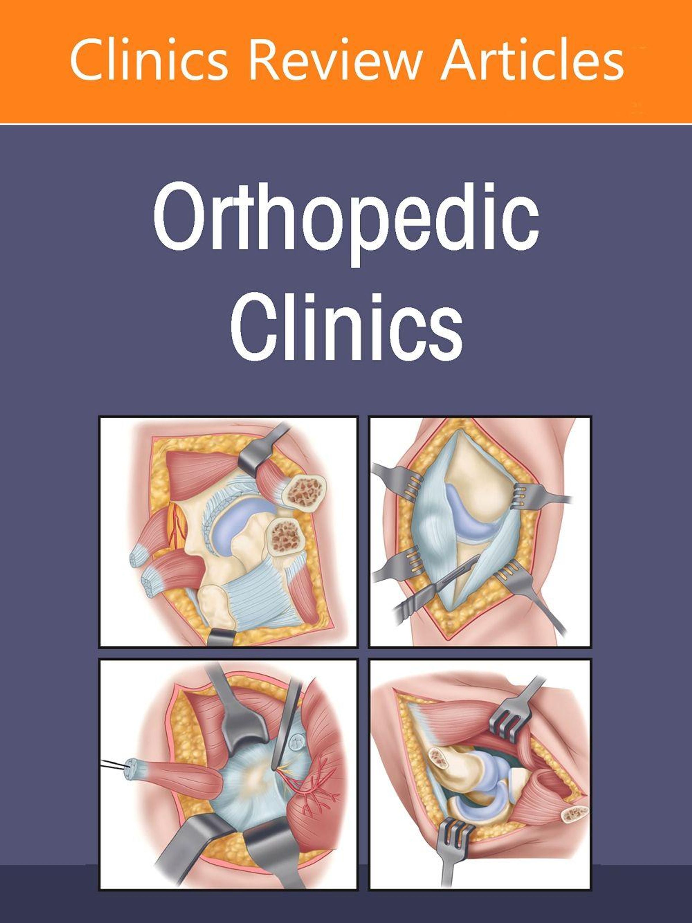 "Orthopedic Clinics" oben. Vier Illustrationen chirurgischer Eingriffe am Knie, zeigen Muskeln und Knochenstrukturen., Buch