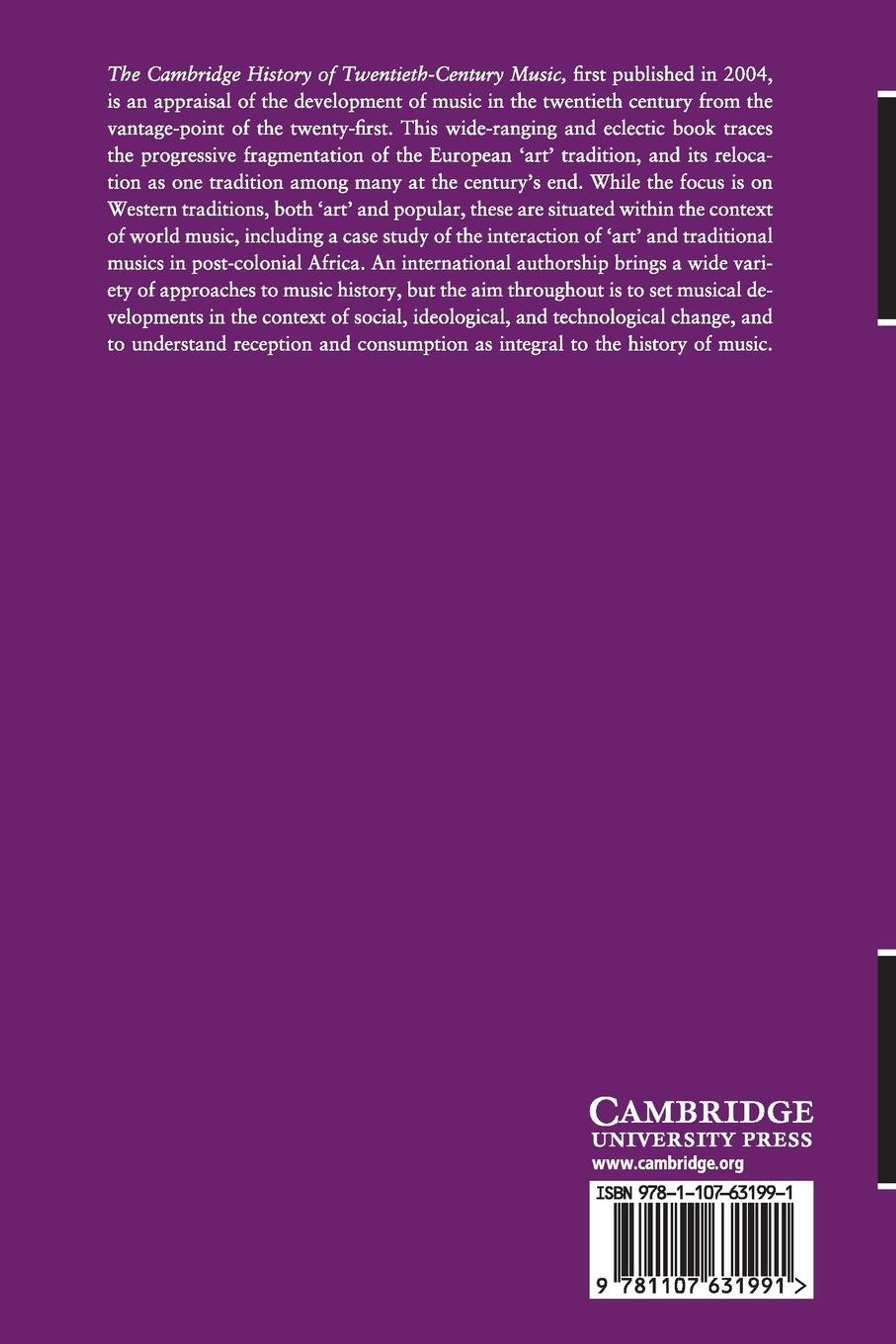 The Cambridge History of Twentieth-Century Music, first published in 2004, is an appraisal of the development of music in the twentieth century from the vantage-point of the twenty-first. This wide-ranging and eclectic book traces the progressive fragmentation of the European 'art' tradition, and its relocation as one tradition among many at the century's end. While the focus is on Western traditions, both 'art' and popular, these are situated within the context of world music, including a case study of the interaction of 'art' and traditional musics in post-colonial Africa. An international authorship brings a wide variety of approaches to music history, but the aim throughout is to set musical developments in the context of social, ideological, and technological change, and to understand reception and consumption as integral to the history of music.