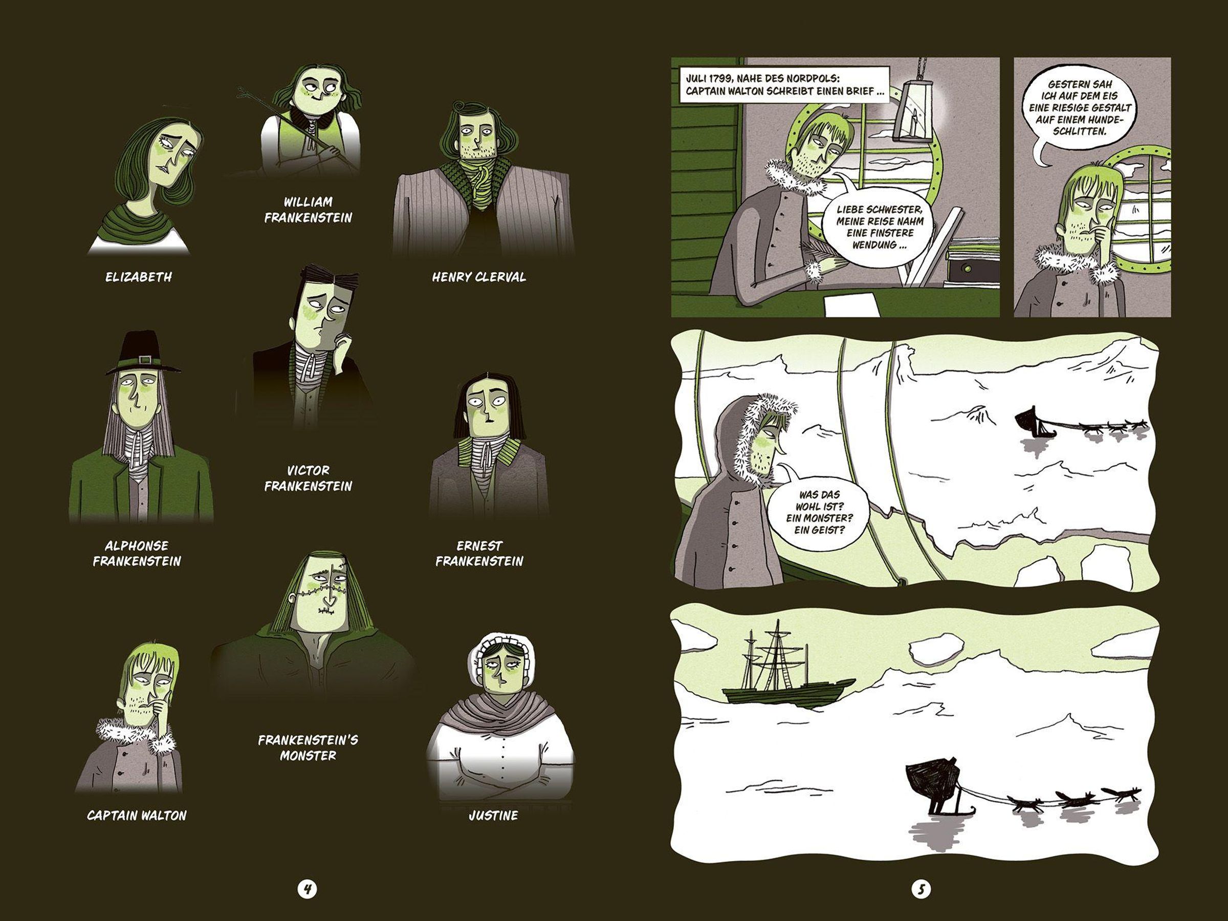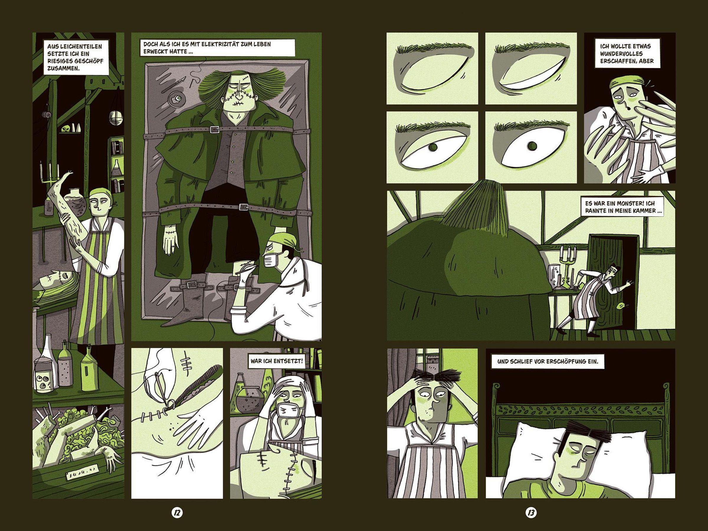 Victor Frankenstein träumt davon, das Geheimnis des Lebens zu entschlüsseln - und erschafft ein Wesen, das stärker ist als jeder Mensch. Doch als er seine Kreatur voller Entsetzen verstößt, beginnt eine verhängnisvolle Kette aus Einsamkeit, Wut und Rache, die bis ins ewige Eis führt. Diese moderne Graphic-Novel-Adaption von Mary Shelleys Klassiker erzählt die berühmte Geschichte atmosphärisch und kindgerecht neu. Ausdrucksstarke, stimmungsvolle Illustrationen und klar strukturierte Bildfolgen mit Sprechblasen machen den Stoff auch für jüngere Leserinnen und Leser zugänglich. Ein informativer Anhang mit Hintergründen zu Autorin, Entstehungszeit und zentralen Themen rundet diese packende Einführung in den literarischen Horror ab.
