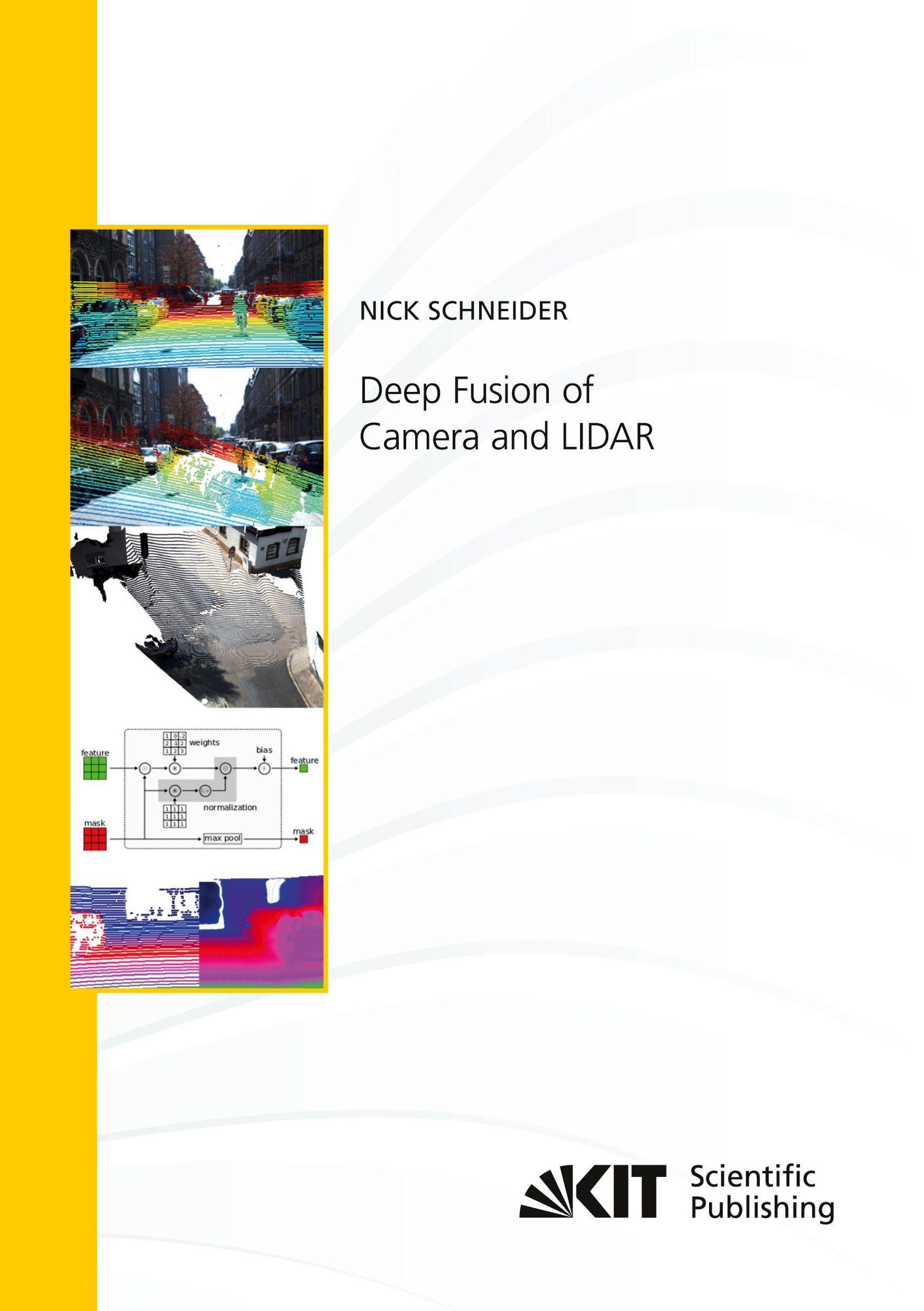 "NICK SCHNEIDER. Deep Fusion of Camera and LIDAR." Links: bunte Grafiken und Diagramme. Rechts: KIT-Logo unten., Buch