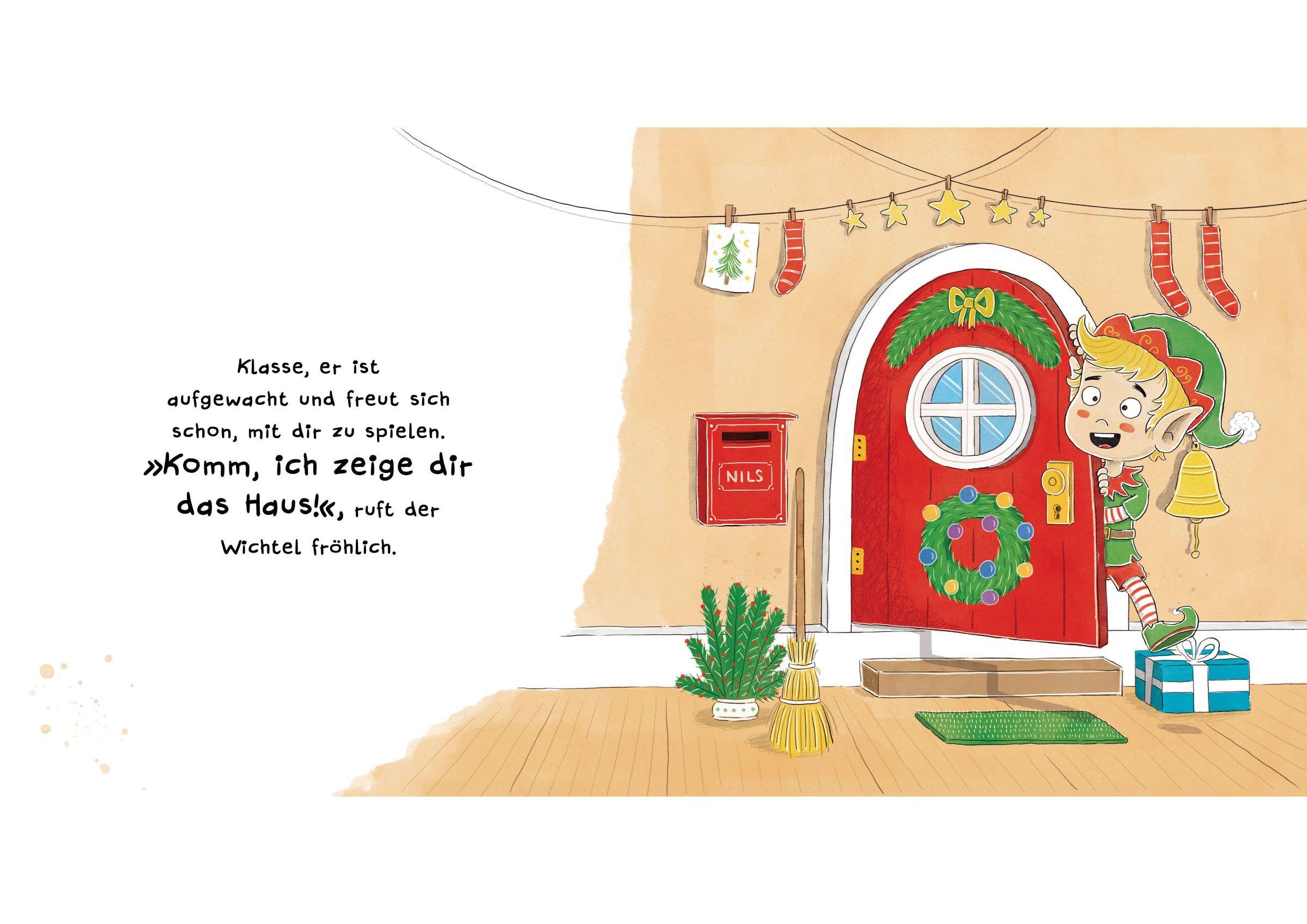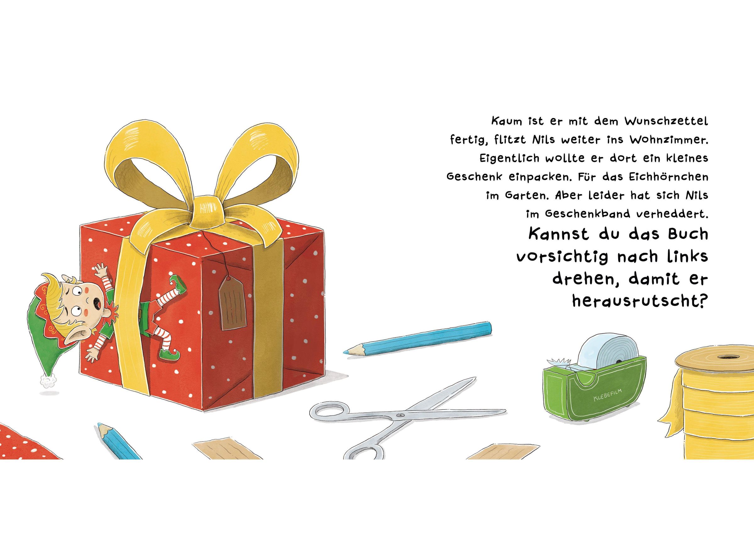 Wie schön! Es weihnachtet und die Wichtel ziehen wieder in die Häuser der Menschen ein. Auch der kleine Weihnachtswichtel Nils liebt es, sich an den Vorbereitungen zum Fest zu beteiligen. Er darf auf keinen Fall verschlafen, denn er hat noch so viel vor: Der Hausmaus die Füße kitzeln, den Wunschzettel eines Kindes verschönern oder dem Eichhörnchen ein Geschenk einpacken. Um alles zu schaffen und dem einen oder anderen Missgeschick zu entgehen, braucht er tatkräftige Hilfe. Und so können Kinder ab 2 Jahren hier selbst aktiv werden: Sie dürfen das Buch schütteln, bepusten, drehen oder von ihrem Lieblingsweihnachtsessen erzählen, je nachdem, was die kleine Geschichte verlangt. Ein Buch voller Überraschungen für jede Menge Spiel, Spaß und Spannung in der schönsten Zeit des Jahres.