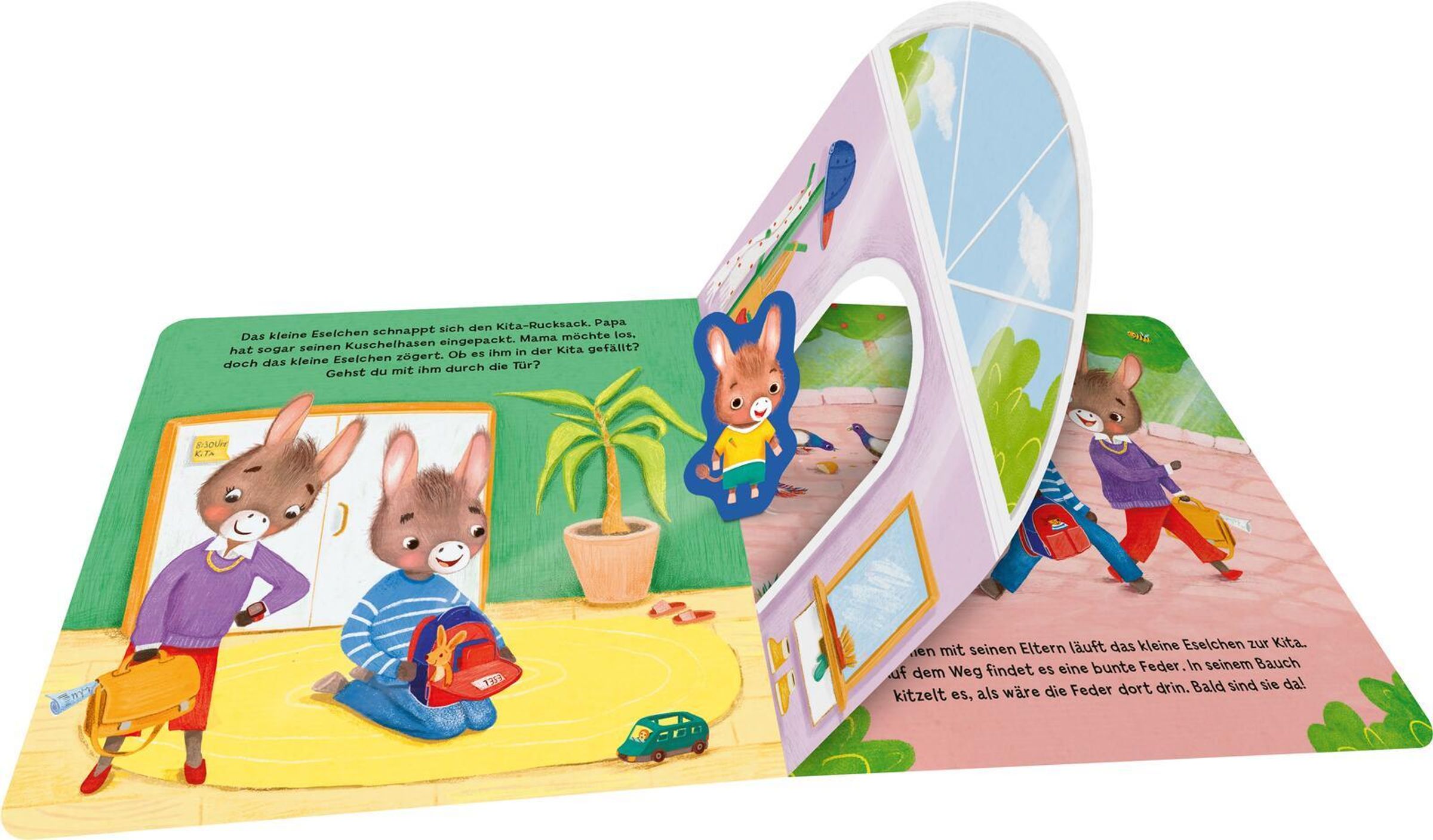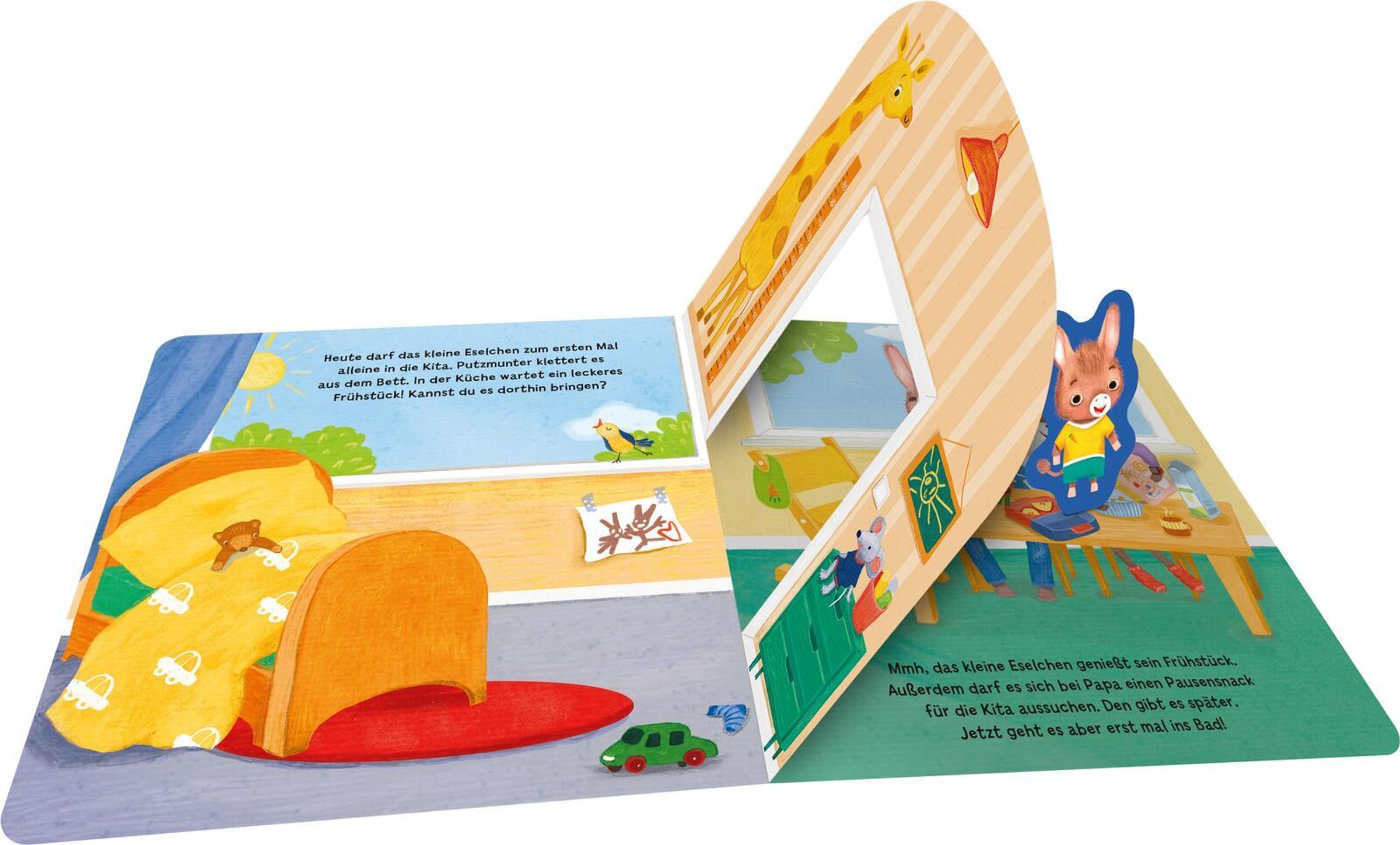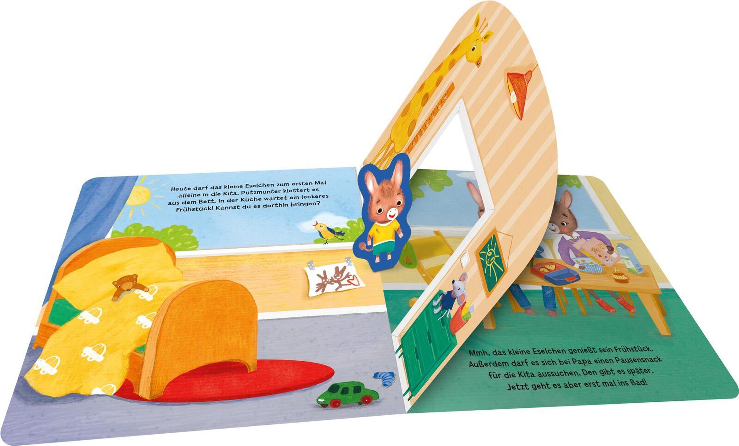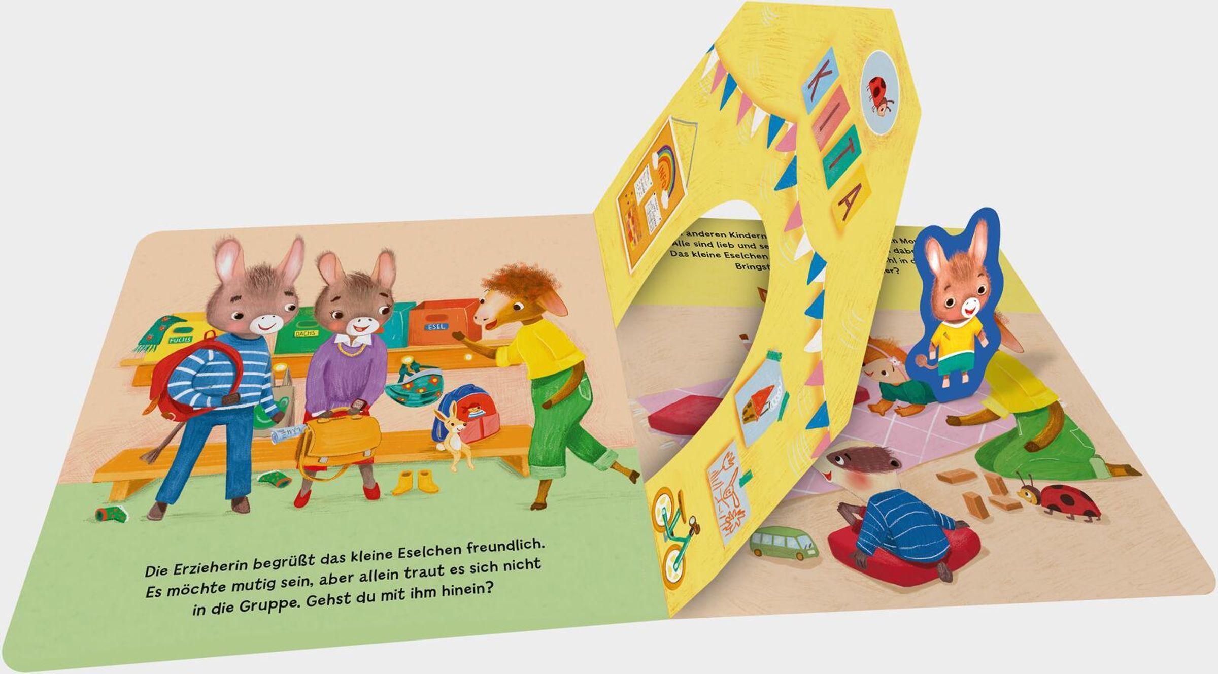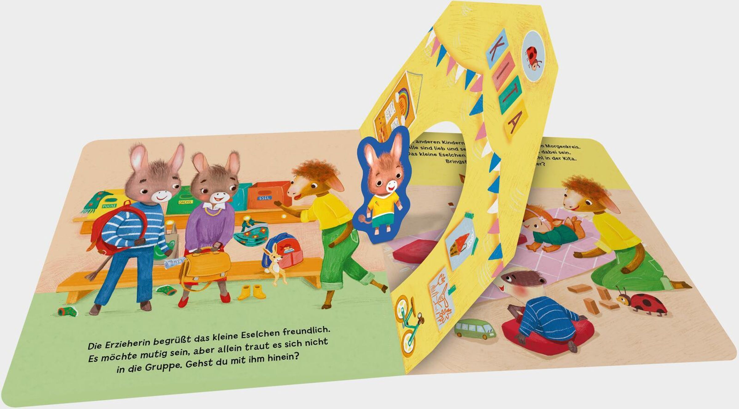 Endlich Kitakind! Der kleine Esel kann es kaum erwarten. Klar, dass Mama und Papa ihn an seinem großen Tag begleiten. Auch die Allerkleinsten ab 18 Monaten helfen mit. Sie bringen ihn ins Bad, zum Anziehen und Frühstücken. Und sie dürfen für den kleinen Esel mutig sein, wenn er sich doch noch nicht allein in den Morgenkreis traut.