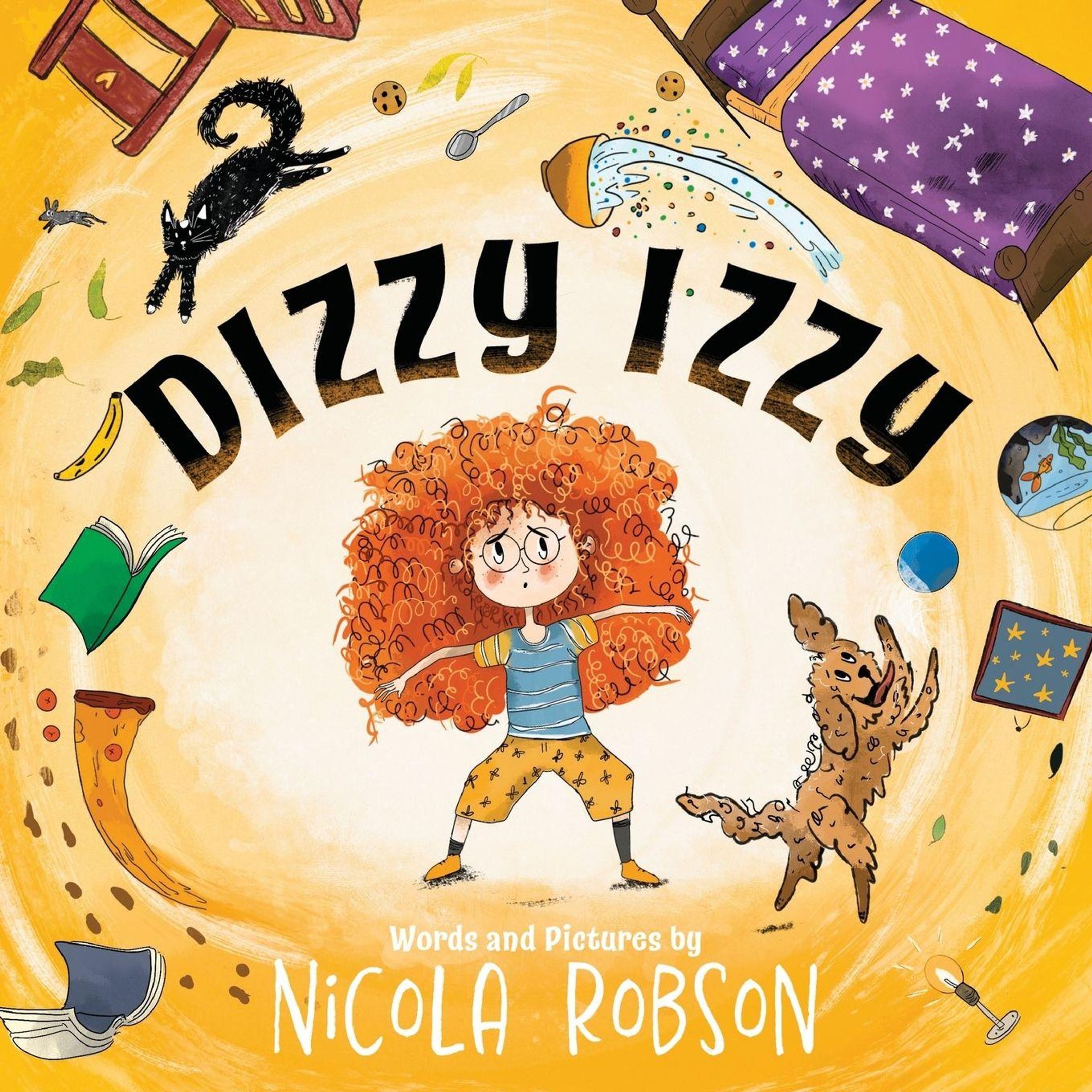 "Dizzy Izzy", Worte und Bilder von Nicola Robson. Illustration: Kind mit lockigem Haar, umgeben von Chaos und Objekten., Buch