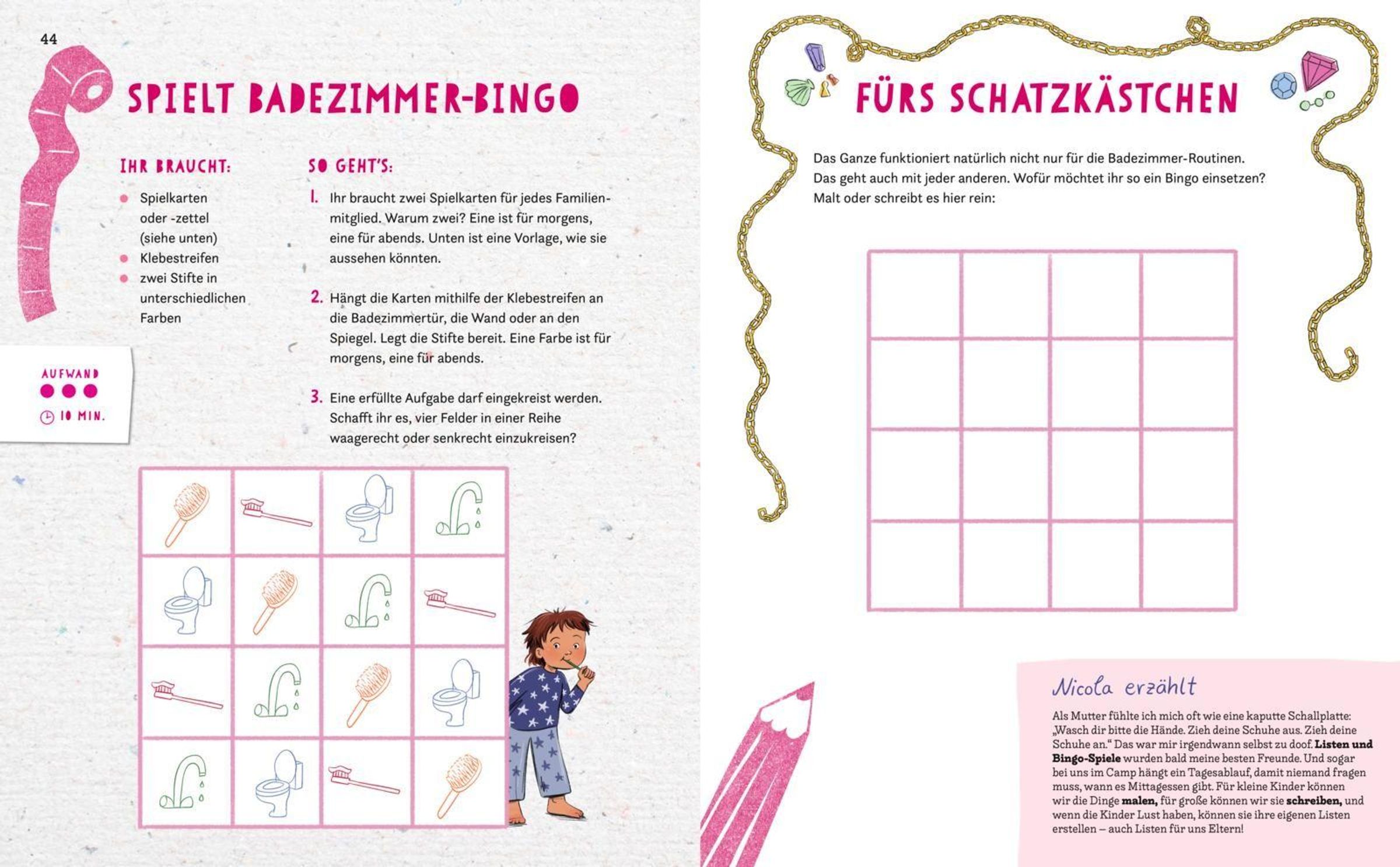Zähneputzen ist öde? Gemüse essen auch? Und warum müssen wir eigentlich immer raus, wenn die Großen das wollen? In diesem Buch steckt jede Menge Spaß: Spielt Badezimmer-Bingo, baut Gemüsetürme, werdet draußen zu Forscherinnen und Schatzsucherinnen - im Wald, im Park oder direkt vor eurer Haustür!