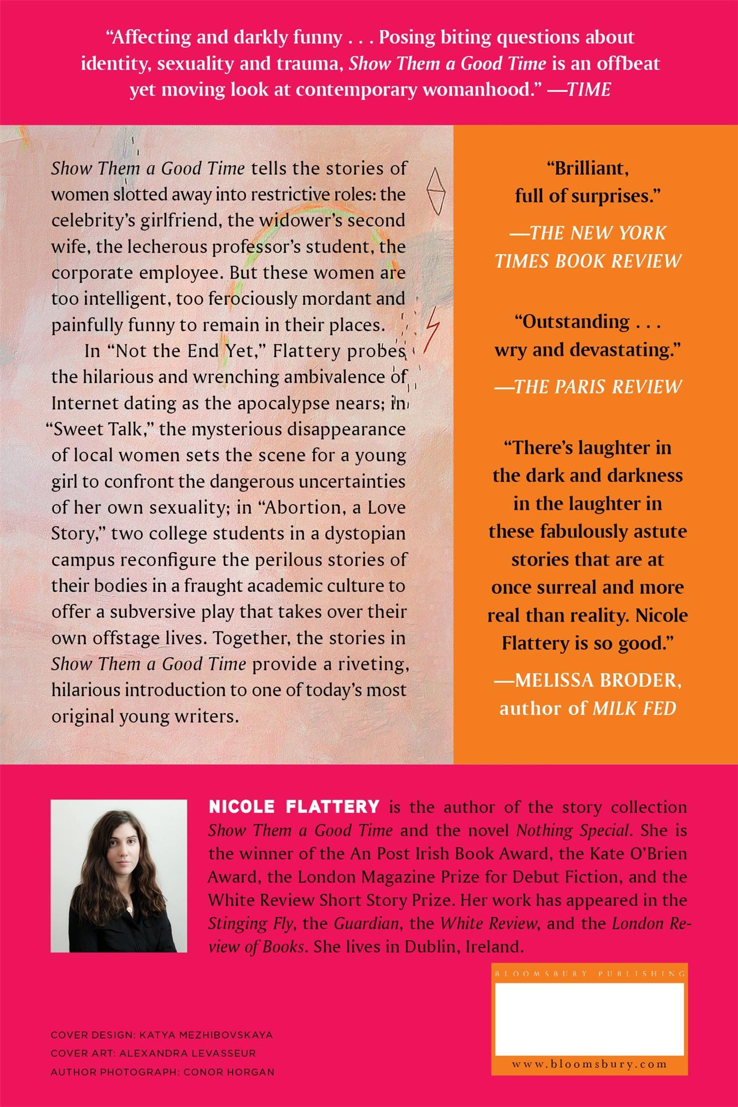 In "Not the End Yet," Flattery probes the hilarious and wrenching ambivalence of Internet dating as the apocalypse nears; in "Sweet Talk," the mysterious disappearance of local women sets the scene for a young girl to confront the dangerous uncertainties of her own sexuality; in "Abortion, A Love Story," two college students in a dystopian campus reconfigure the perilous stories of their bodies in a fraught academic culture to offer a subversive play that takes over their own offstage lives. Together, the stories in Show Them a Good Time provide a riveting, hilarious introduction to one of today's most original young writers.