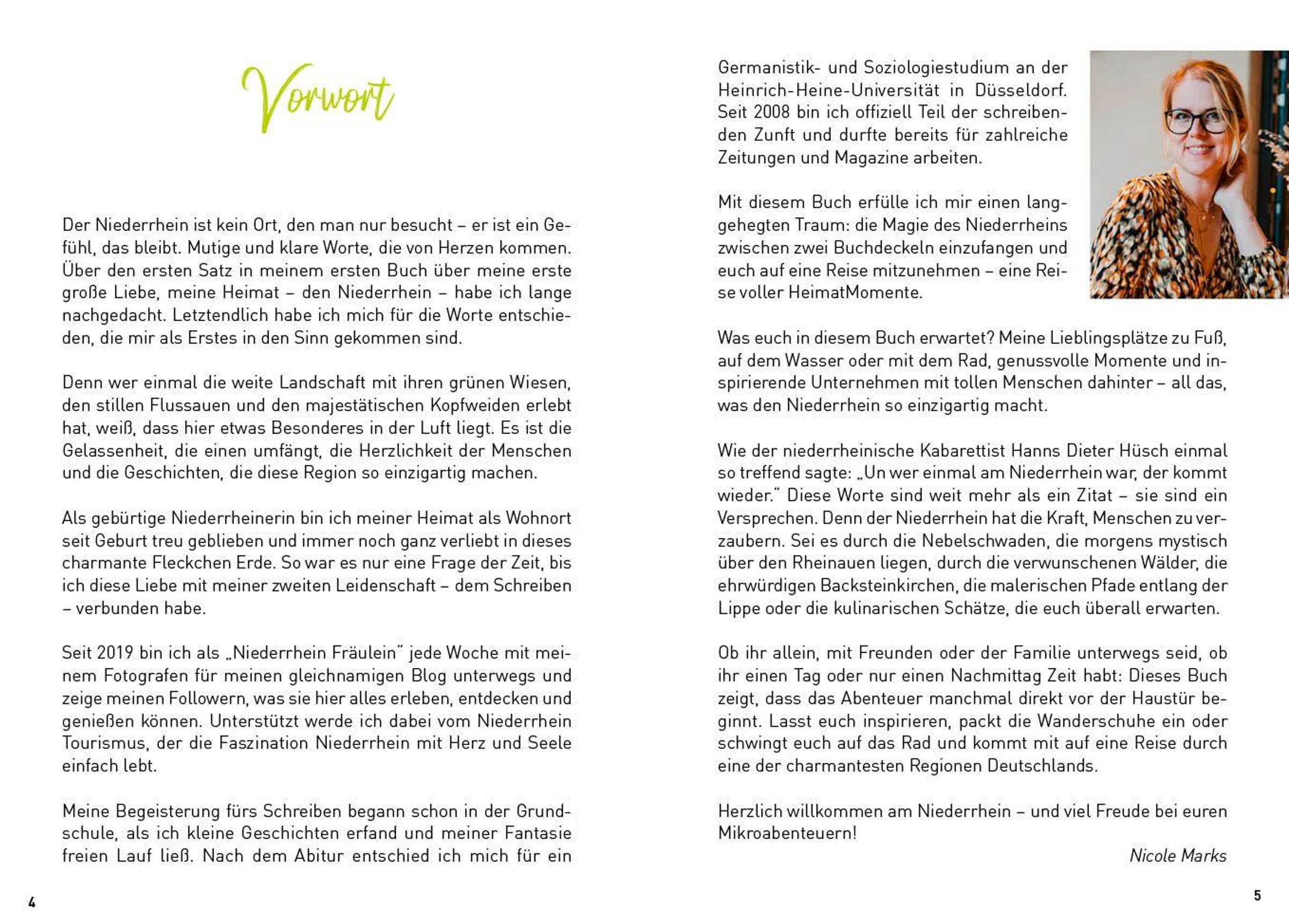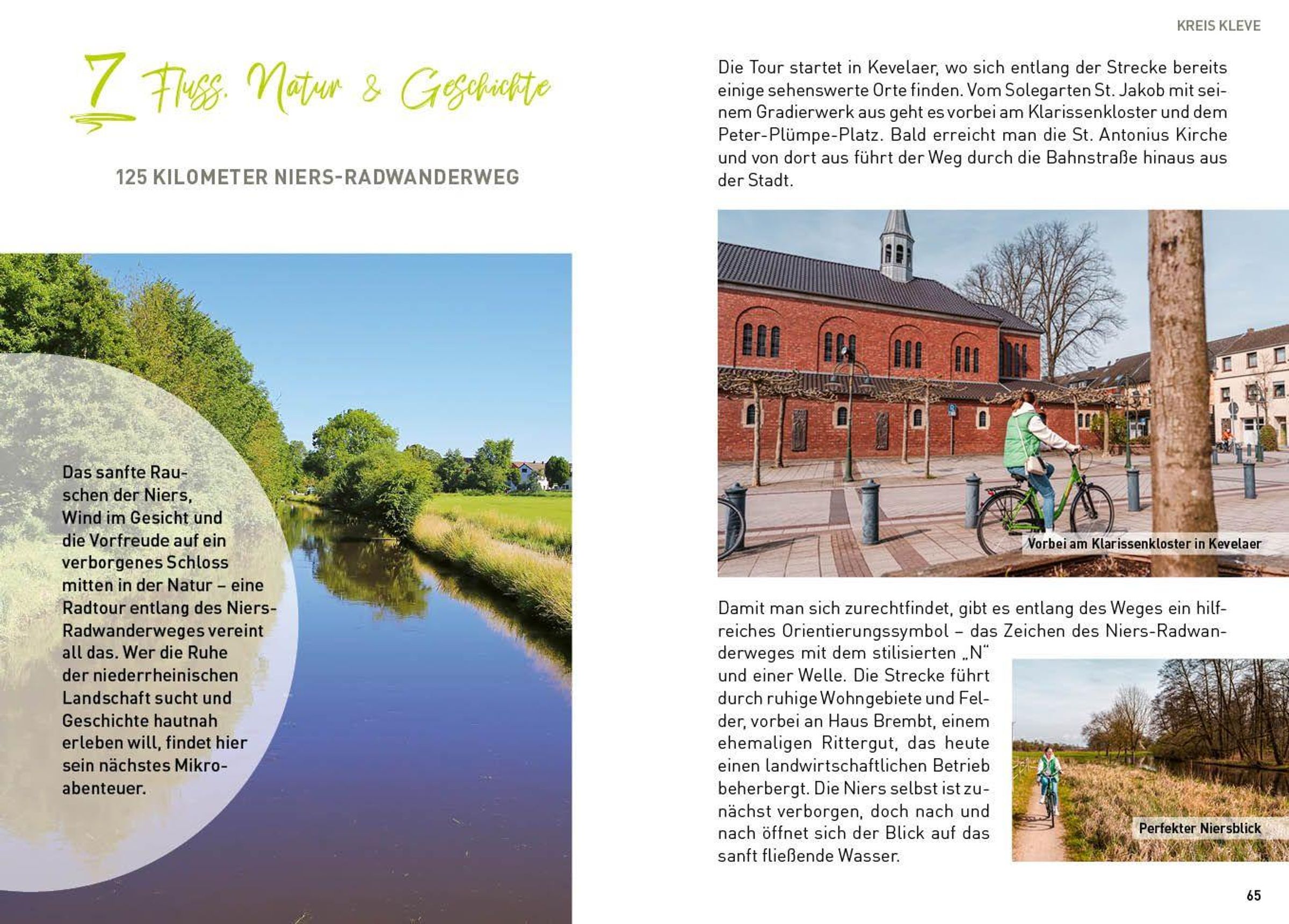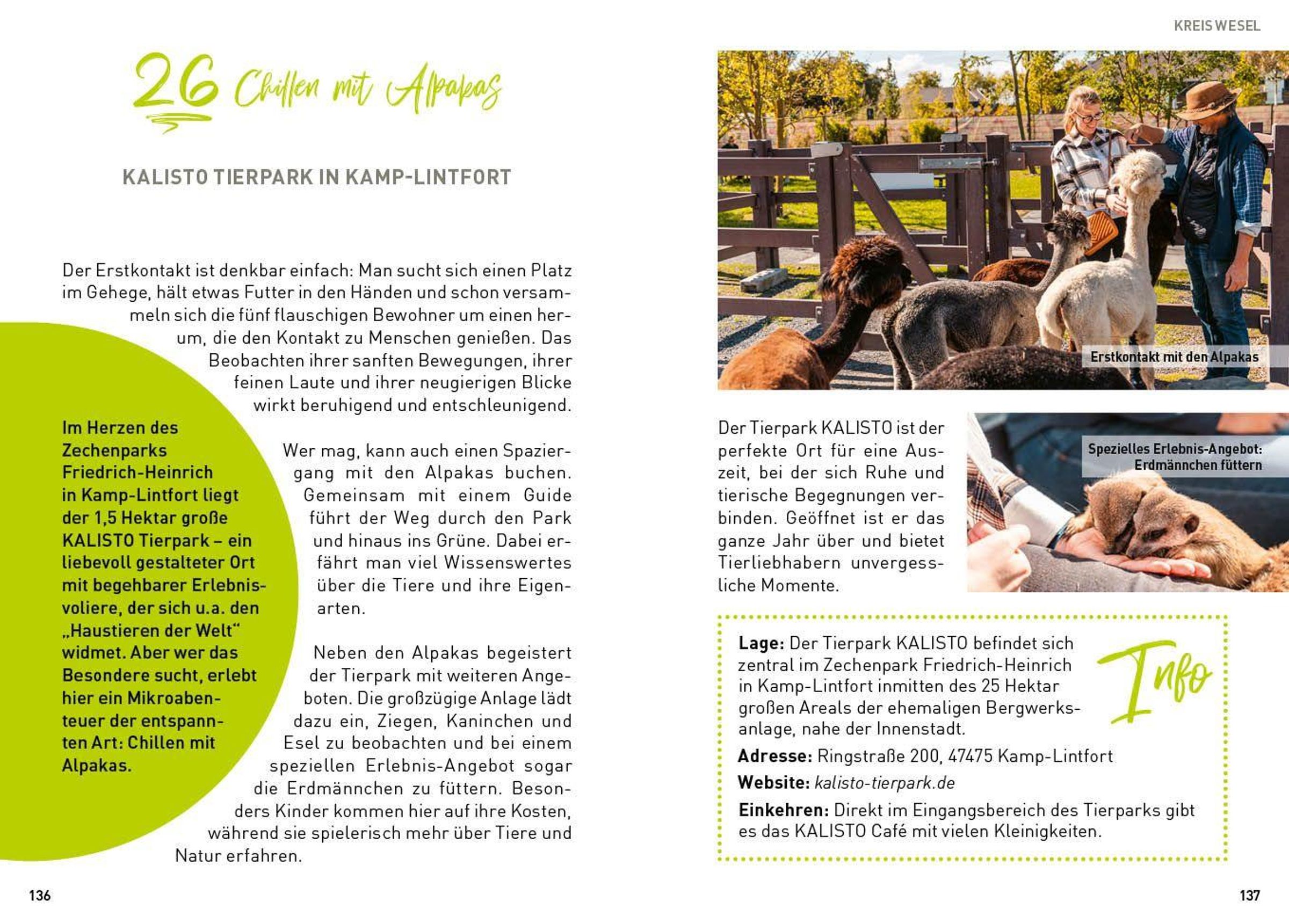 Die Autorin zeigt ihre Lieblingsorte, erzählt Geschichten von heimatverbundenen Menschen und öffnet die Tür zu kulturellen Schätzen, die Geschichte lebendig machen. Die Reise führt so zum beeindruckenden LVR-Archäologischen Park Xanten über den familienfreundlichen Schmugglerpfad in Straelen bis hin zu der außergewöhnlichen Augmented Reality-Radroute "Tim Berresheims Bilderreise" ab Wassenberg und dem erlebnisreichen Kletterwald Niederrhein in Nettetal. Oder wie wäre es mit ruhigeren Mikroabenteuern wie "Chillen mit Alpakas" im KALISTO Tierpark in Kamp-Lintfort? Jede Jahreszeit wird zur Bühne für neue Erlebnisse, jedes Kapitel zur Einladung, die eigene Heimat oder die Region neu zu entdecken.