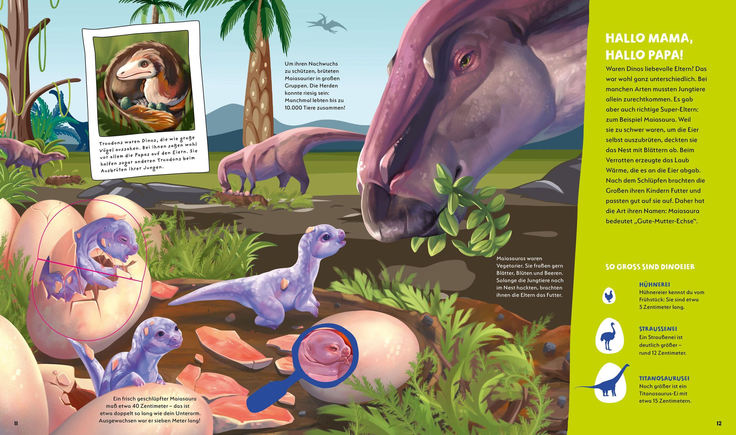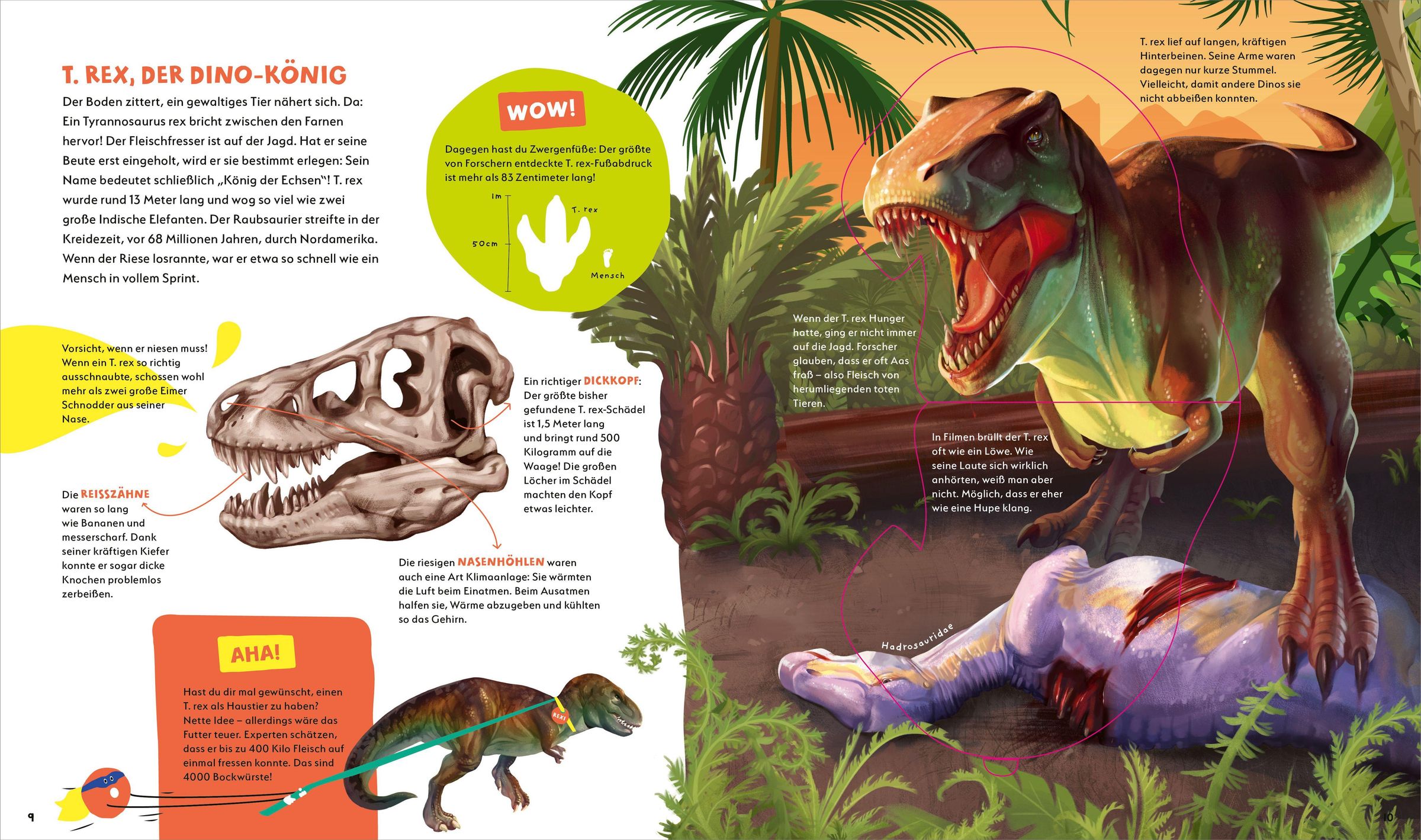 Wow, hier ist ganz schön was los! Ein Brachiosaurus rupft sich Blätter von den Bäumen, eine Maiasaurus-Mama kümmert sich um ihre Babys und der T. rex streift hungrig durch die Landschaft, auf der Suche nach der nächsten Beute. Die Zeit der Dinosaurier liegt weit zurück, aber wöchentlich graben Forschende neue Dino-Knochen aus, die uns Aufschluss über das Leben der gigantischen Tiere geben. Was verrät uns Dino-Kacke? Was wissen wir über das Aussterben der Dinos? Wie haben sie ihre Beute gejagt? Mit actionreichen Klappen, verblüffenden Illustrationen und vielen tollen weiteren Elementen zum Entdecken, reisen wir gemeinsam zurück in die Urzeit und folgen den Spuren der Dinosaurier. Ein spannendes Klappenbuch zum Lesen, Durchblättern, Vorlesen und Staunen für Kinder ab 4 Jahren.
