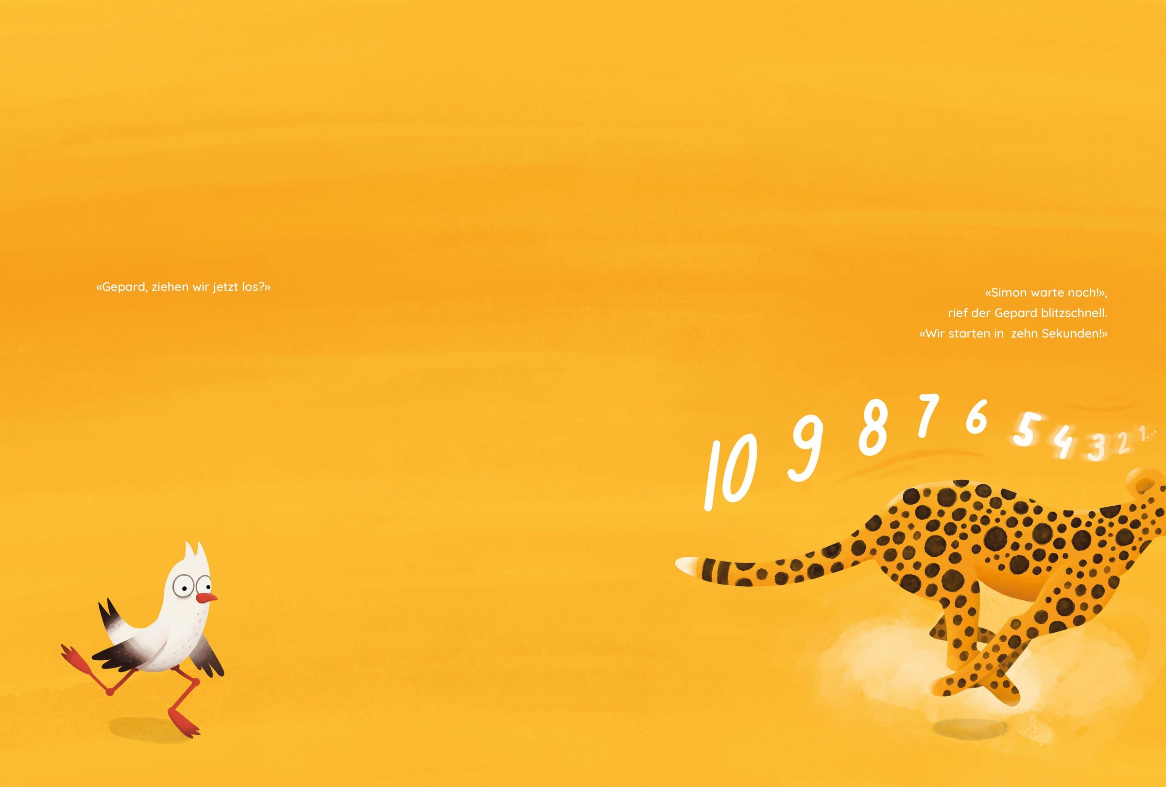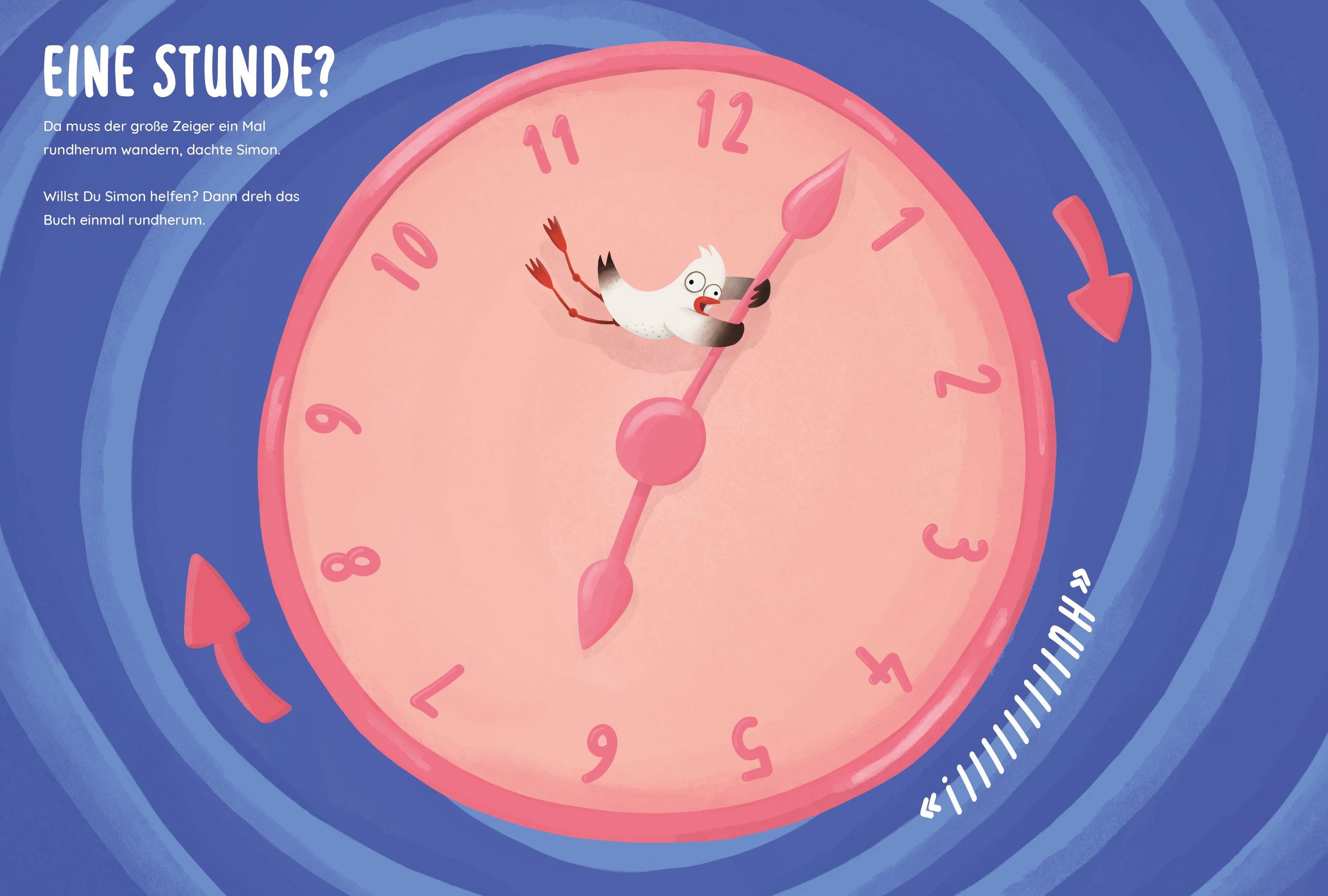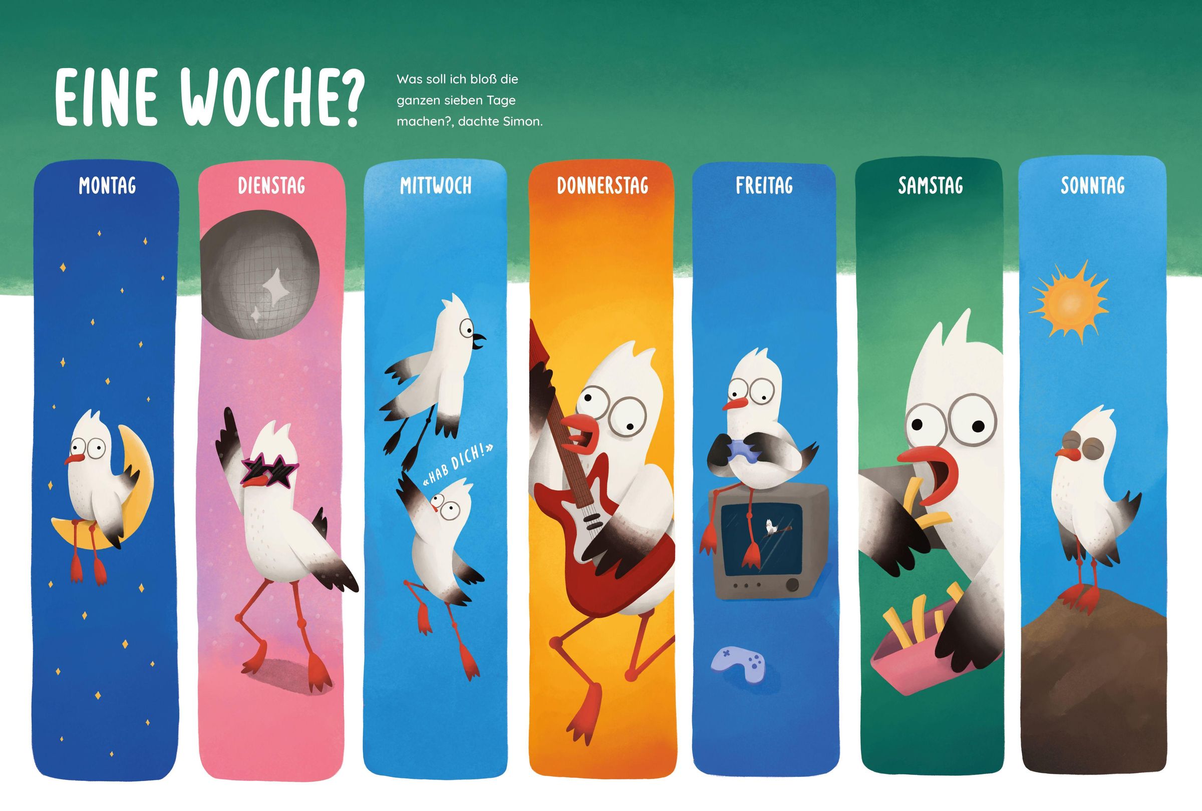„SIMON WARTE NOCH“. Eine Möwe sitzt auf einer Schnecke, zwei kleine Vögel fliegen daneben. Ein Logo unten., Buch
