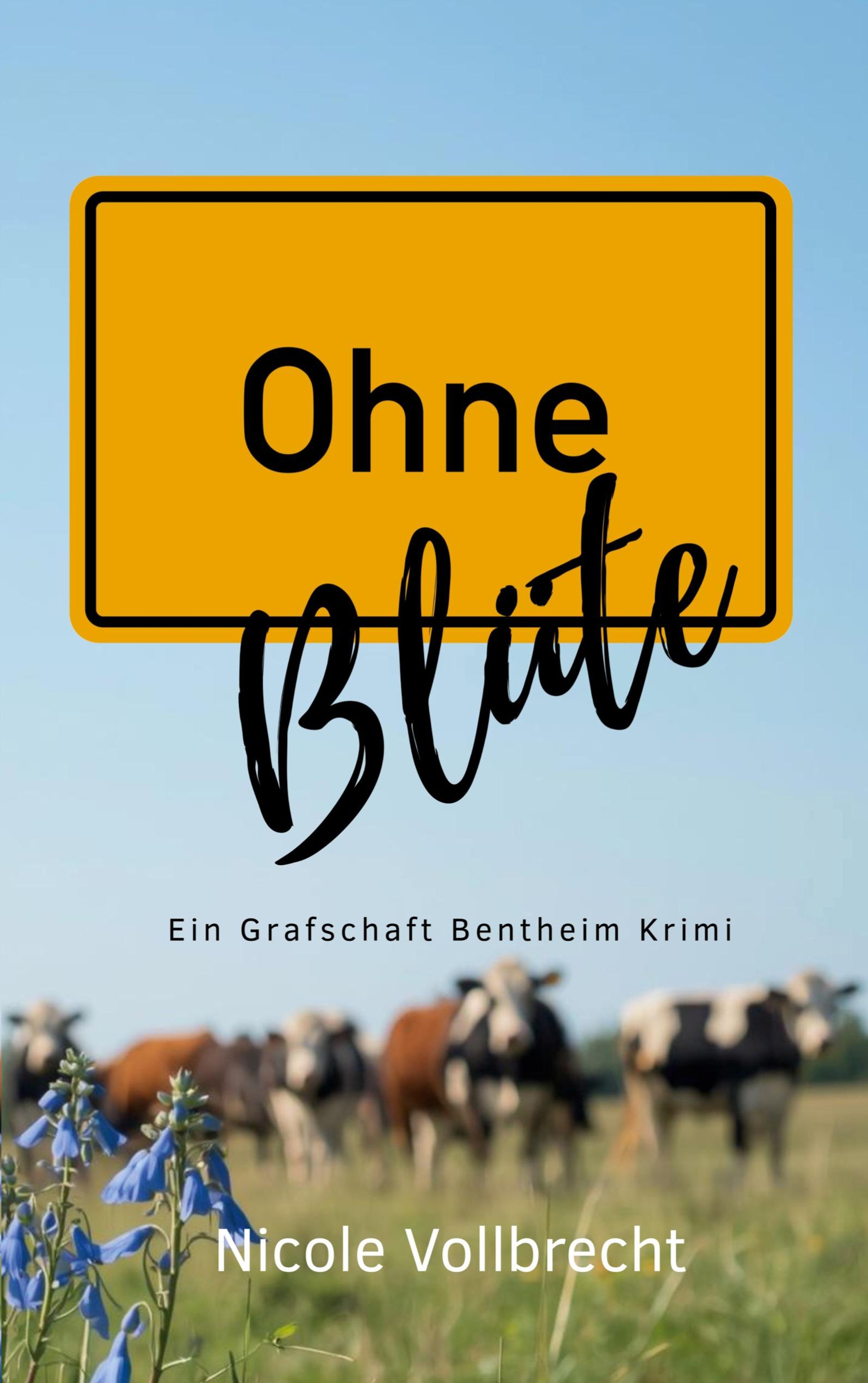 „Ohne Blüte“, „Ein Grafschaft Bentheim Krimi“, „Nicole Vollbrecht“. Blaue Blumen, Kühe und Wiese im Hintergrund., Buch