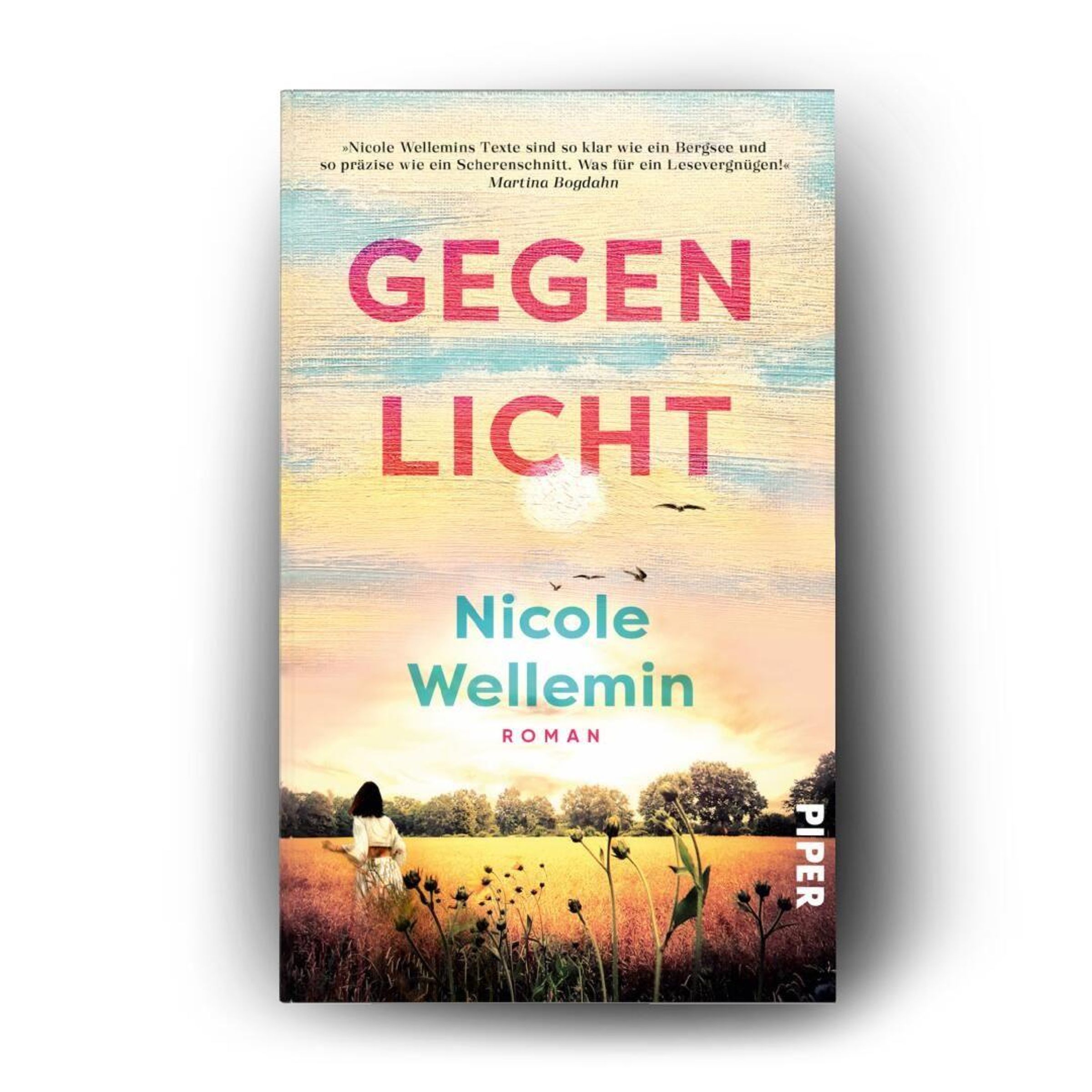"GEGEN LICHT", Nicole Wellemin, Roman. Eine Frau geht durch ein goldenes Kornfeld, im Hintergrund der Sonnenuntergang., Buch